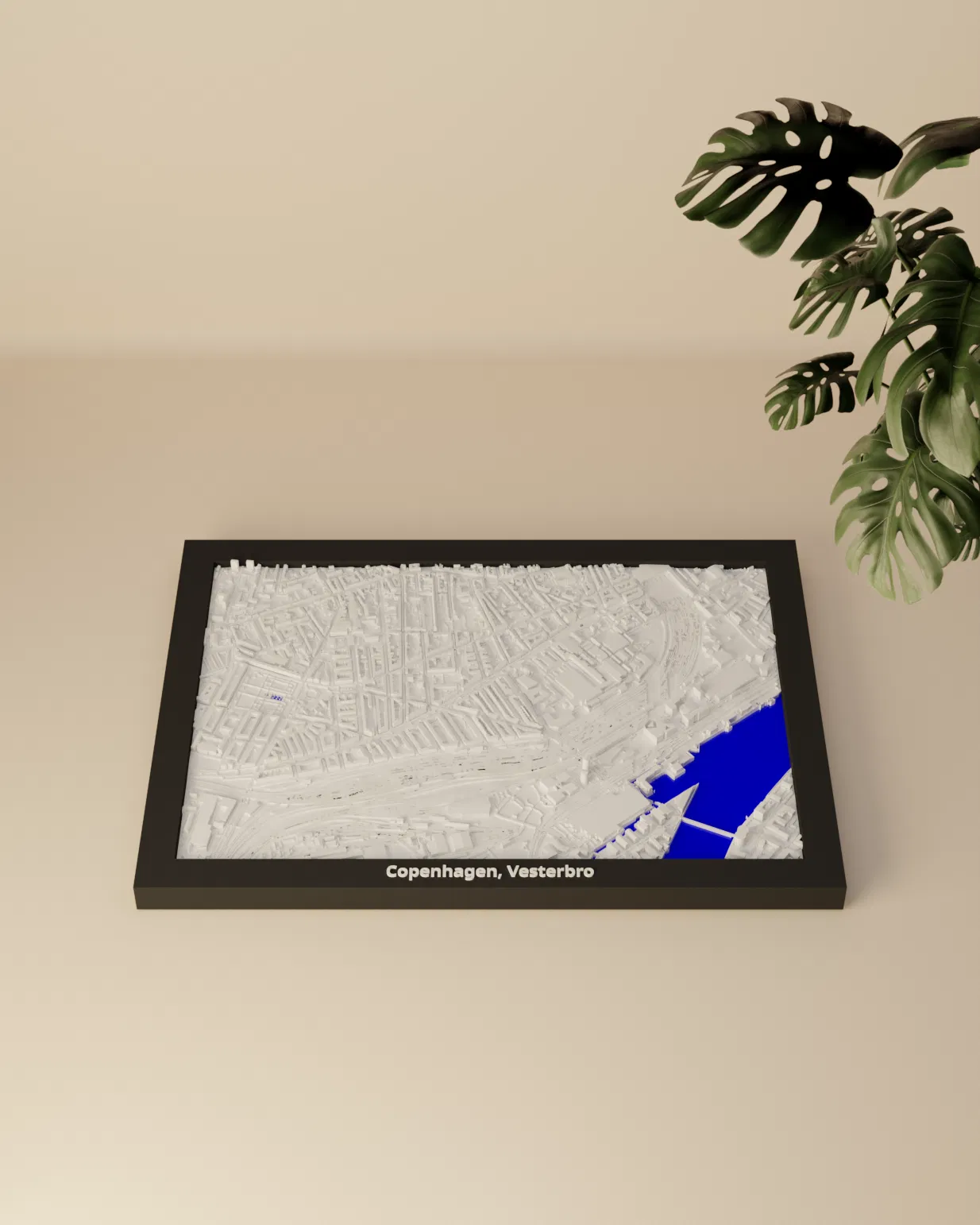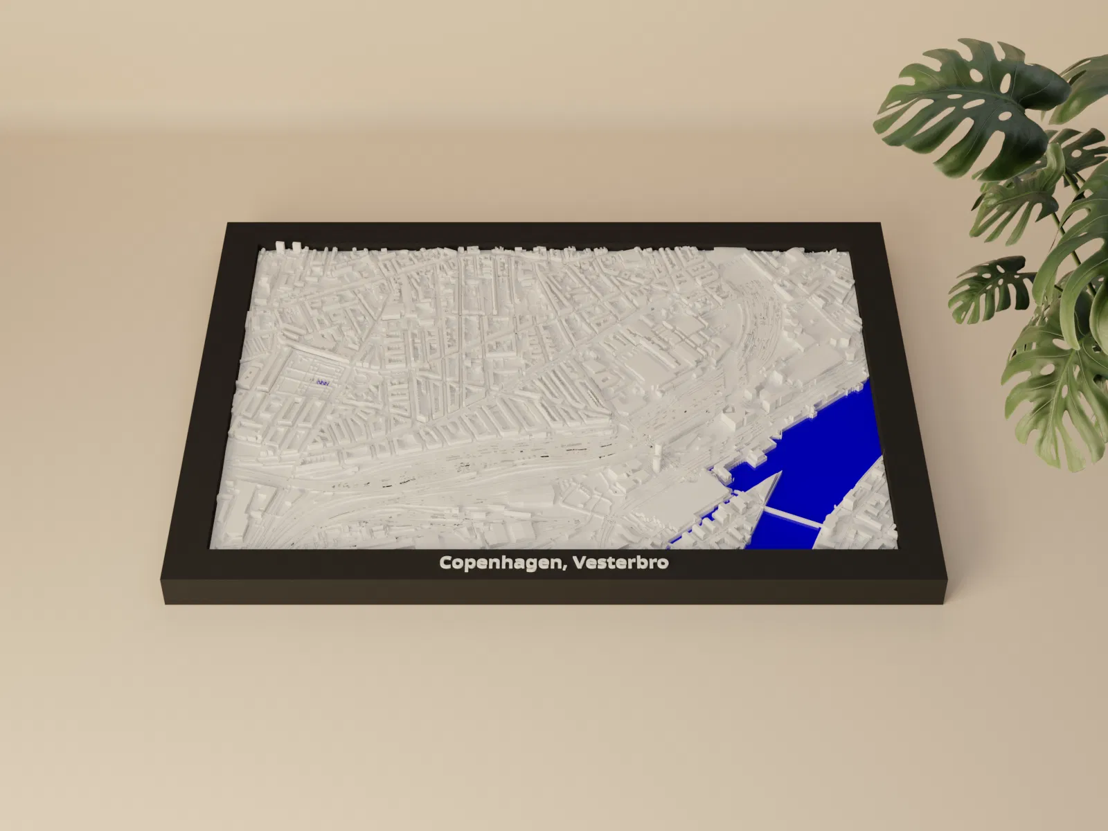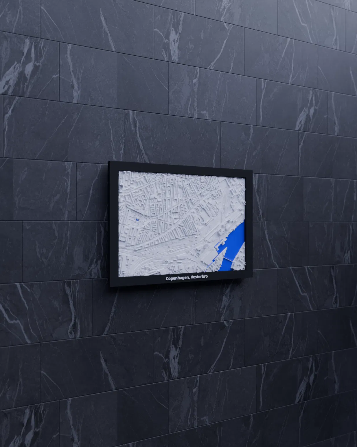 Mô hình mini địa hình (topographic) in 3D khu Copenhagen, Vesterbro, Đan Mạch, dựng từ dữ liệu địa lý. Thu nhỏ từ 2.068 x 1.446 km xuống 170.5 x 119.5 mm, kèm nhiều lựa chọn frame và hướng dẫn lắp ráp.