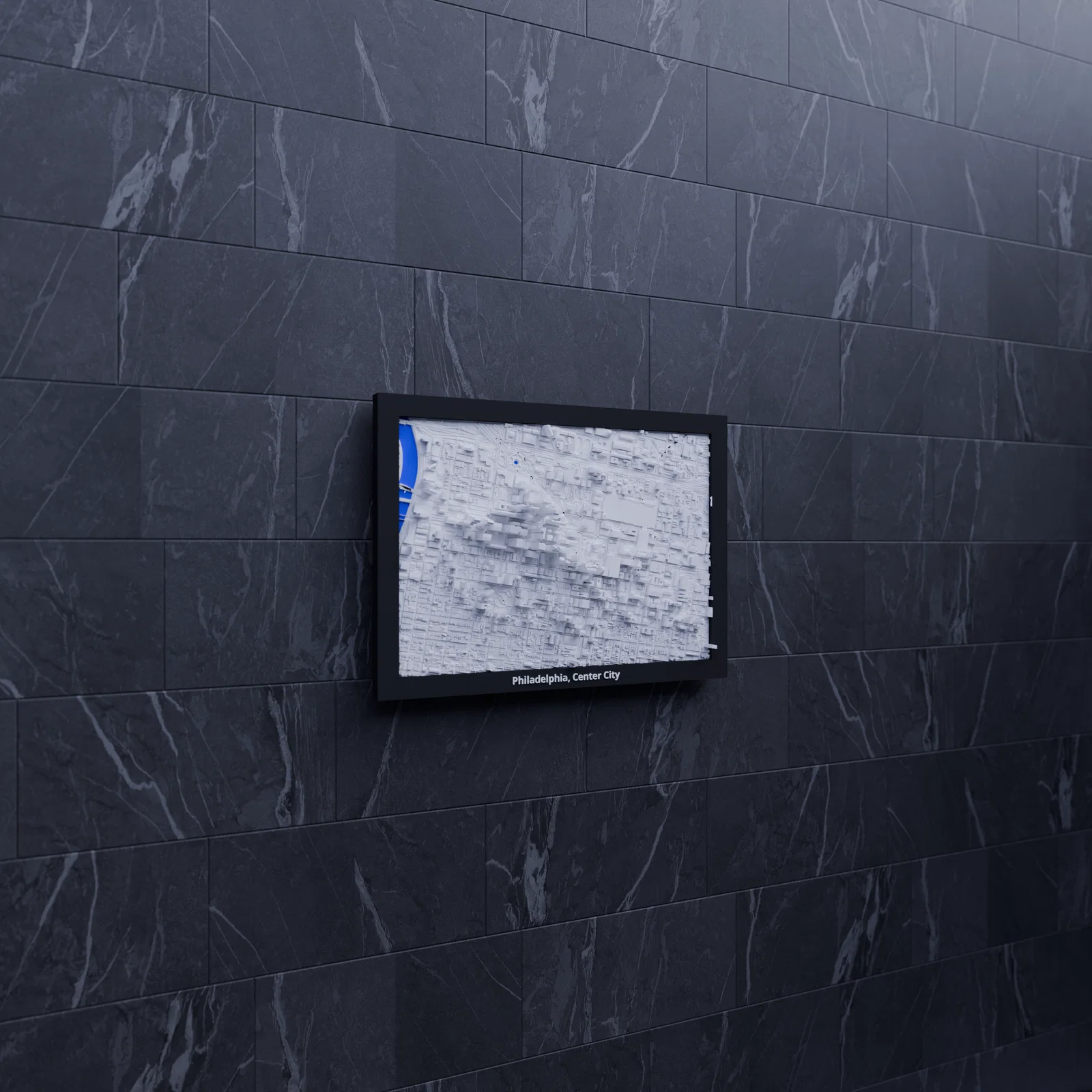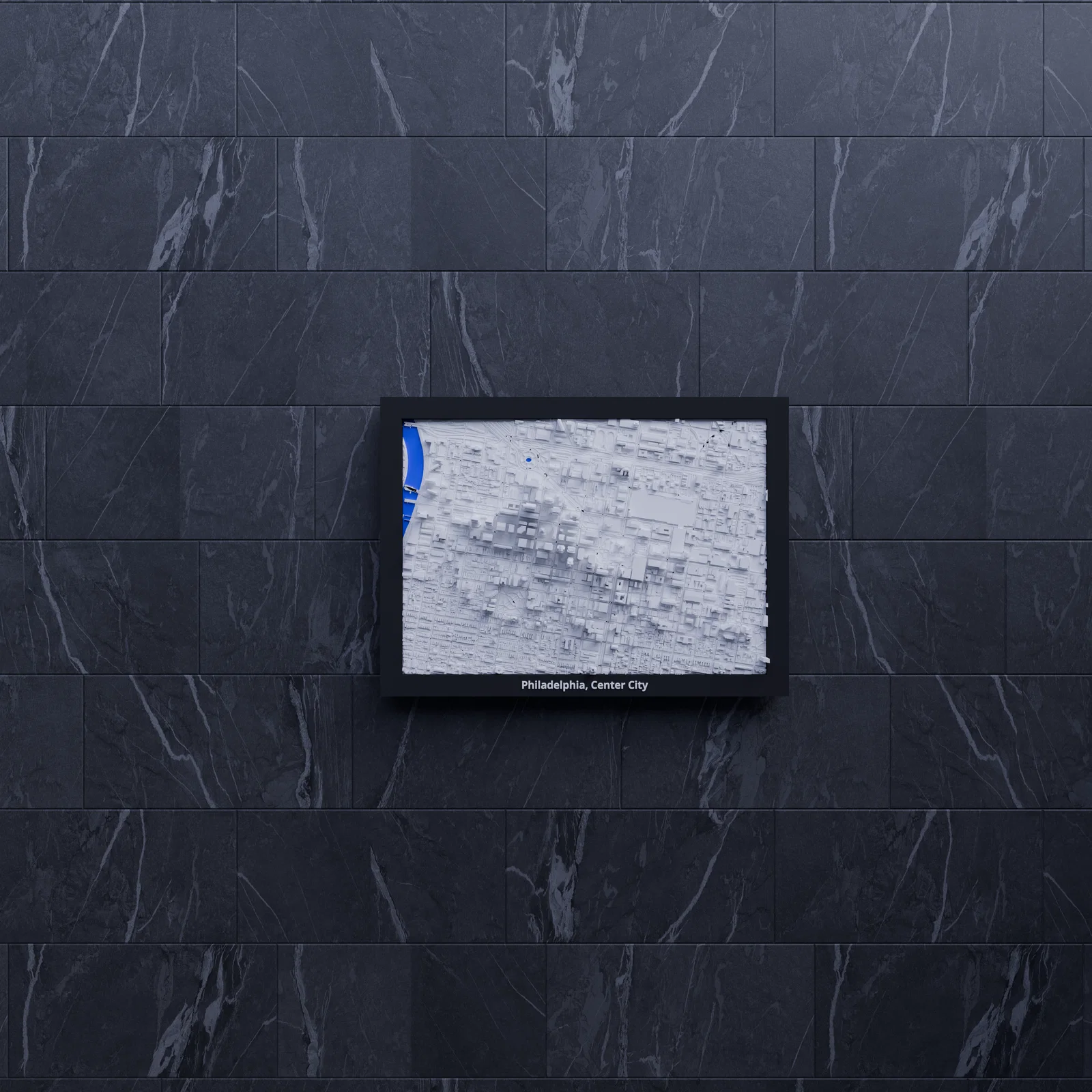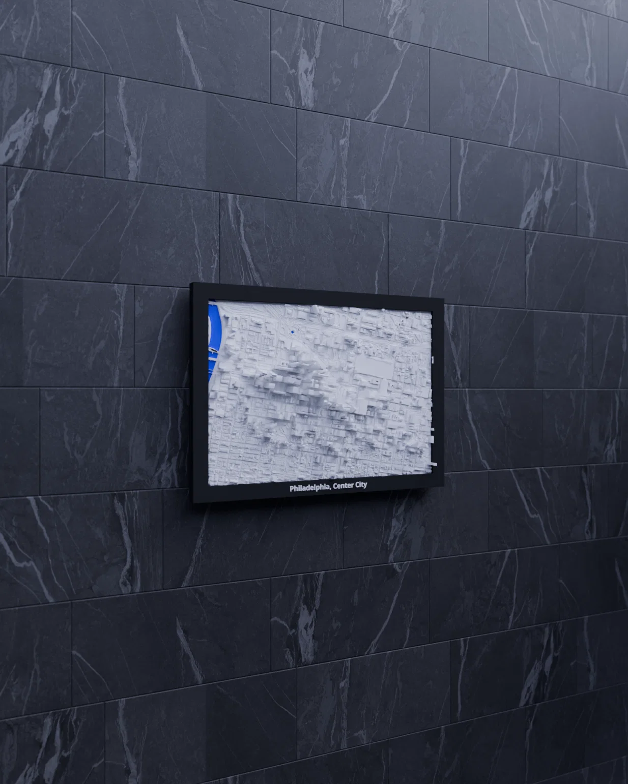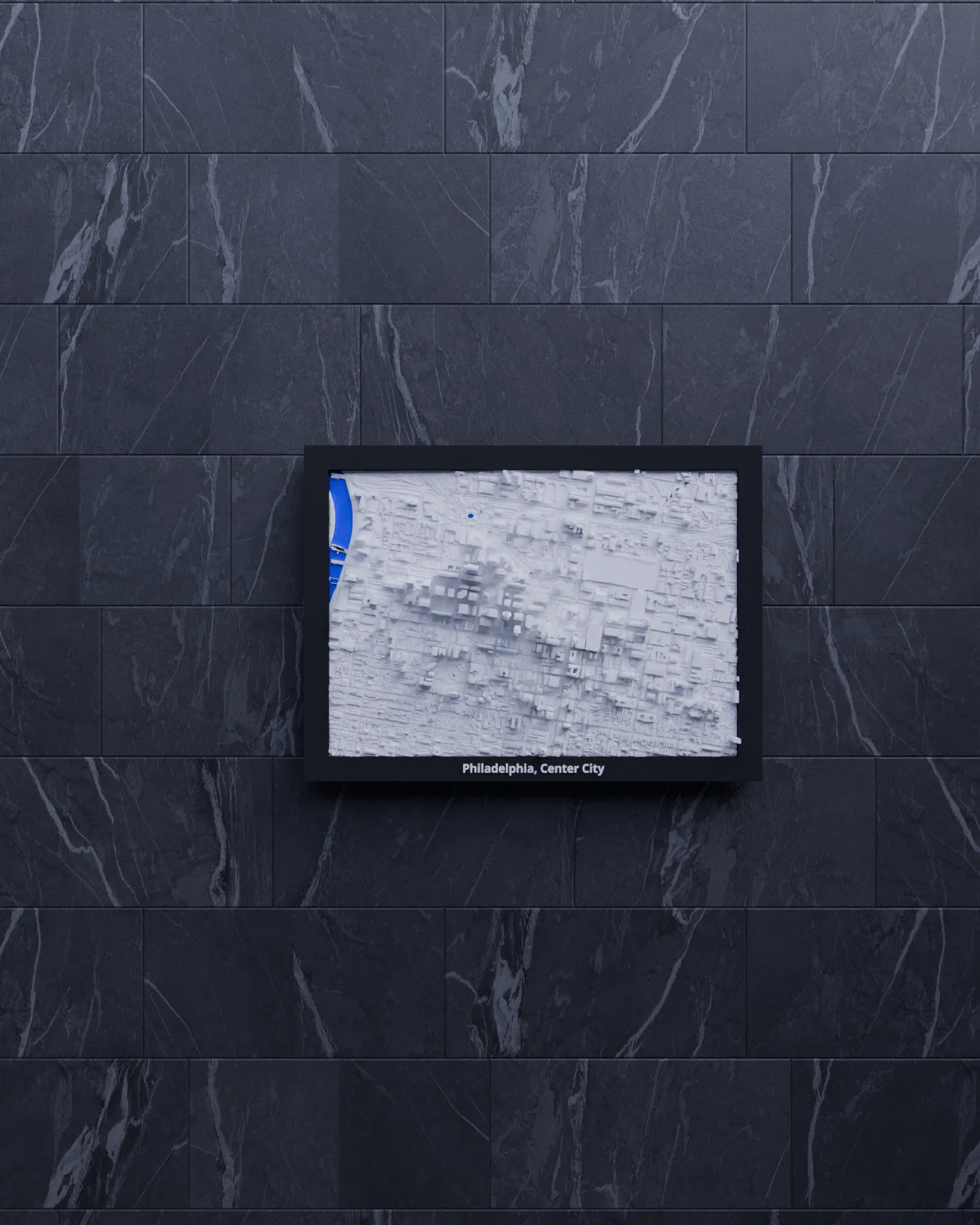 Mô hình địa hình (topographic) 3D mini tái hiện Philadelphia, Center City theo dữ liệu địa lý thật. Kích thước 170.5 x 119.5 mm, tỷ lệ ~14021:1, có nhiều lựa chọn frame kèm lỗ treo, phù hợp trang trí hoặc học tập.