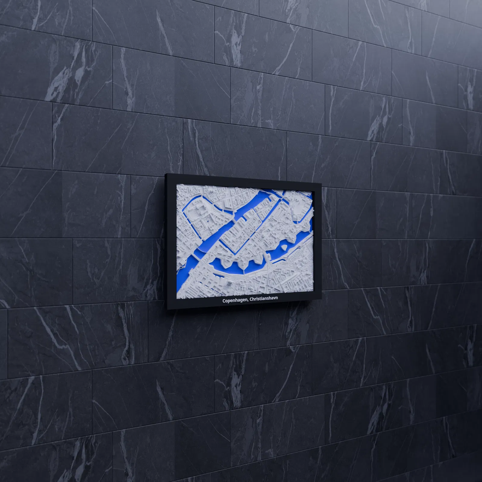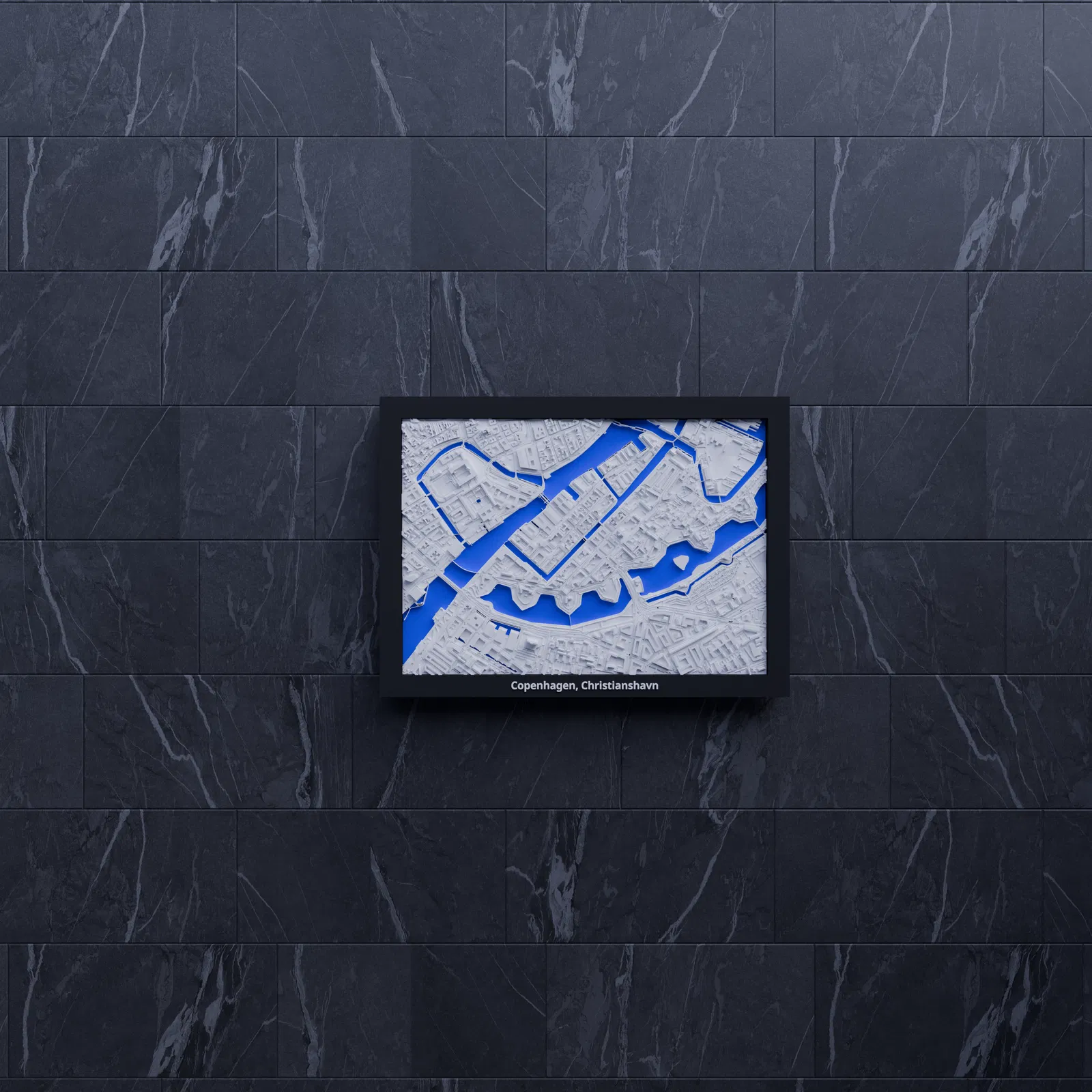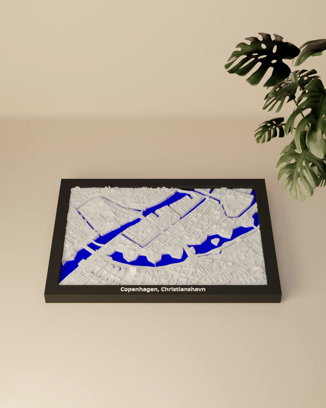 Miniature địa hình (topographic) Copenhagen – Christianshavn, Đan Mạch, dựng từ dữ liệu địa lý. Thu nhỏ khu vực 2.067 km x 1.446 km xuống 170.5 x 119.5 mm, tỉ lệ ~12125:1, có nhiều khung kèm lỗ treo.