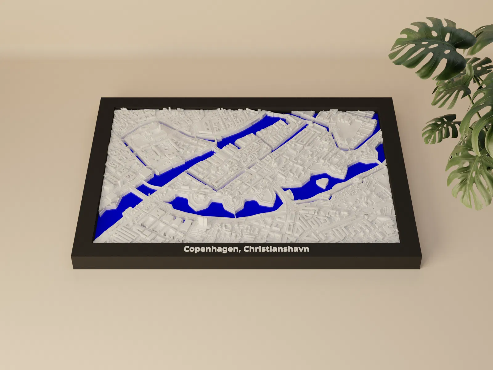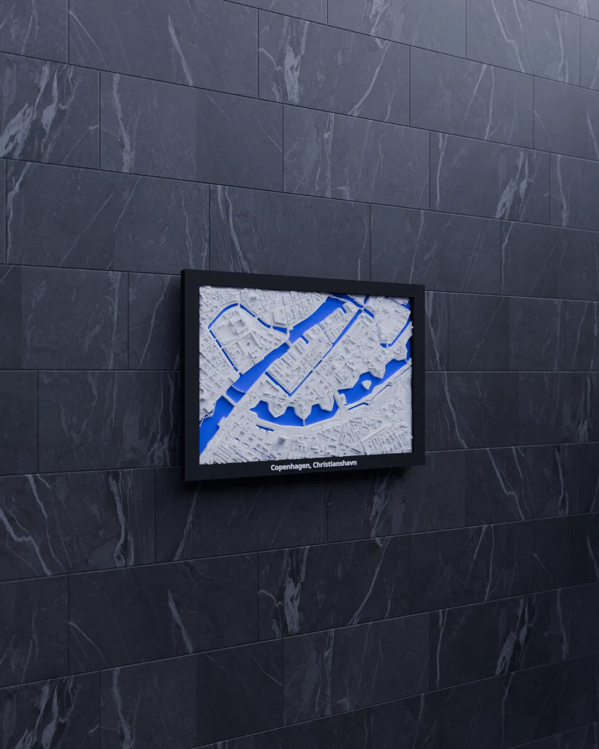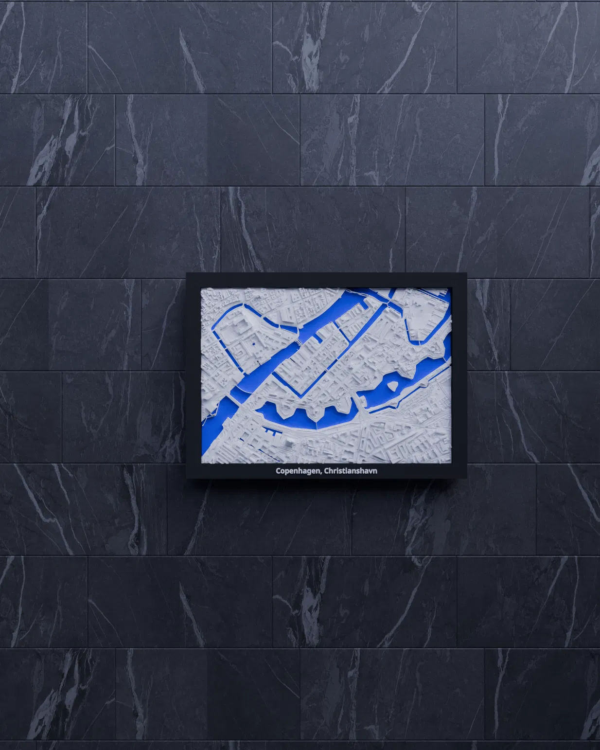 Miniature địa hình (topographic) Copenhagen – Christianshavn, Đan Mạch, dựng từ dữ liệu địa lý. Thu nhỏ khu vực 2.067 km x 1.446 km xuống 170.5 x 119.5 mm, tỉ lệ ~12125:1, có nhiều khung kèm lỗ treo.
