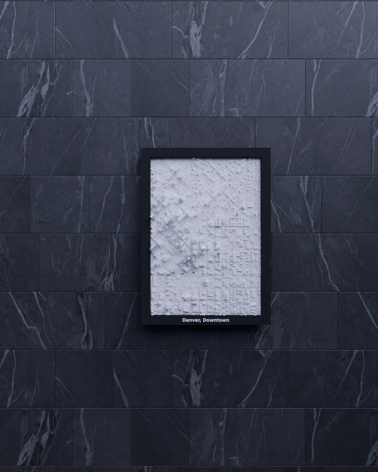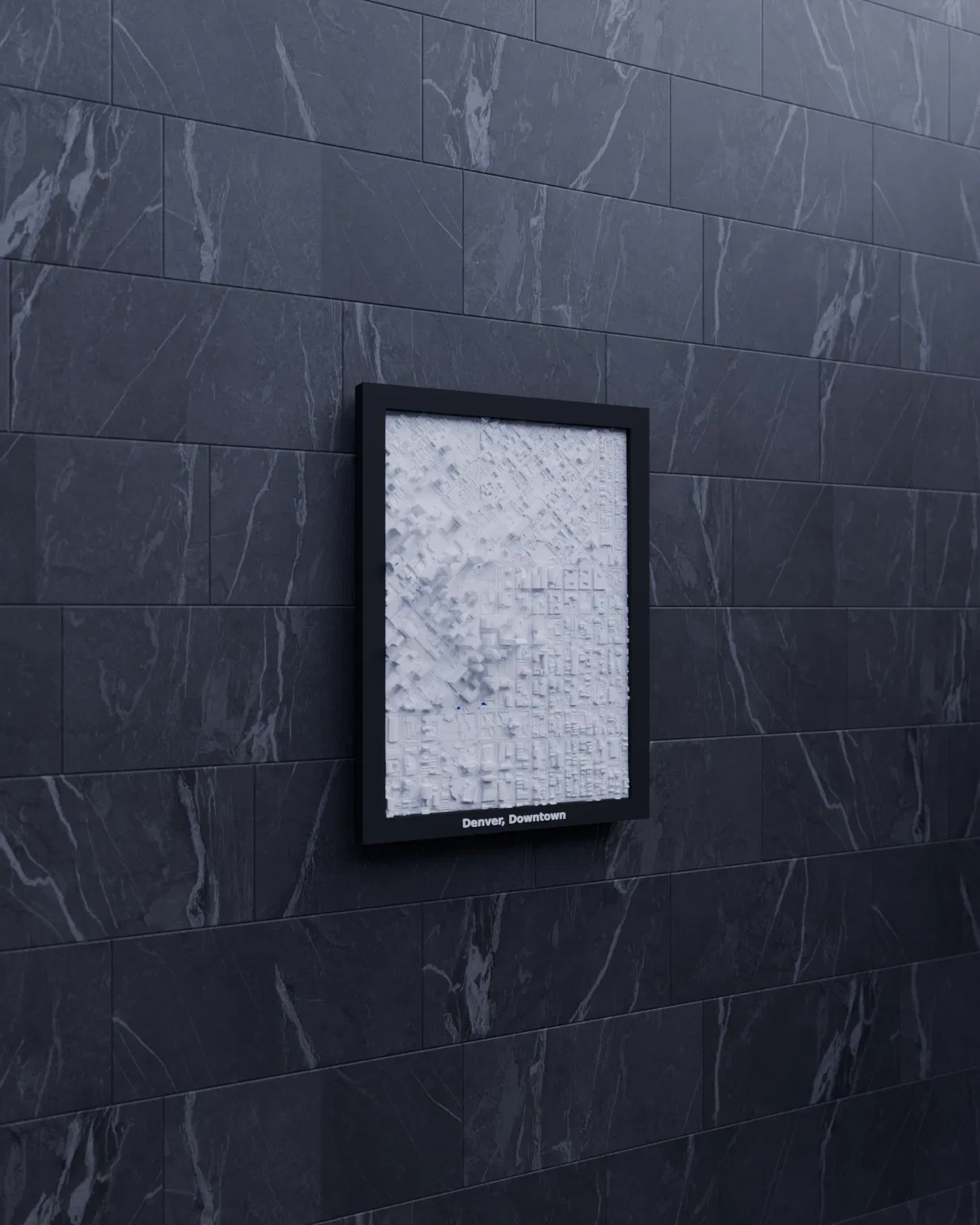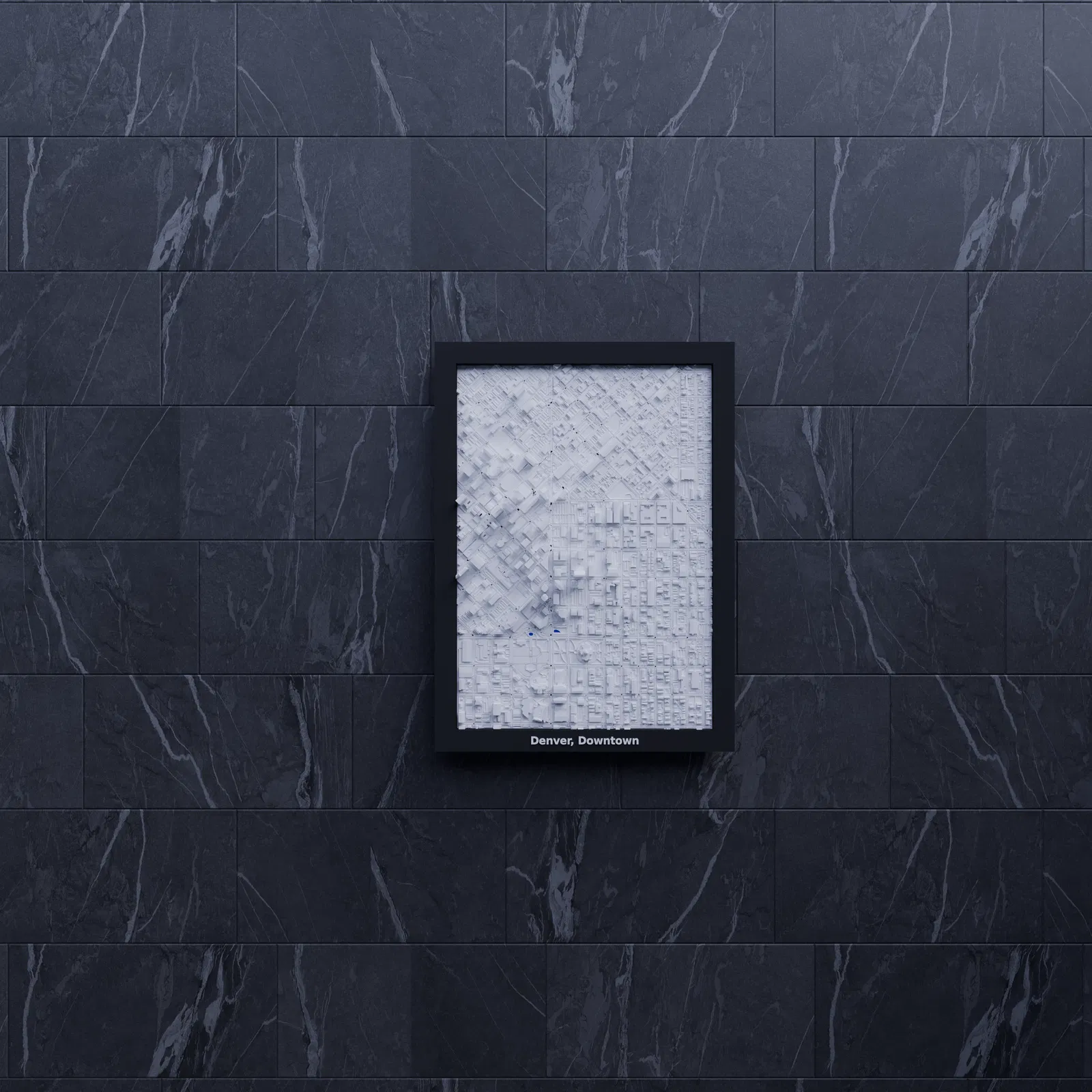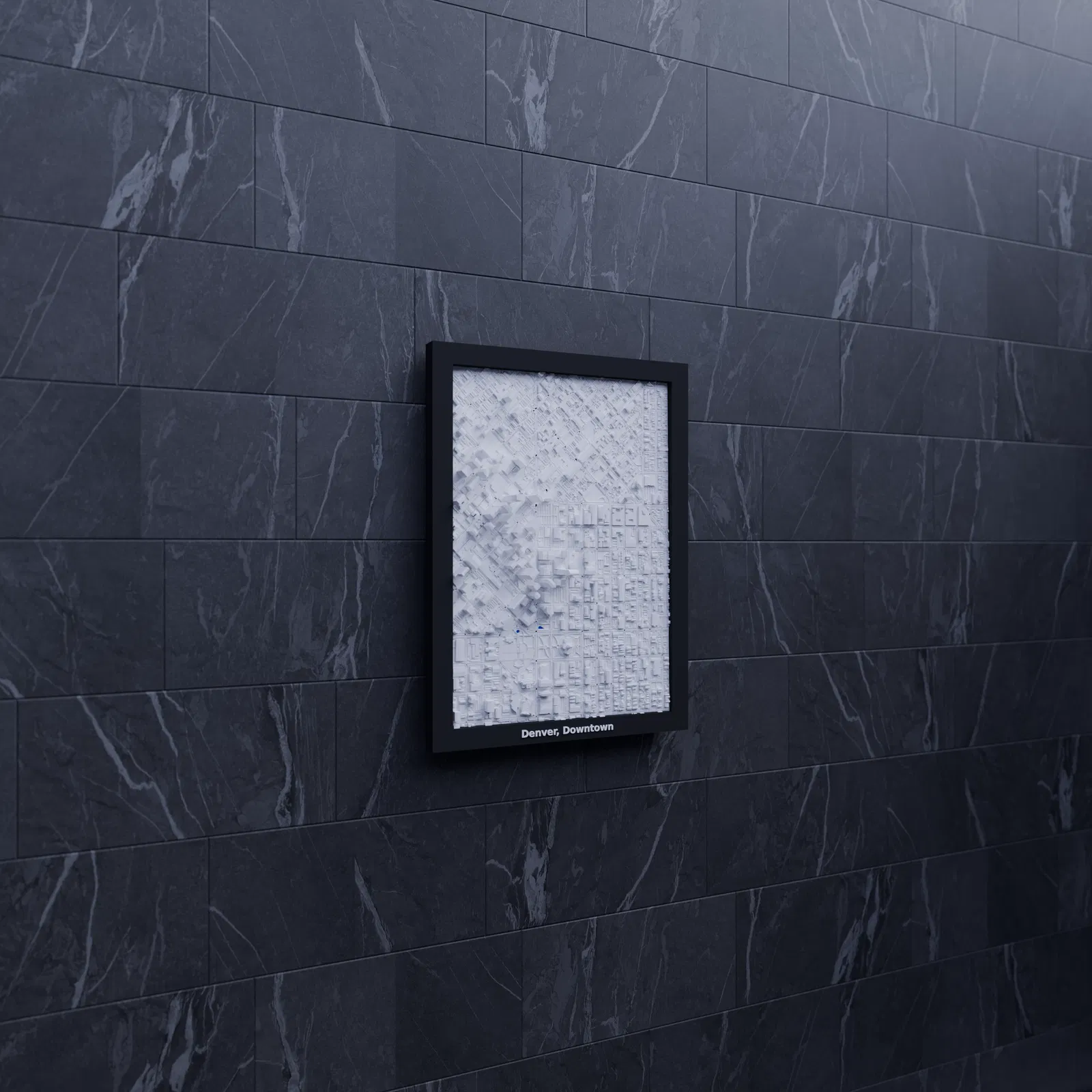 Mô hình thu nhỏ địa hình 3D tái hiện Denver, Downtown (Hoa Kỳ) từ dữ liệu địa lý, thu nhỏ từ 1.561 × 2.218 km xuống 119.5 × 170.5 mm (~13063:1). Phù hợp học tập, kiến trúc và decor; kèm các khung có lỗ treo.