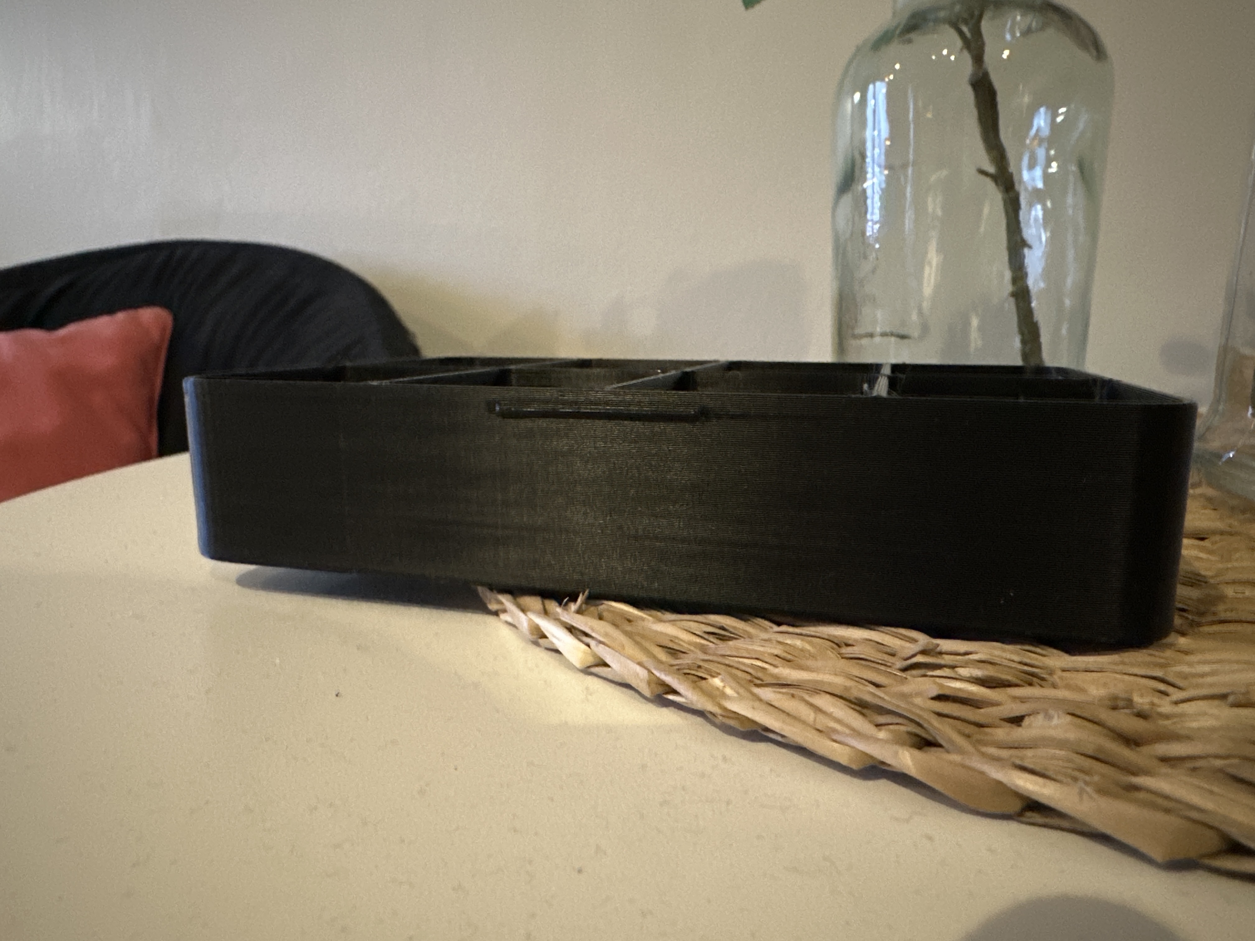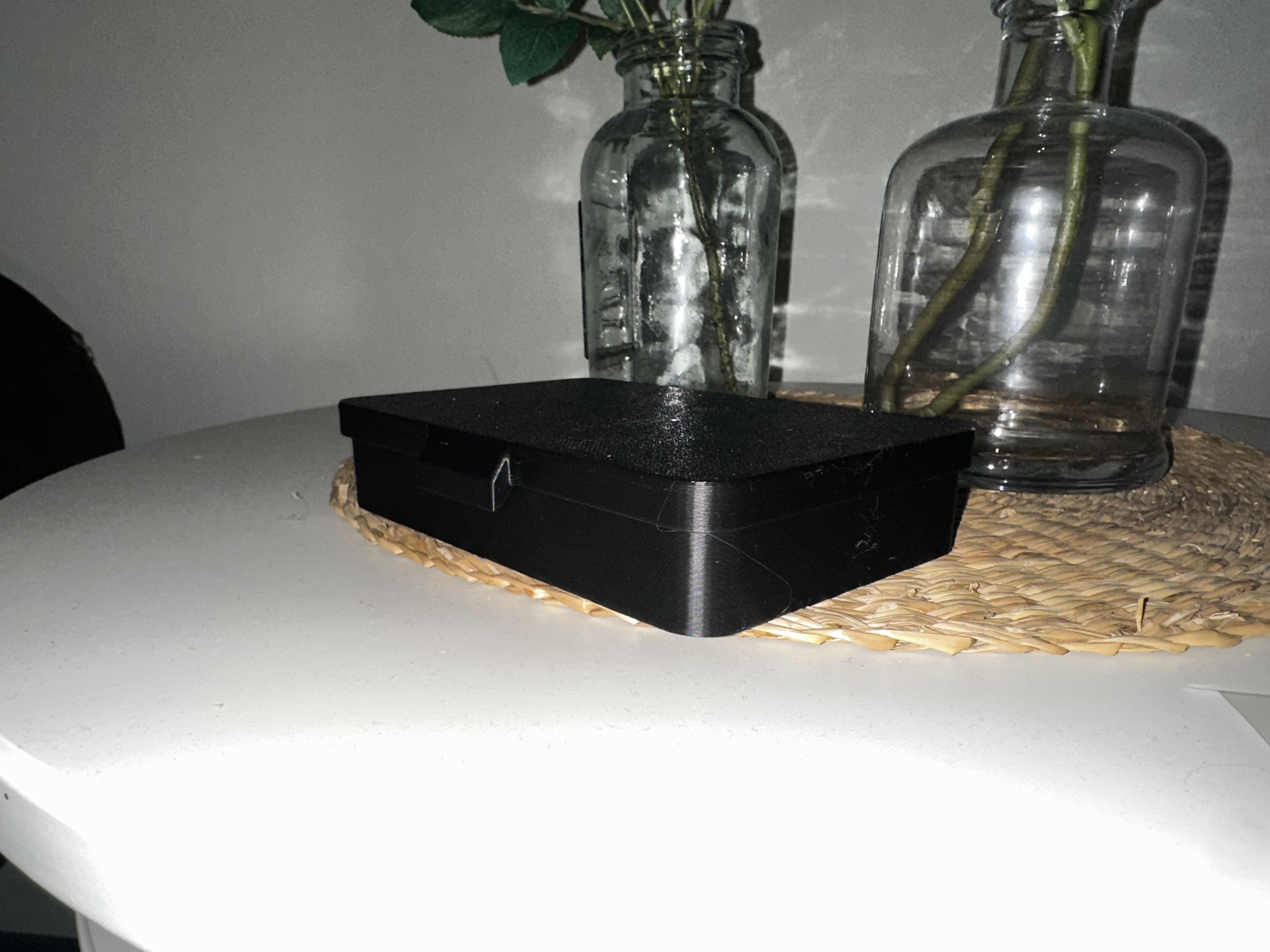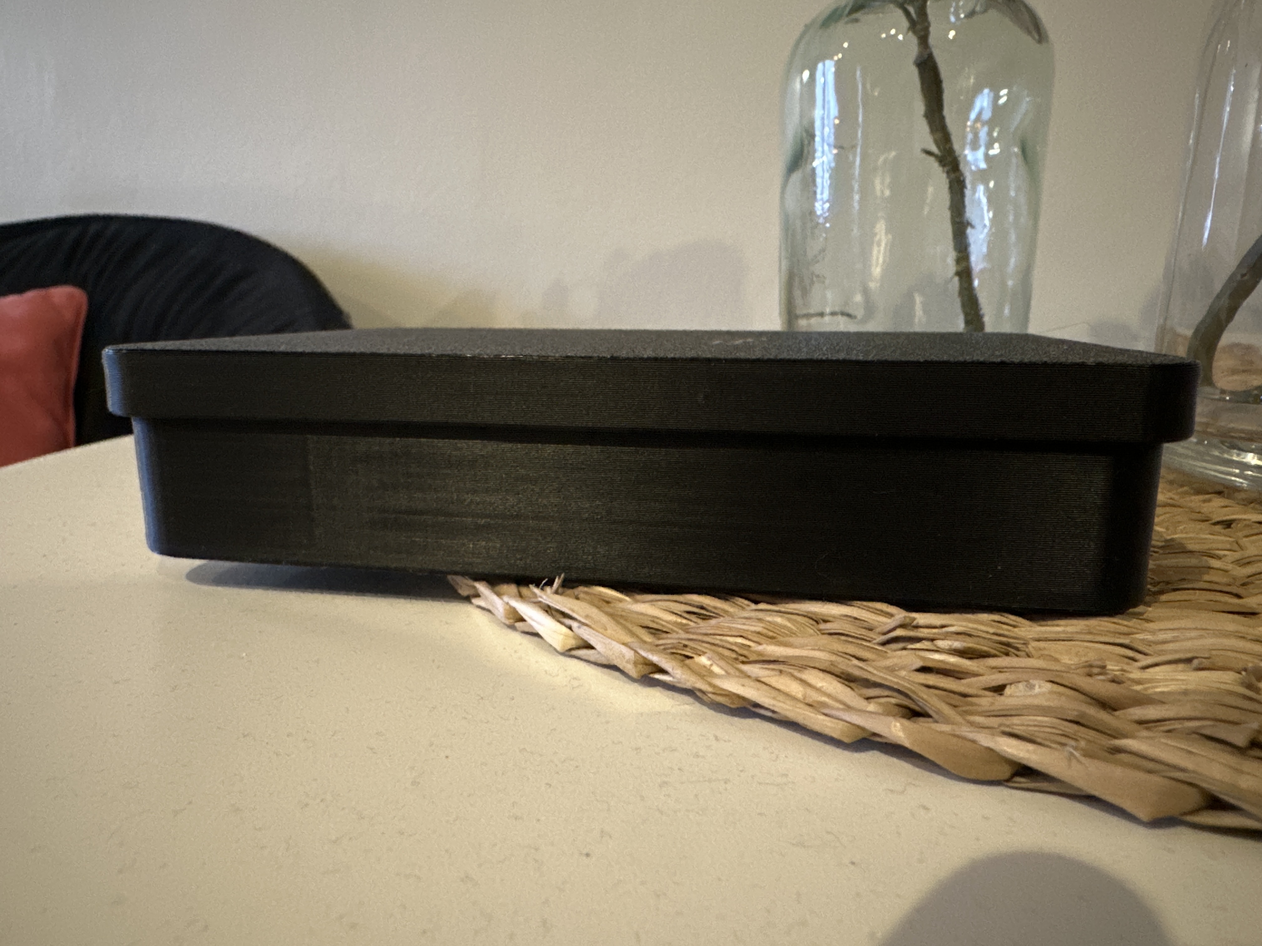 Trọng tâm của thiết kế là cảm giác chắc chắn, hình khối sạch và tính tiện dụng hằng ngày. Thay vì cố tối đa hóa không gian rỗng bên trong, hình học được tinh chỉnh để hộp đứng vững và cân đối trên bàn, trong khi vẫn giữ thời gian in và lượng vật liệu ở mức hợp lý.