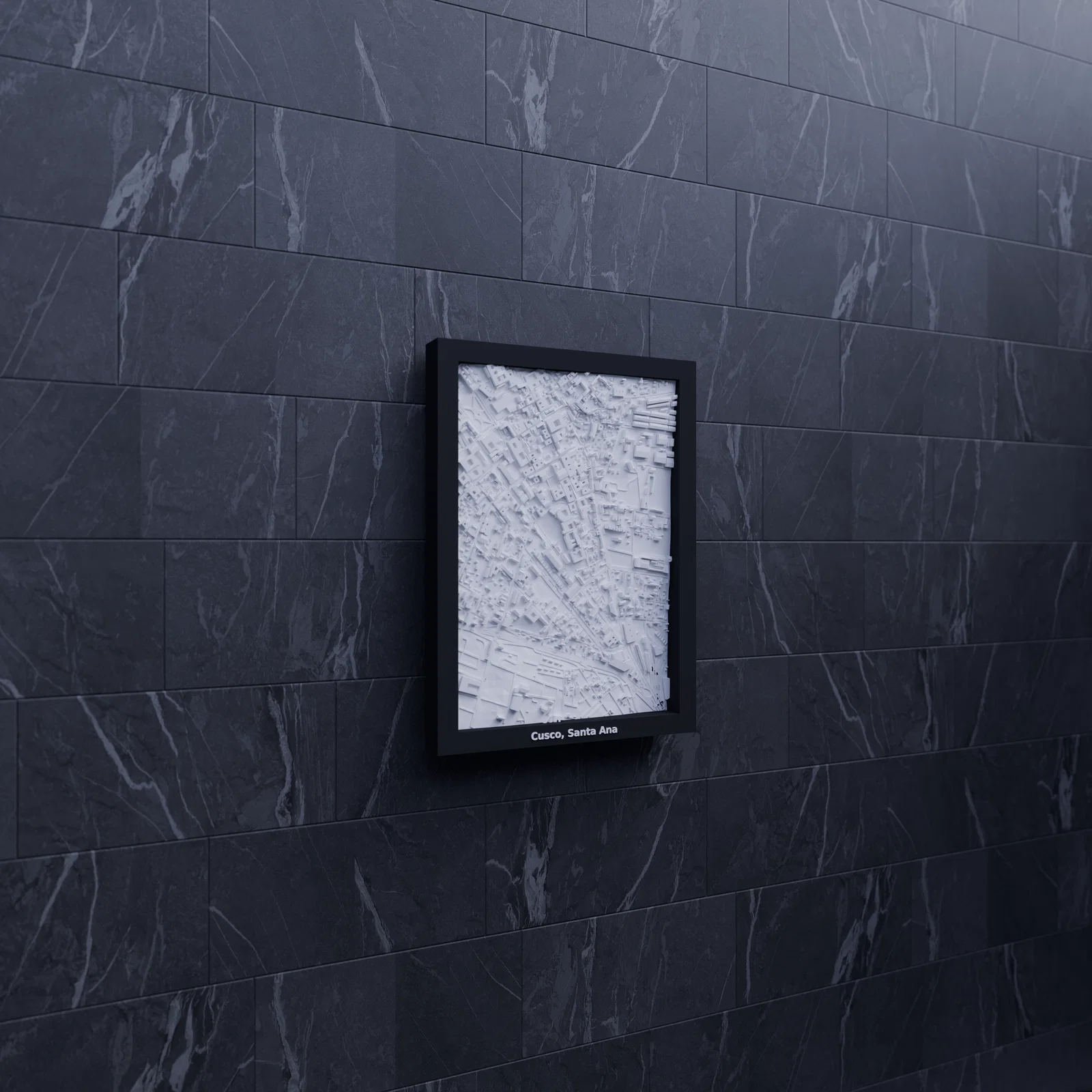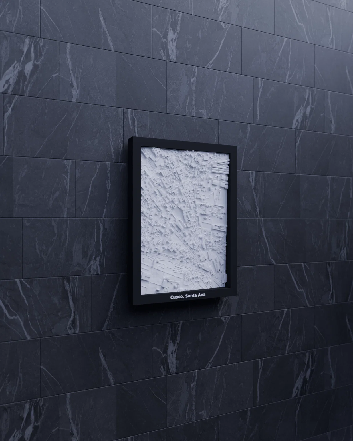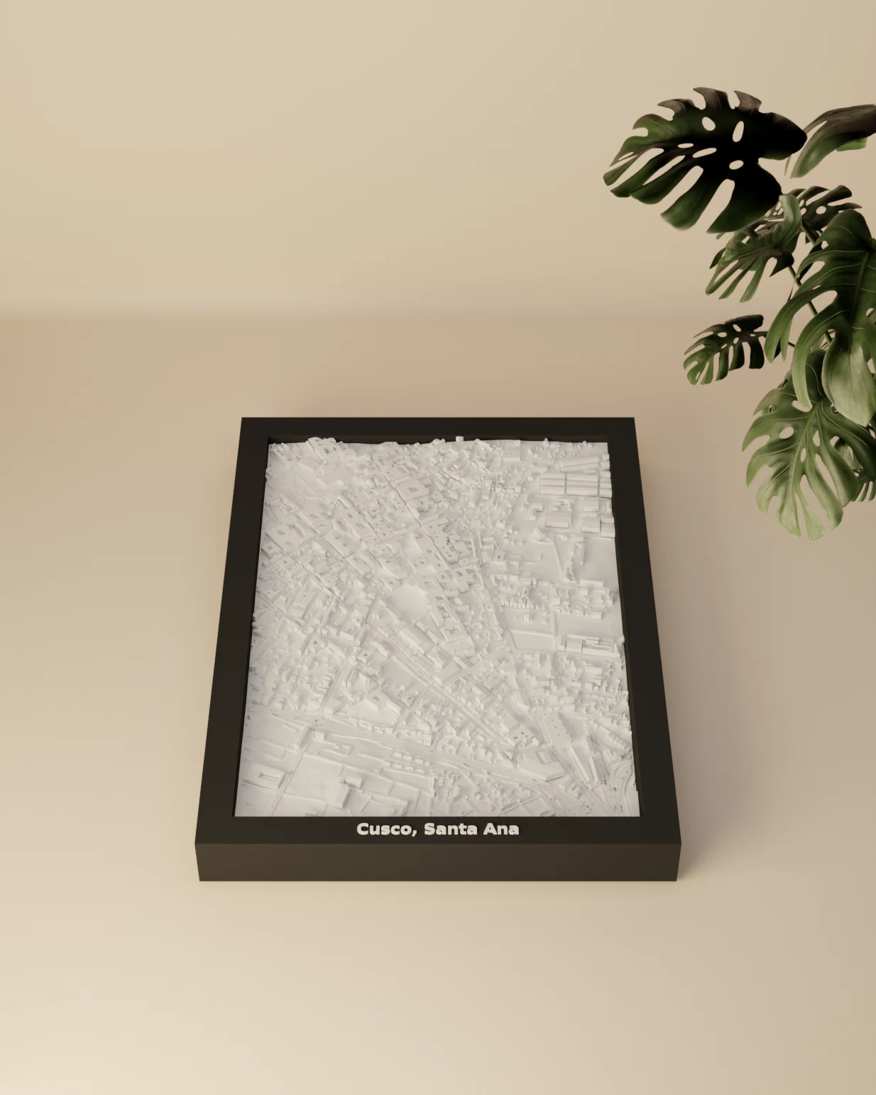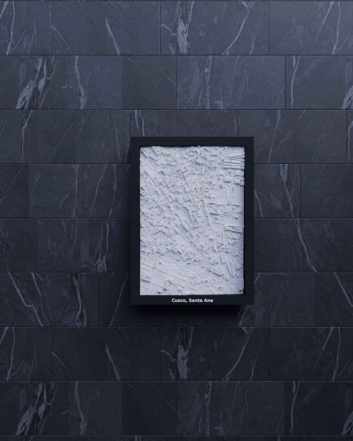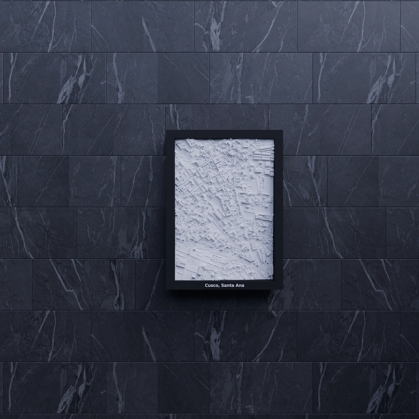Mô hình địa hình (topographic) 3D Miniature tái hiện Cusco, Santa Ana (Peru) theo dữ liệu địa lý. Khu vực 1.013×1.437 km được thu nhỏ còn 119.5×170.5 mm (~8479:1), có frame kèm lỗ treo.