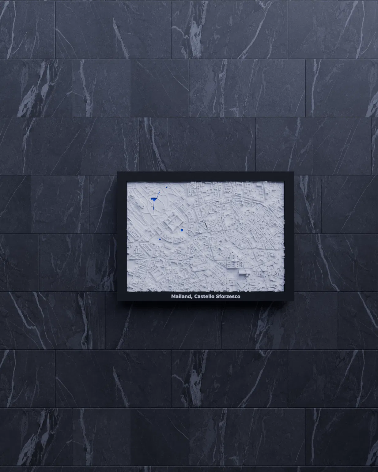 Mô hình mini địa hình (topographic) tái hiện khu vực quanh Castello Sforzesco, Milano theo dữ liệu địa lý. Kích thước in 170.5 × 119.5 mm, tỉ lệ xấp xỉ ~12118:1, có nhiều frame kèm lỗ treo.