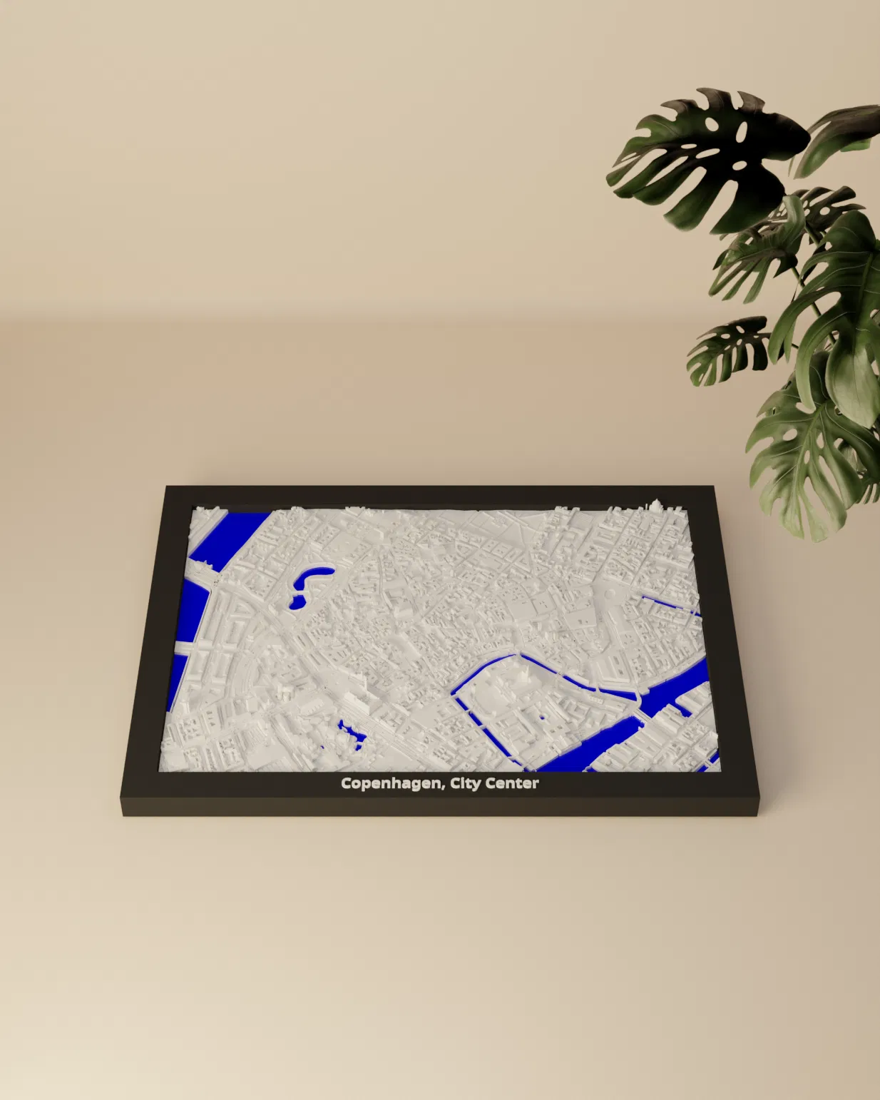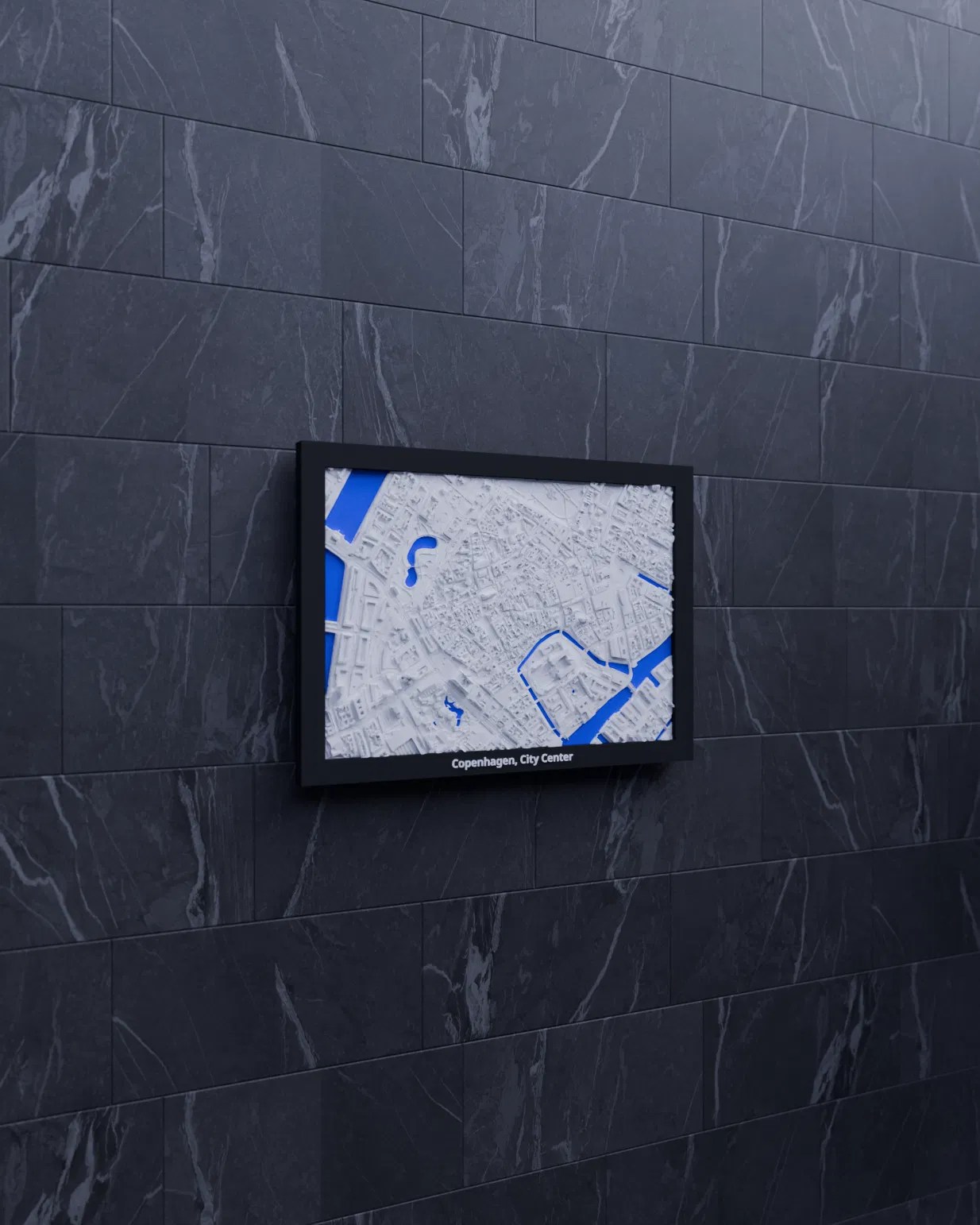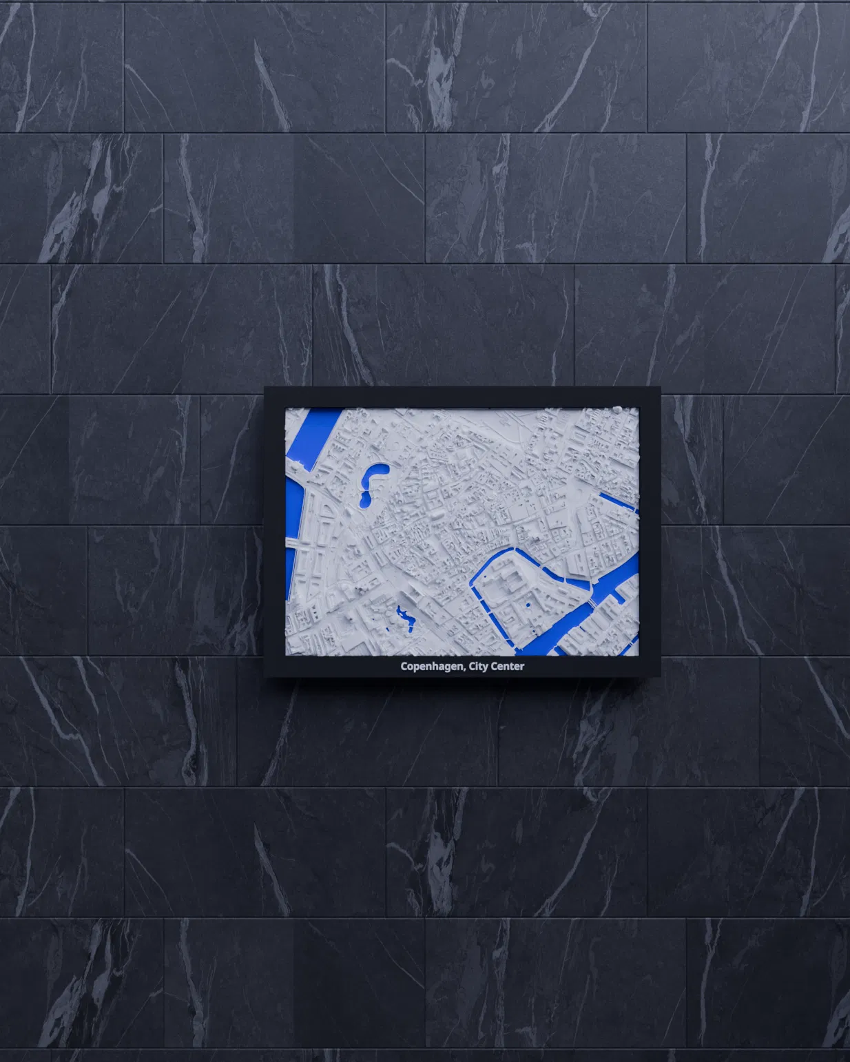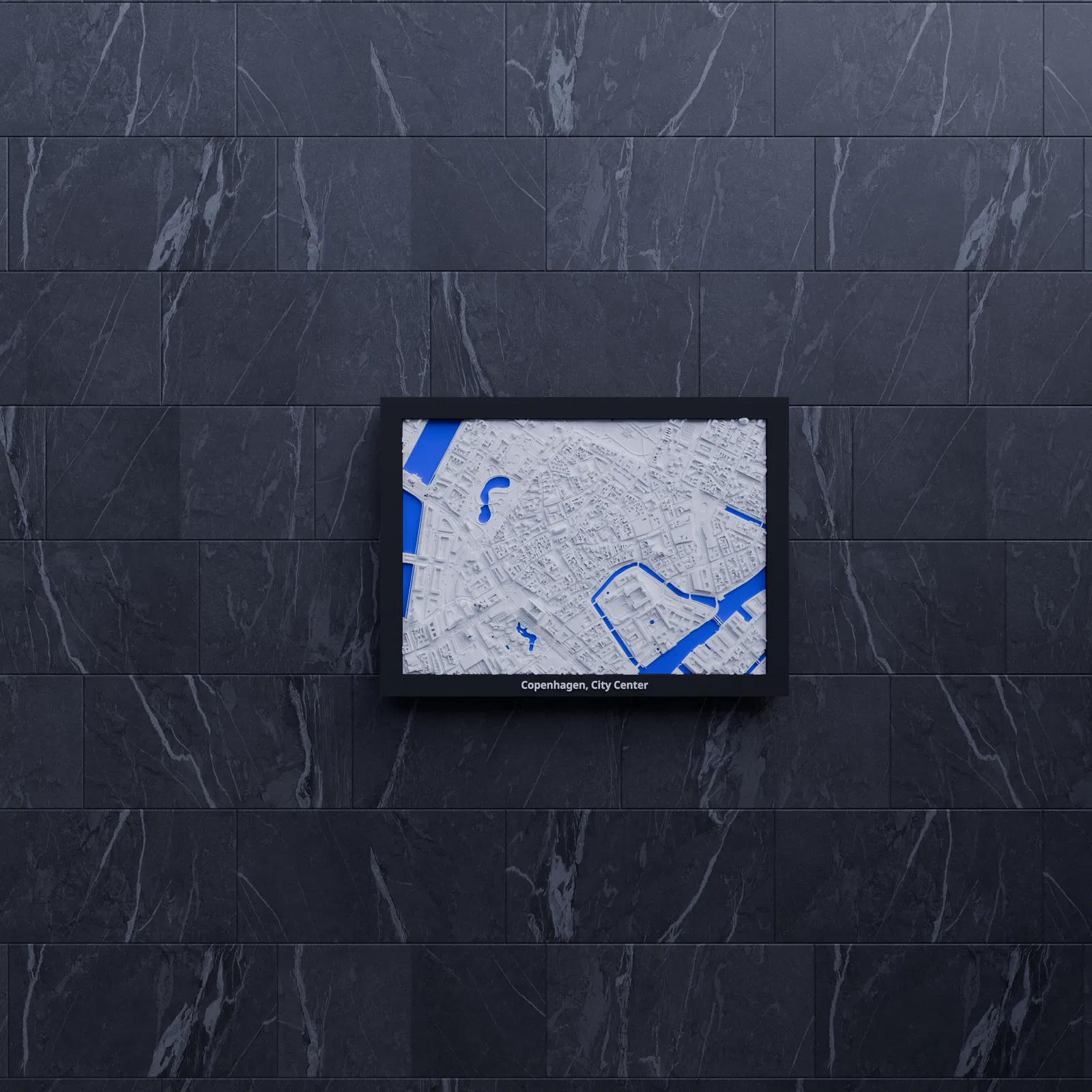 Mô hình thu nhỏ địa hình 3D khu trung tâm Copenhagen (Đan Mạch), dựng từ dữ liệu địa lý quanh tọa độ 55.679, 12.575. Tỷ lệ ~12126:1, kích thước 170.5 x 119.5 mm, có nhiều frame kèm lỗ treo.