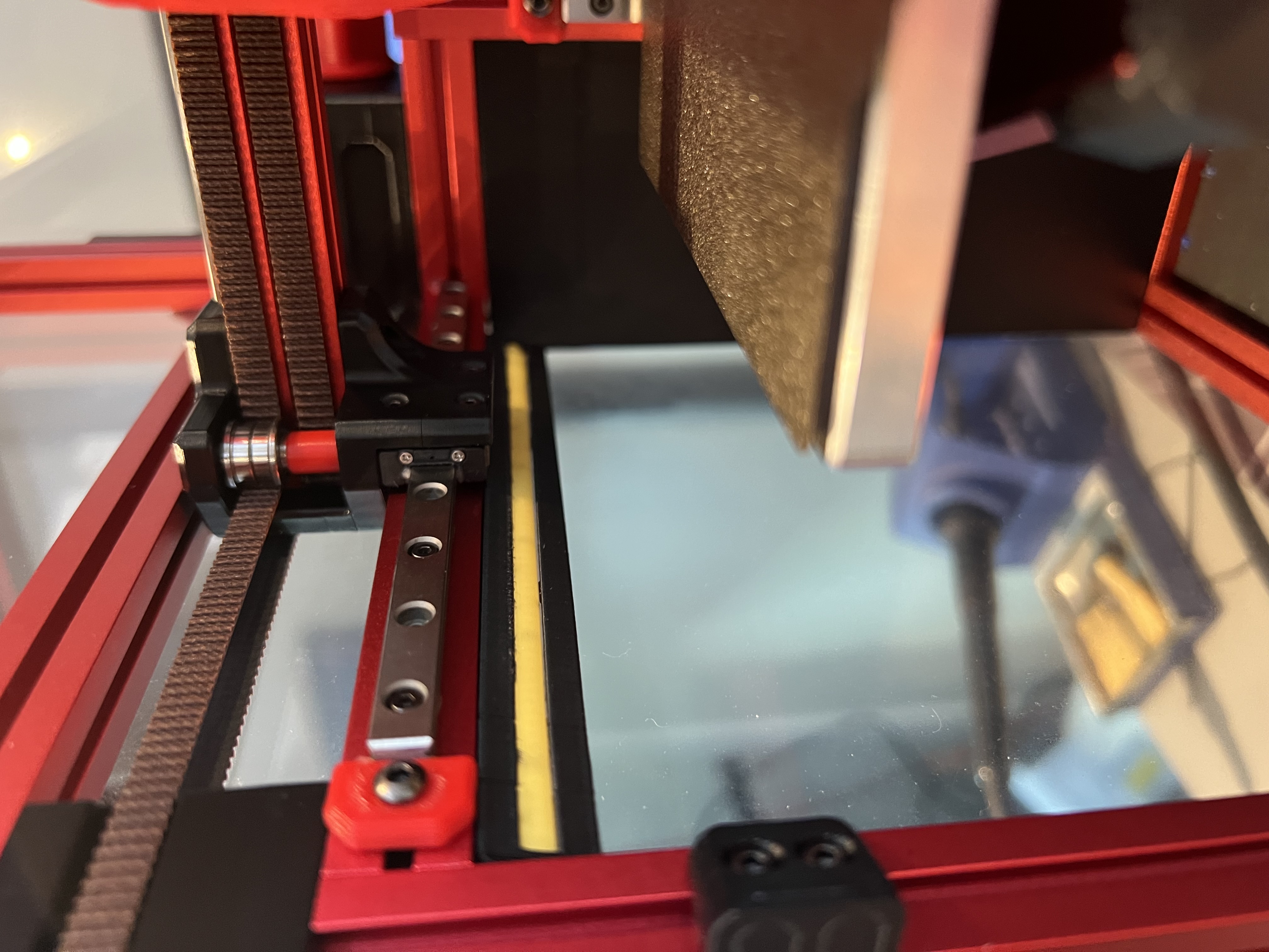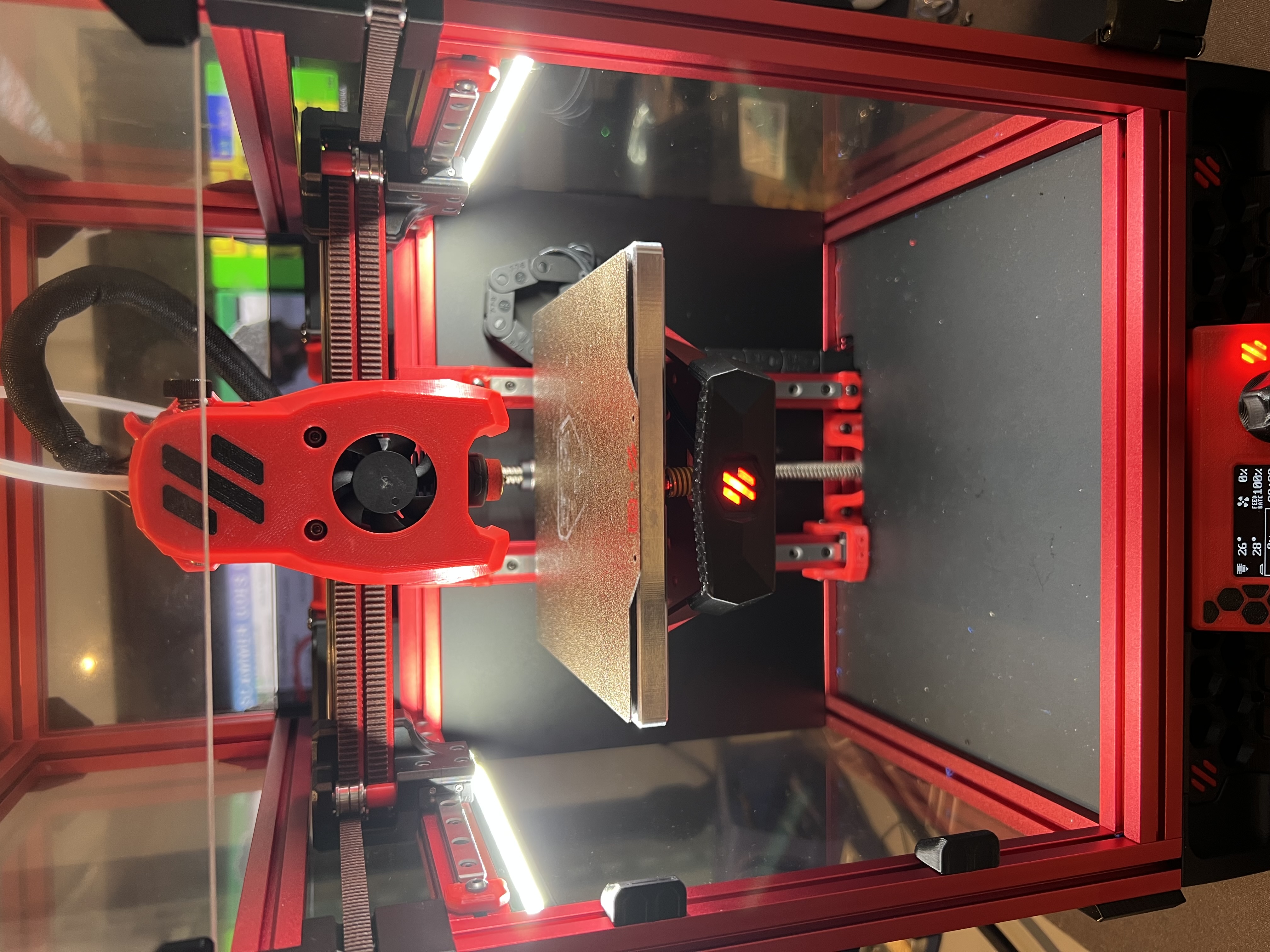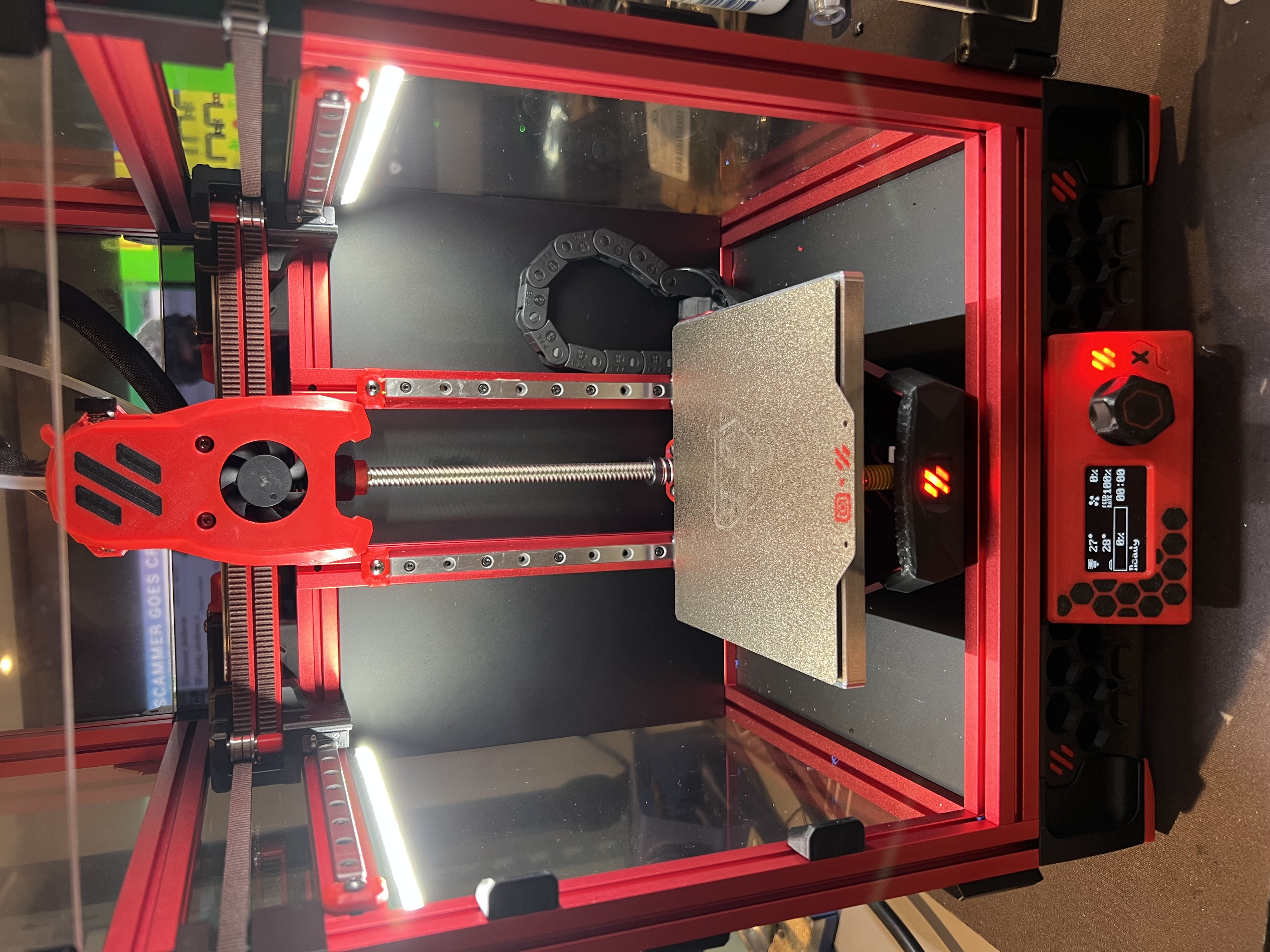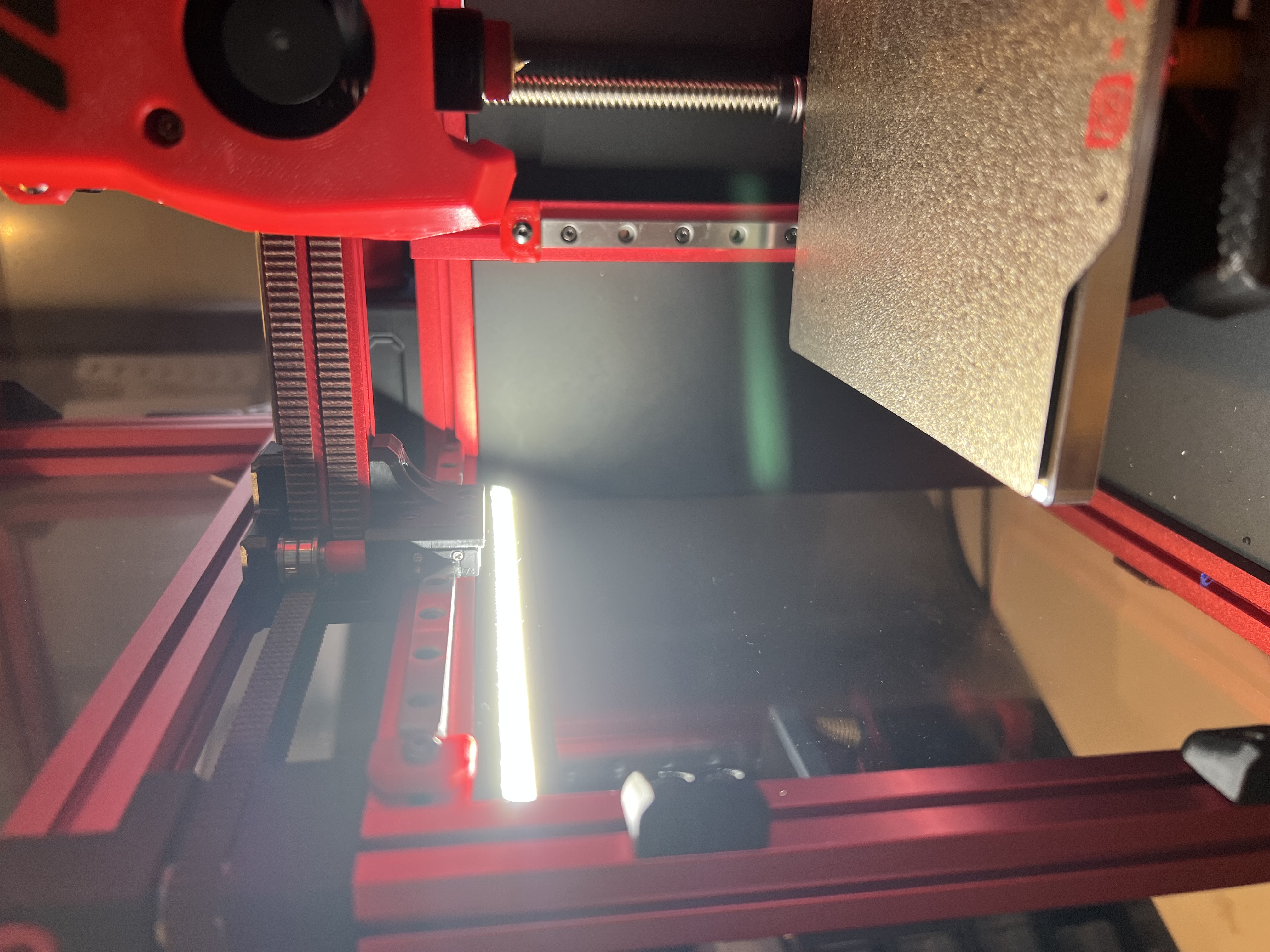 Gắn heatset inserts vào các spacer. Sau đó hàn 2 sợi dây vào một đầu dải LED. Luồn hai sợi dây này qua miếng end piece có lỗ đi dây. Rồi trượt (slide) dải LED vào các spacer và end caps. Khi ráp xong hết, lắp vít M3x25 ở hai đầu để siết giữ toàn bộ lại. Luồn dây vào bên trong extrusion, đi lên và vòng qua tấm panel ngăn giữa build chamber và phần electronics. Cuối cùng chỉ cần kẹp chúng vào là xong.