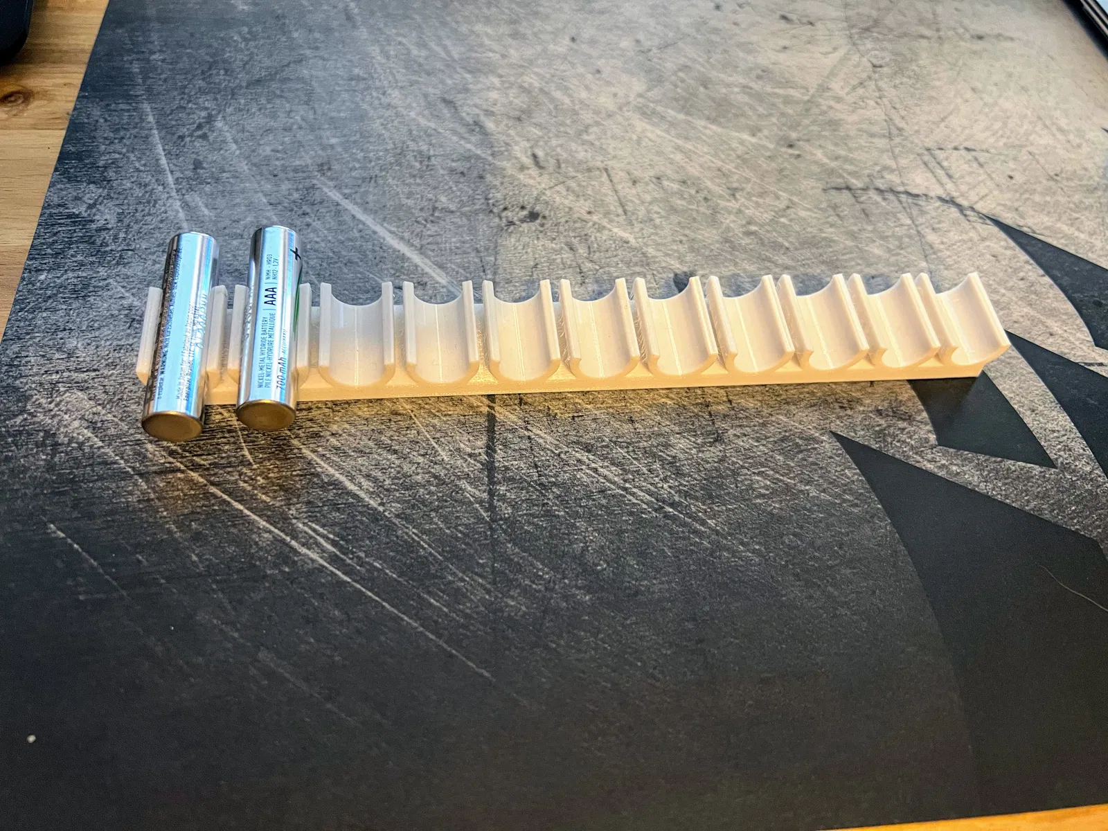 Mình dùng pin sạc (rechargeable), nên có chỗ cất pin khi không nằm trên charger là chuyện cực kỳ quan trọng. Mẫu này cũng giúp mình gắn lên tường trong tủ áo để pin gọn, không vướng víu. Có thể scale lên cho pin AA, nhưng mình chưa làm thử. Nếu bạn làm trước mình thì nhớ đăng một bản remix nha.