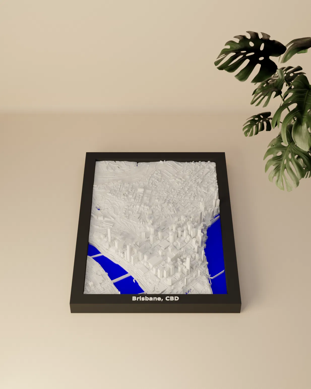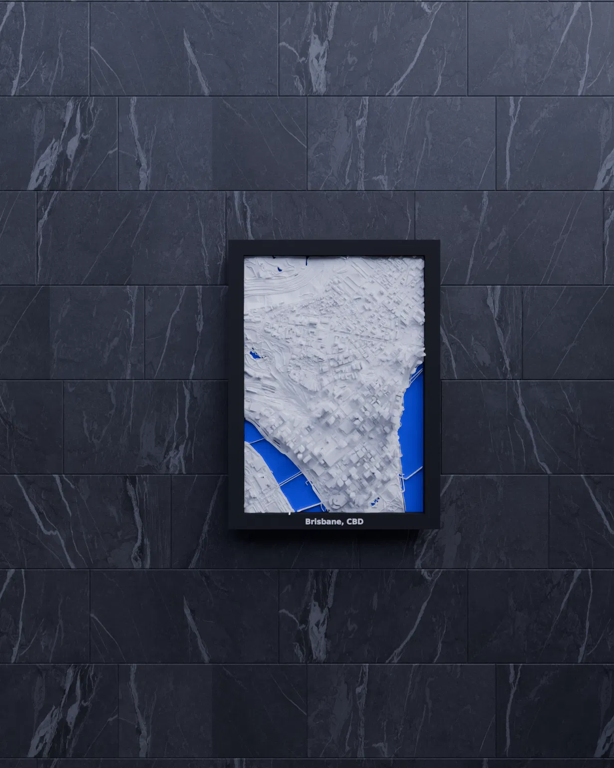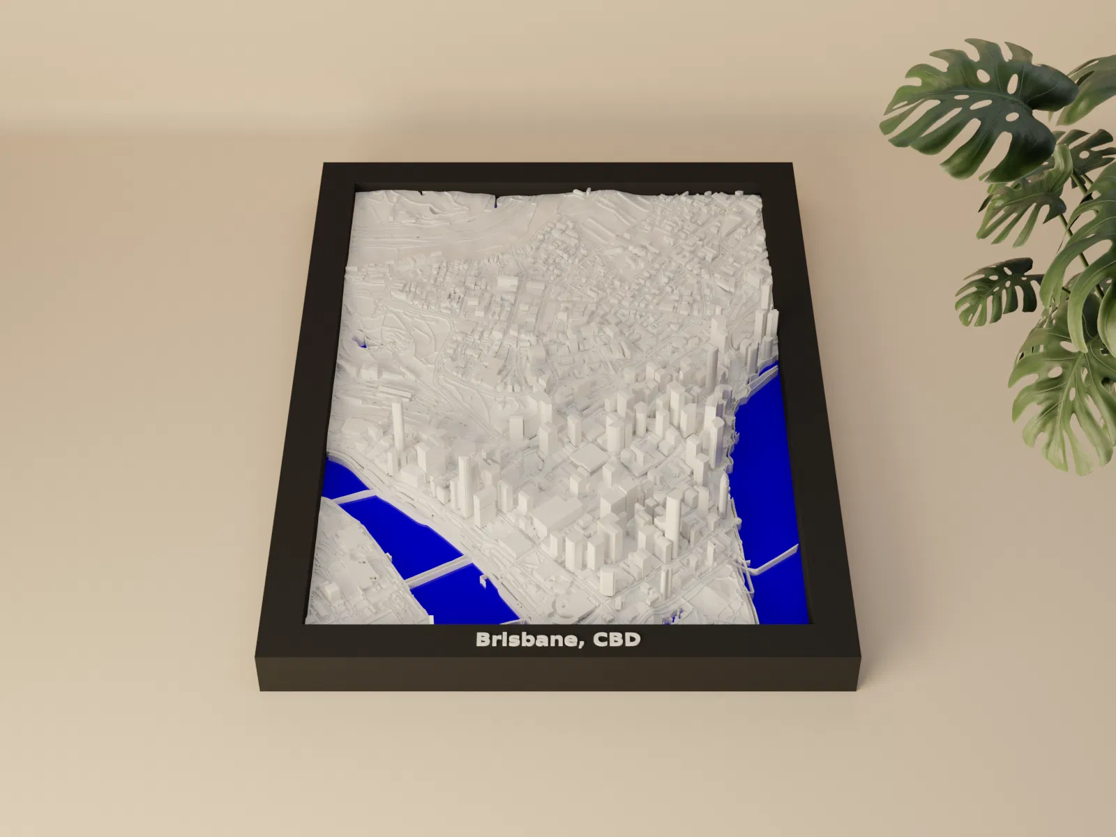 Mô hình thu nhỏ địa hình 3D của Brisbane, CBD (Australia) dựng từ dữ liệu địa lý, thu nhỏ khu vực 1.560 km x 2.214 km xuống 119.5 x 170.5 mm. Có Frames kèm lỗ treo, phù hợp in PLA/STL để decor hoặc học tập.