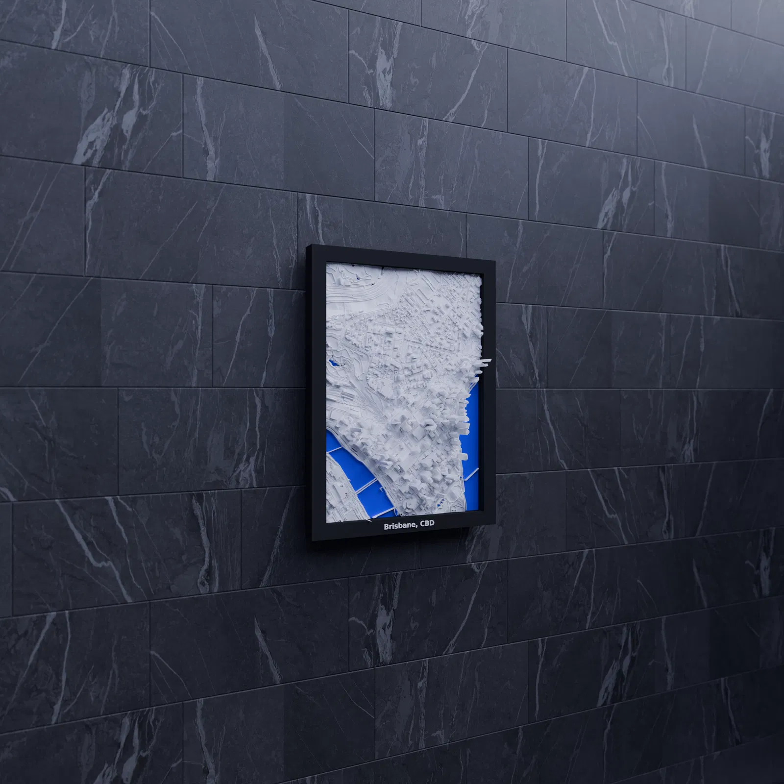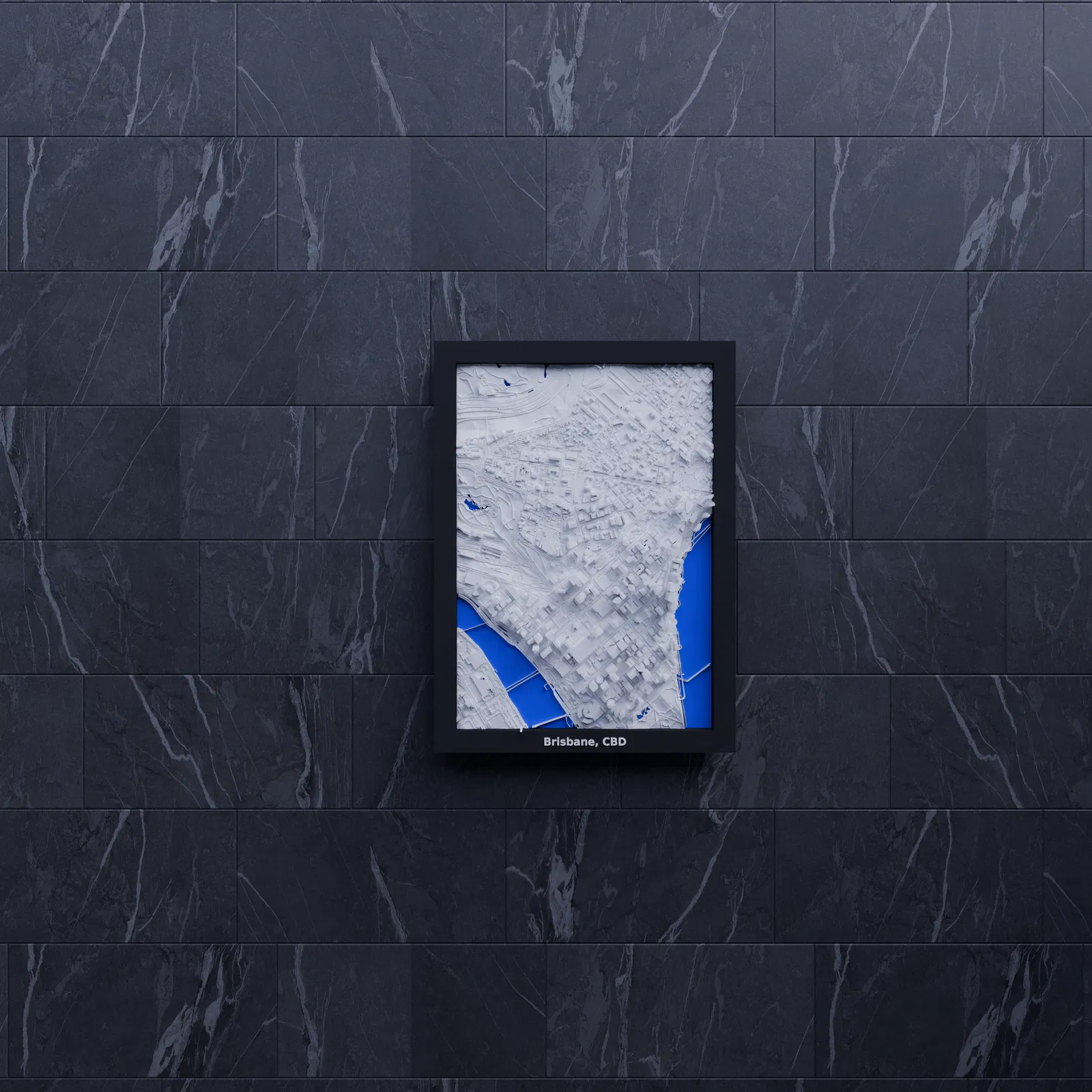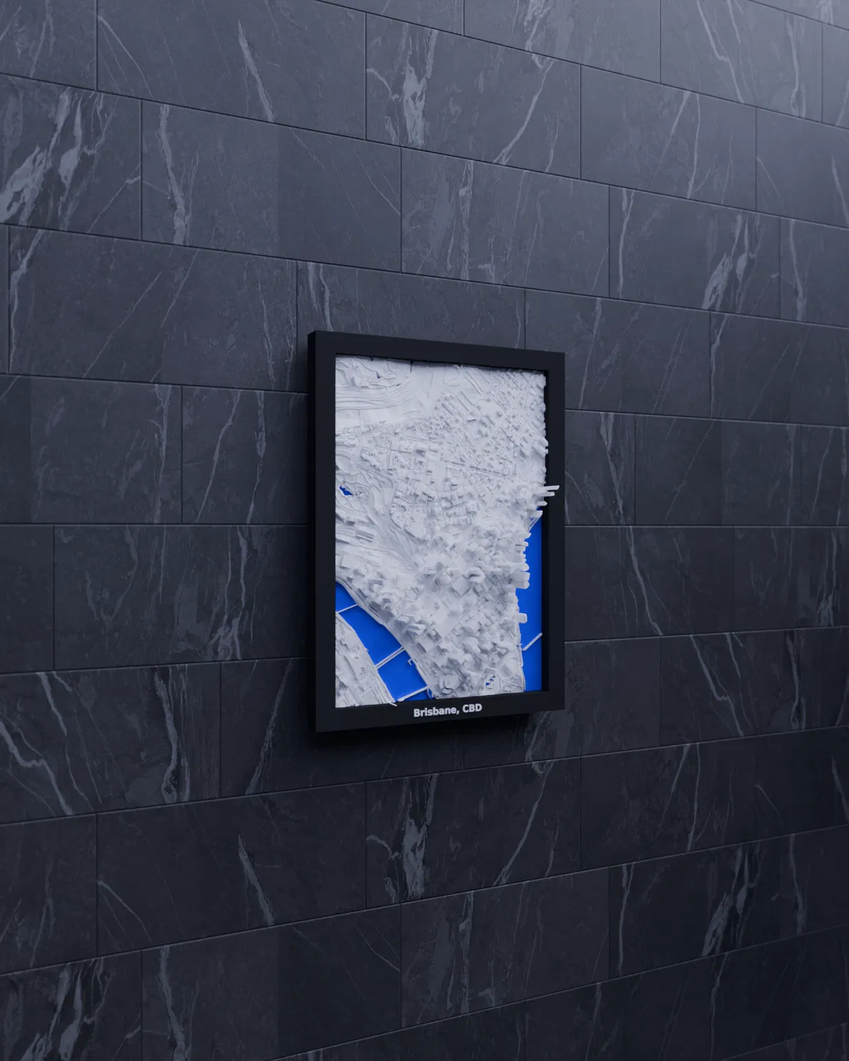 Mô hình thu nhỏ địa hình 3D của Brisbane, CBD (Australia) dựng từ dữ liệu địa lý, thu nhỏ khu vực 1.560 km x 2.214 km xuống 119.5 x 170.5 mm. Có Frames kèm lỗ treo, phù hợp in PLA/STL để decor hoặc học tập.