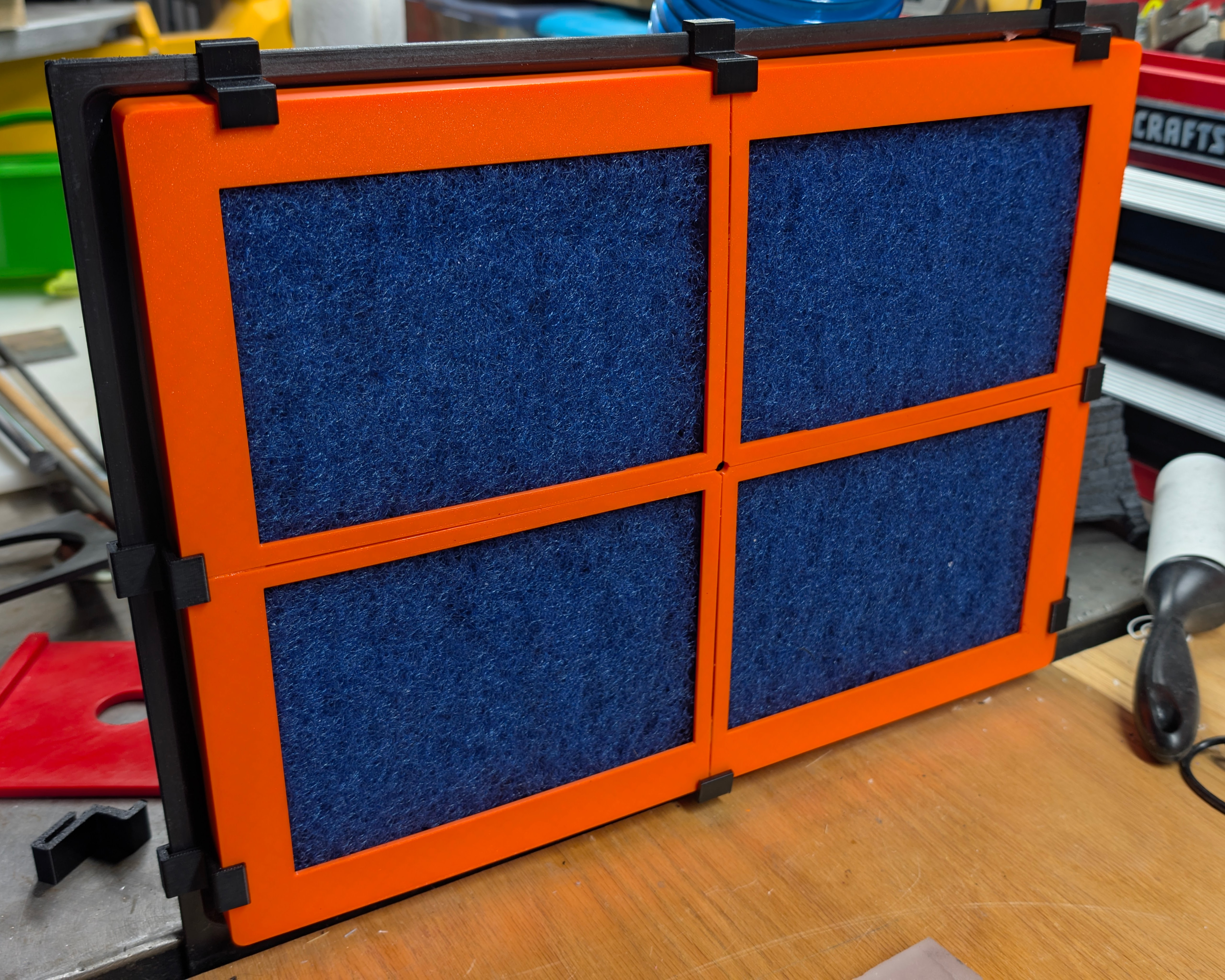 Khung in 3D để giữ miếng furnace filter cắt theo kích thước cho Woodstock Big Gulp Dust Hood D4242, giúp chặn bụi khỏi hệ thống ventilation và dễ vệ sinh/thay lọc. Bản UPDATED thêm clip có lỗ bắt vít M3.