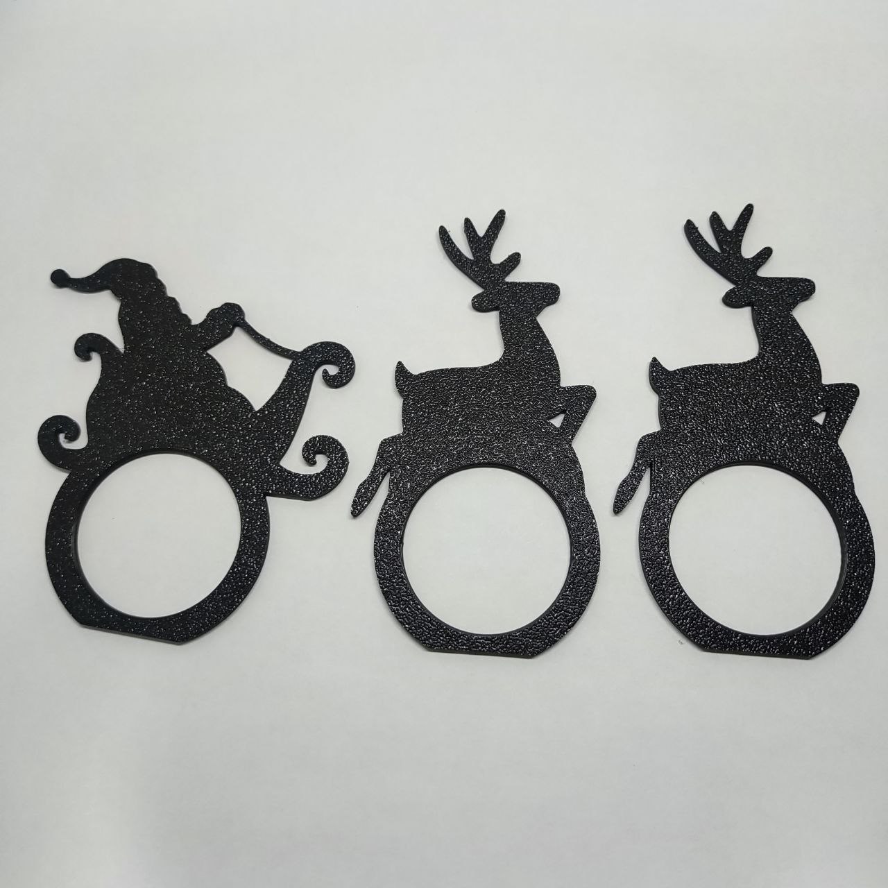 Làm bàn tiệc Noel thêm lung linh và ấm cúng với vòng giữ khăn ăn in 3D gồm 2 mẫu: Santa trên xe trượt và tuần lộc kéo xe. Thiết kế vòng tròn dễ luồn khăn, in PLA, layer 0.20 mm, không cần support.