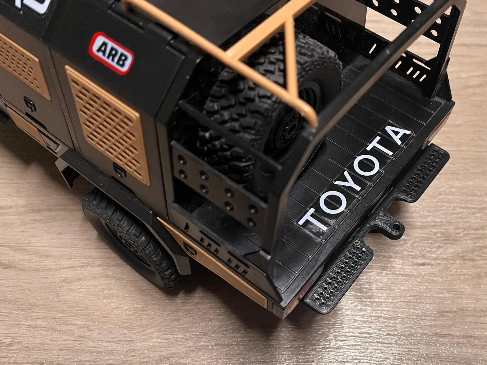 Móc kéo (trailer hitch/tow bar) cho xe RC Toyota MN82 S LC79, có bậc lên xuống. Có 2 bản góc overhang 20° và 40°; cần support cho lỗ vít, steps và trailer coupling. Gợi ý in nozzle 0.4mm, layer 0.2mm, PLA+.
