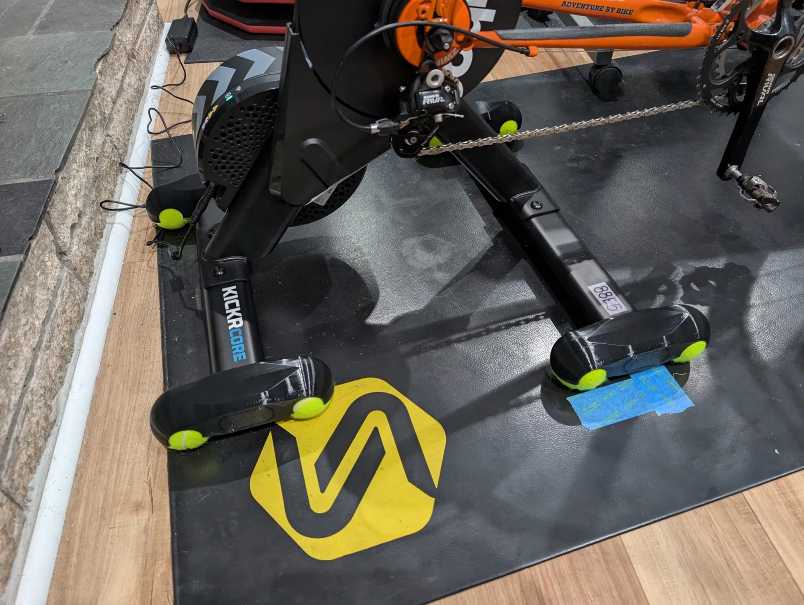 Bộ chân rocker low-profile cho Wahoo KICKR CORE 2, giữ bóng tennis để trainer lắc nhẹ khi đạp, giảm mỏi và tăng thoải mái. Tối ưu để dùng với bánh trước 700c x 32mm-ish mà không cần riser block.
