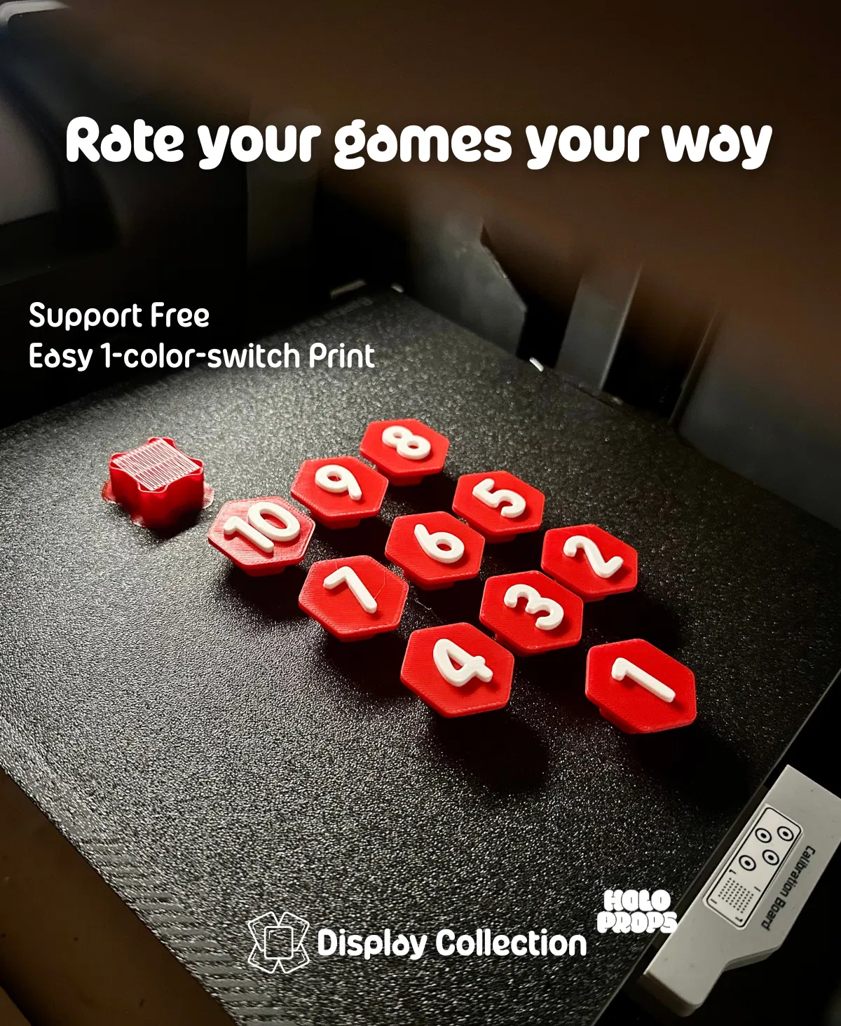 Bộ Rating Badges tối giản để chấm điểm và khoe bộ sưu tập game. Thiết kế modular, gắn nam châm 10x3 mm, hỗ trợ in Dual Color từ file 3MF, không cần support và tương thích mọi khung Display Collection.