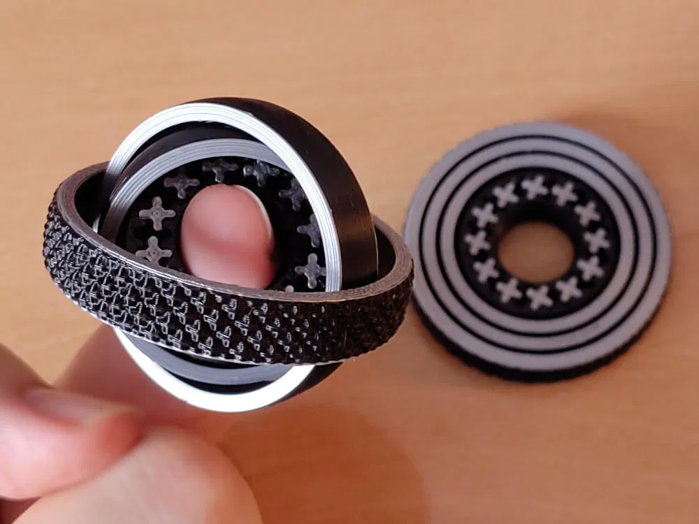 Vòng bánh răng là đồ chơi fidget rất đã, còn mấy vòng kiểu “gyro”/gimbal mount cũng đã không kém, vậy thì sao không kết hợp luôn? Mấy khớp gimbal mượt tới mức bạn chỉ cần thổi nhẹ là nó quay lên được kha khá tốc độ.