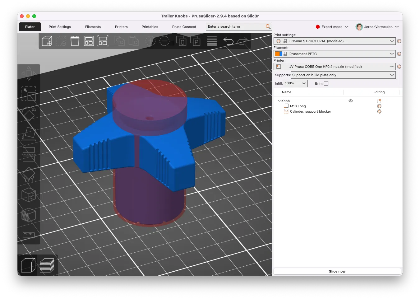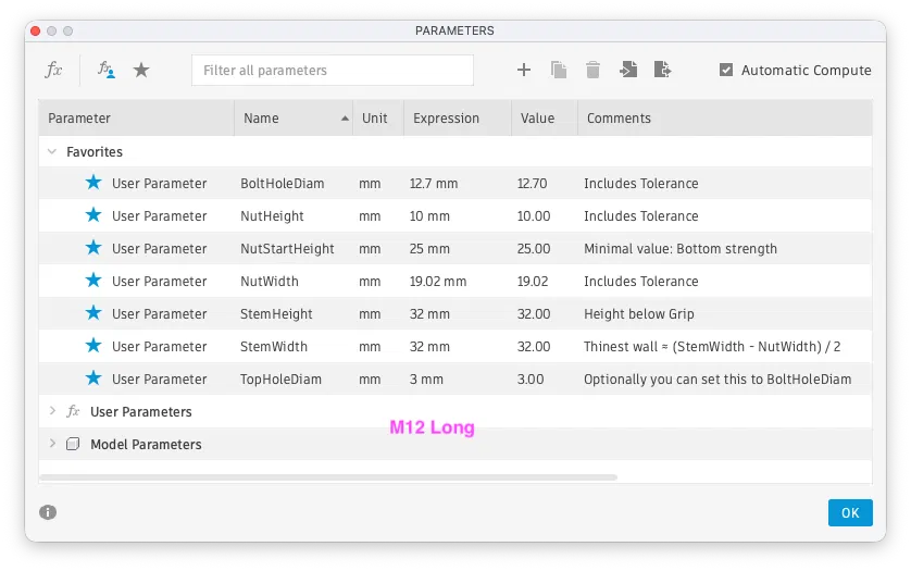Tay vặn Star Knob dạng parametric để thay wing nut cho các chỗ hay phải nới/siết. In PETG 100% infill cho rất chắc, có thể chèn “Pause” trong slicer để đặt đai ốc M8/M10/M12 vào đúng lớp.