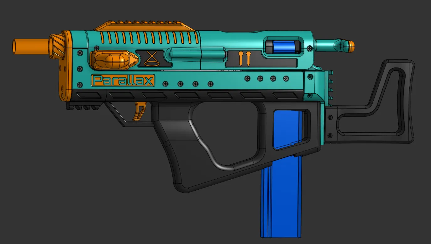 Parallax là bản remix của Foxbat Blaster (SillyButts), chuyển cơ chế từ Mag-In-Grip sang Bullpup. Hướng dẫn này gồm hướng đặt khi in, walls/infill, supports và các bước lắp ráp cùng vài món add-on.