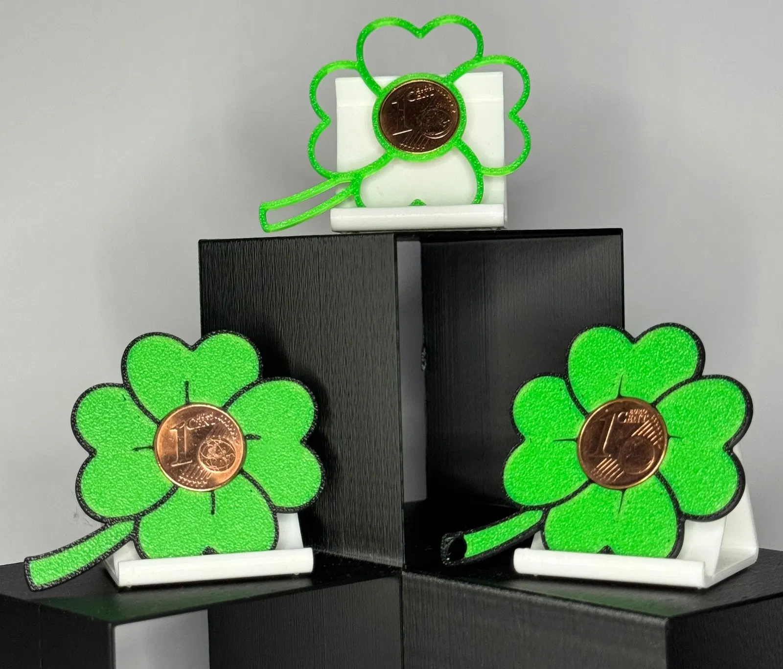 Mẫu “Glücksklee +1 Glückscent / Lucky clover +1 lucky cent” là cỏ bốn lá may mắn kèm “+1 đồng xu may mắn”, hợp để in 3D làm quà tặng sinh nhật, năm mới hoặc đồ trang trí mang ý nghĩa may mắn.