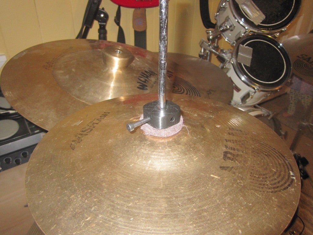 Clutch in 3D để gắn thêm splash cymbal 10" lên trên hi-hat cho bộ trống gọn hơn. Thiết kế dùng tán và bu-lông M4 (hoặc ốc #6/#8), đã cải tiến sau 6 tháng để chắc hơn và dời nut/bolt xuống dưới.