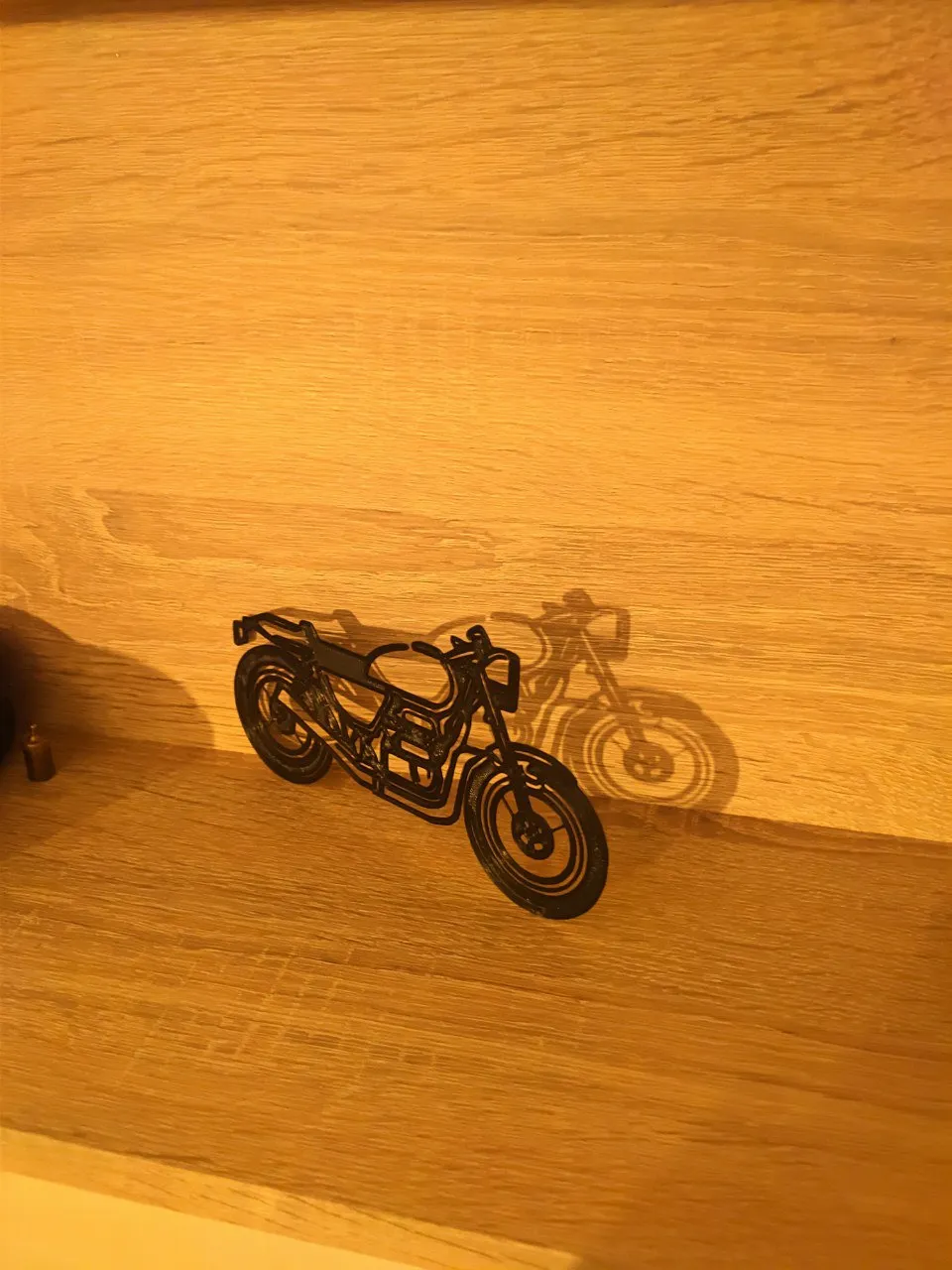 Tôi đã tạo ra tác phẩm điêu khắc trang trí này của một chiếc xe mô tô cafe racer hoàn toàn từ đầu. Bạn có thể điều chỉnh kích thước của nó, phóng to, thu nhỏ hoặc giữ nguyên kích thước phẳng, tương tự như những hình ảnh tôi đã cung cấp. Điều này cho phép bạn áp dụng băng dính hai mặt và sử dụng nó như một hình dán vinyl.