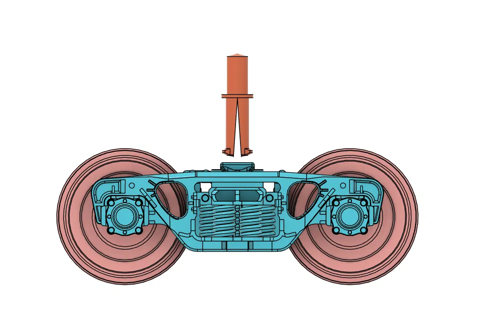 Thiết kế cập nhật dùng một trục kẹp (printed clipping axle). Trục này có thể dán keo thẳng vào đáy toa, hoặc chỉ giữ bằng ma sát tuỳ theo bạn thích kiểu nào. Sau đó bogie sẽ bấm “snap” vào trục, tạo mối nối gọn, chắc, và lắp ráp rất nhanh mà không cần vít. Khi cần tháo bogie khỏi toa, chỉ việc bóp các ngàm kẹp của trục và đẩy nó ra.