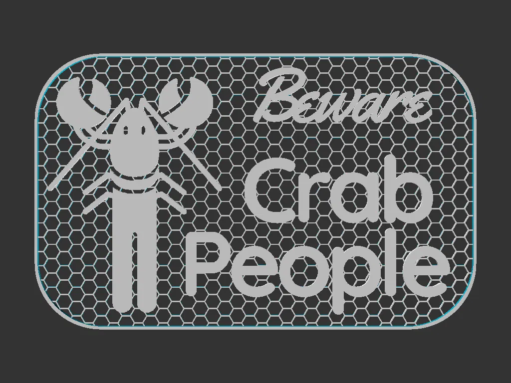 Bảng hiệu 3D print 100x160mm với dòng chữ “Beware Crab People” và hình crab people. Có file Mesh và Solid, khuyến nghị đổi màu trên 1mm (kèm gcode). Phù hợp dùng với Shadowbox Frames.