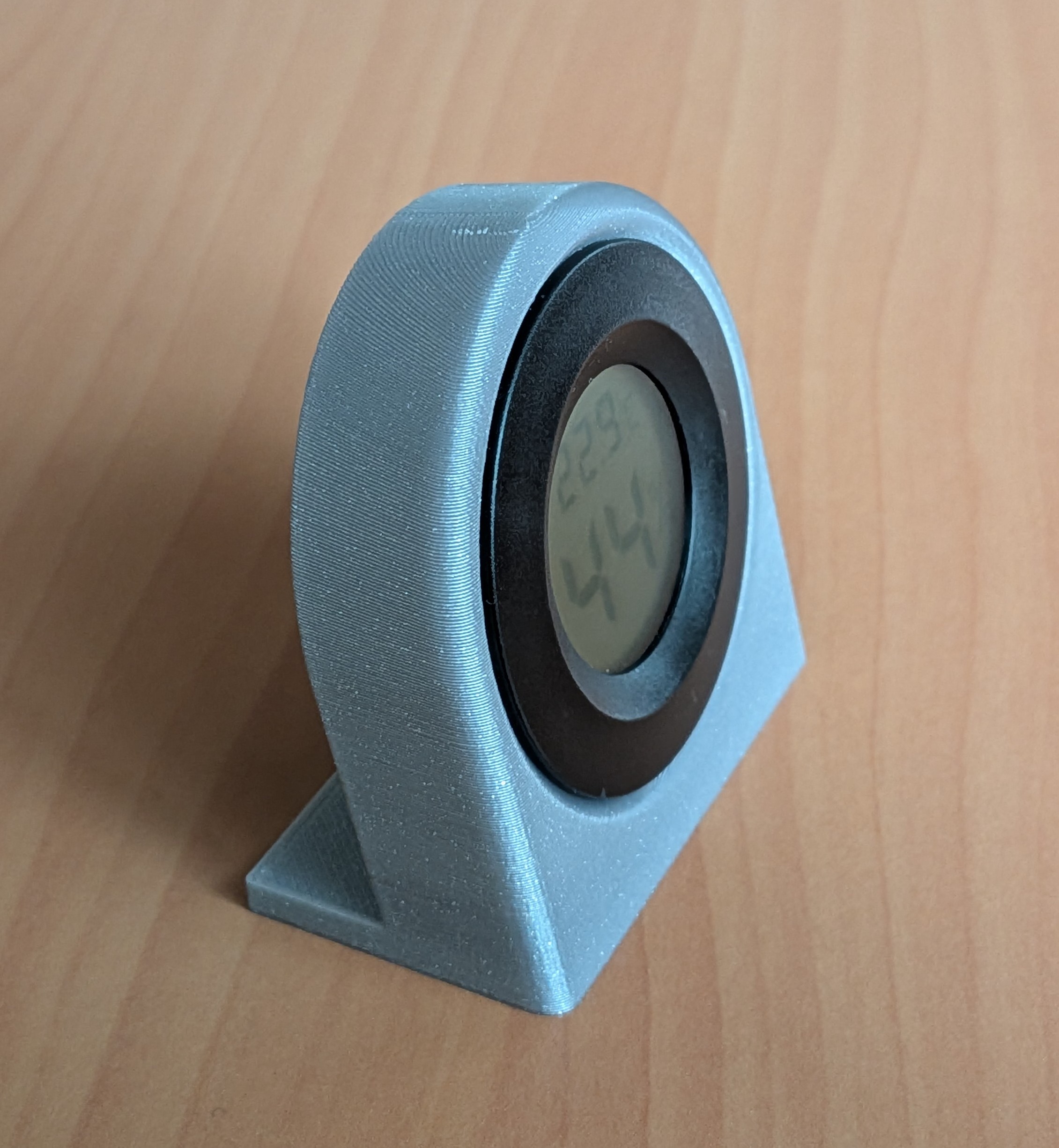 Đế in 3D cho đồng hồ hygro-thermometer mini dạng tròn 4.5cm (1.77", mẫu Trung Quốc). In được không cần support; phần overhang phía trong có thể hơi sần nhưng sẽ được thiết bị che lại. Có bản V8 kèm .3mf.