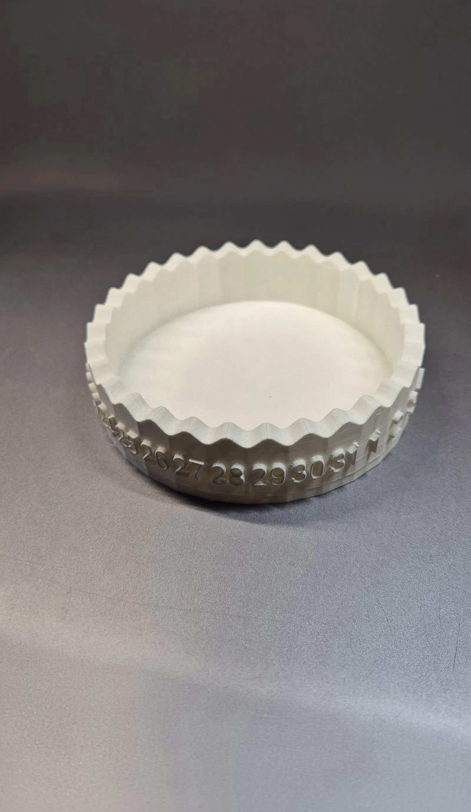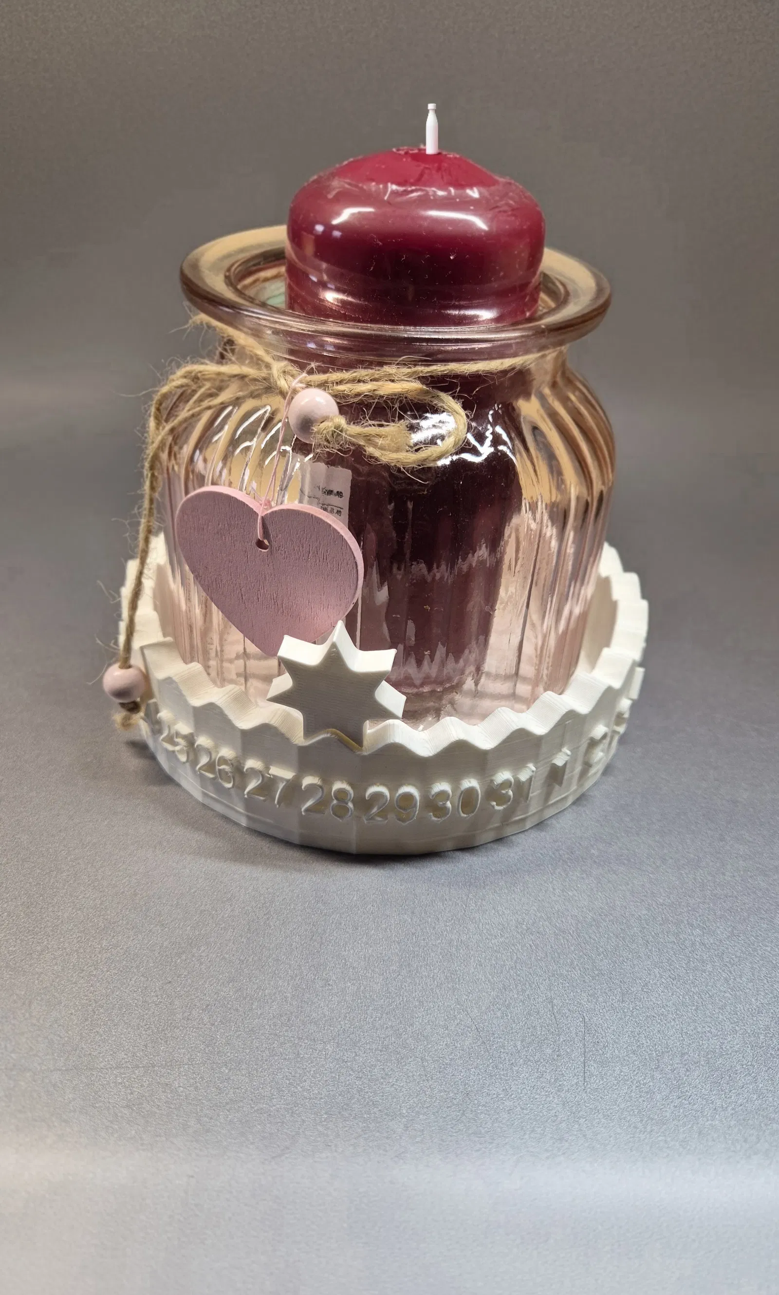 Lịch trang trí dạng vòng (1–31) có chỗ đặt nến ở giữa. Ngôi sao rời dùng làm marker, mỗi ngày dịch sang số kế để đánh dấu ngày hiện tại. Dễ in với Supports, phù hợp PLA.