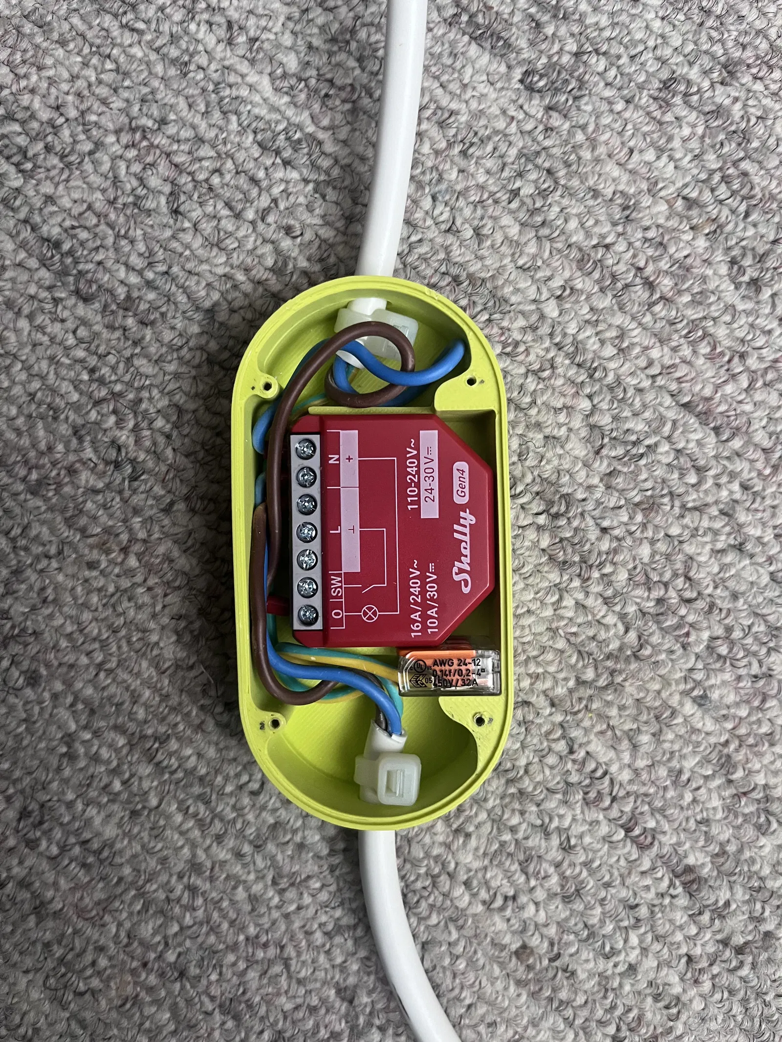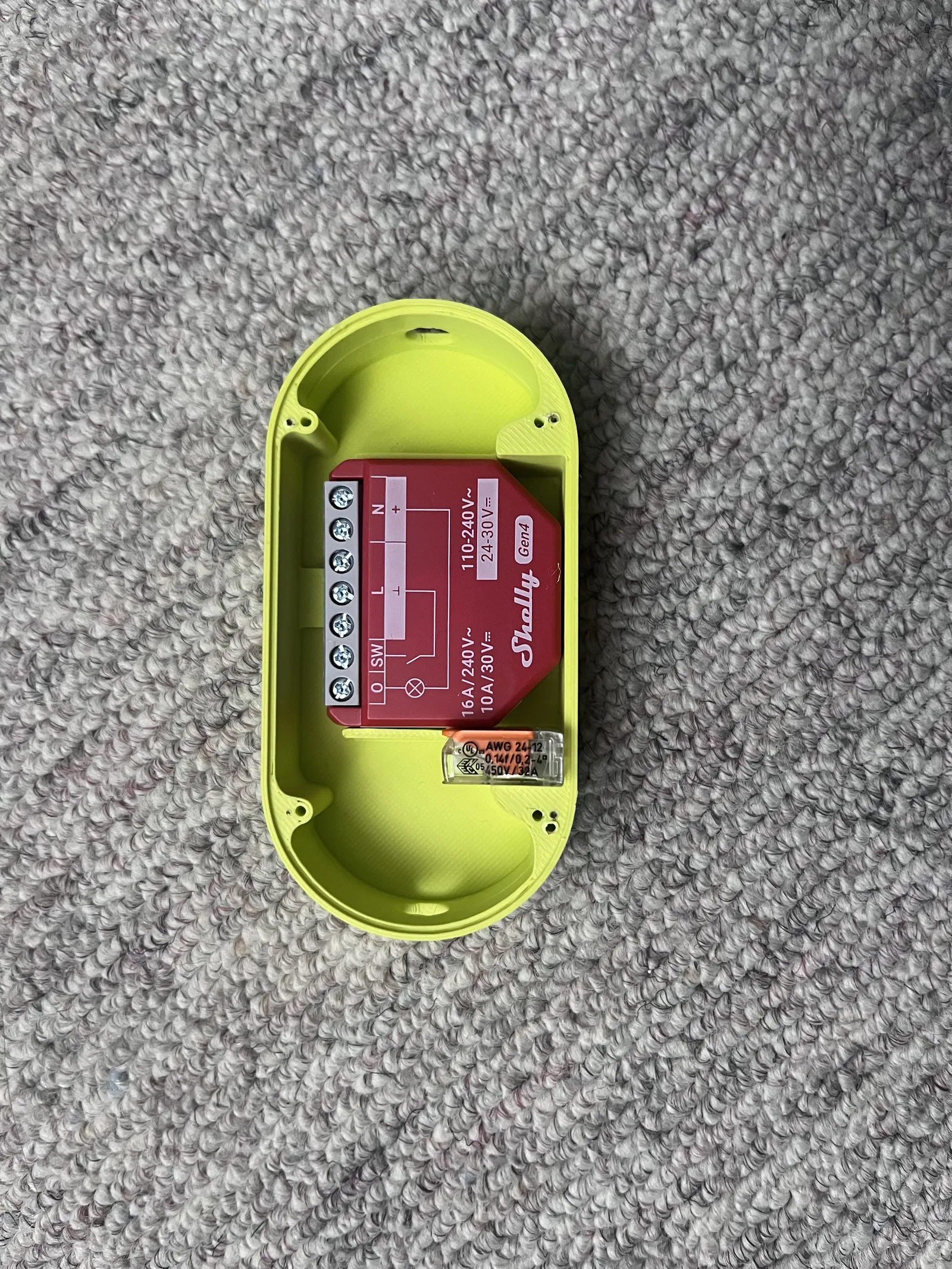 Một cái vỏ (case) cho Shelly 1PM hoặc loại tương tự, kèm theo một Wago 221 cho dây PE (tiếp địa). Có chống tuột dây (strain relief) bằng dây rút. Nắp được bắt bằng 4 con vít 2x10.