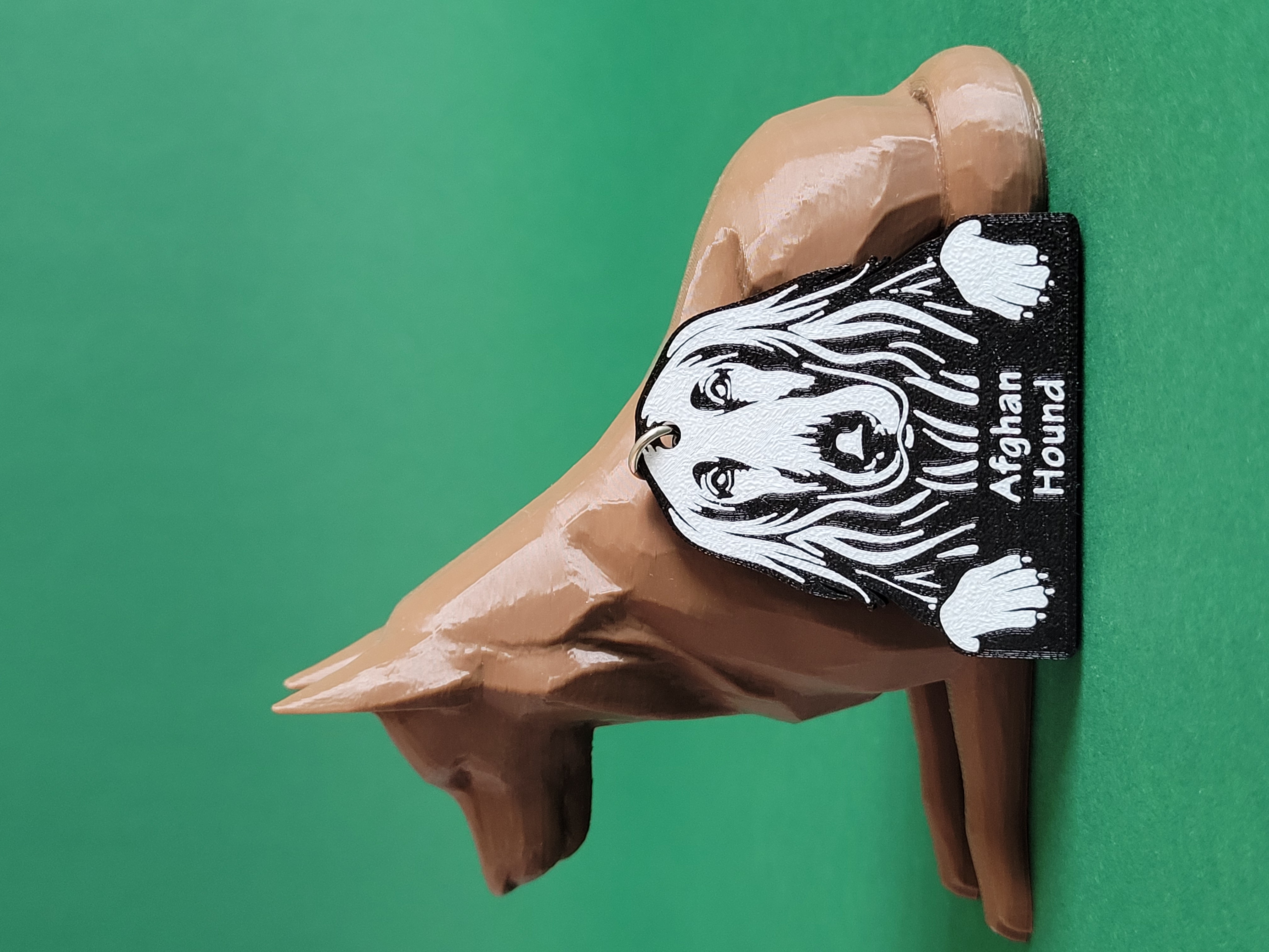 Mẫu móc khóa Afghan Hound (Afghan Hound Keychain) dễ in và có thể tùy biến thêm tên thú cưng. Hướng dẫn xóa “text_shape”, thêm chữ, căn giữa giữa hai “paws”, rồi split/merge và chỉnh filament sequence (trắng trước đen) để ra chi tiết đẹp.