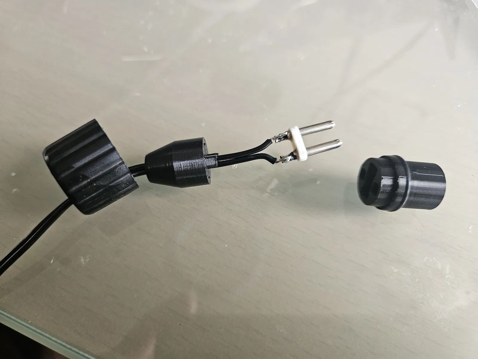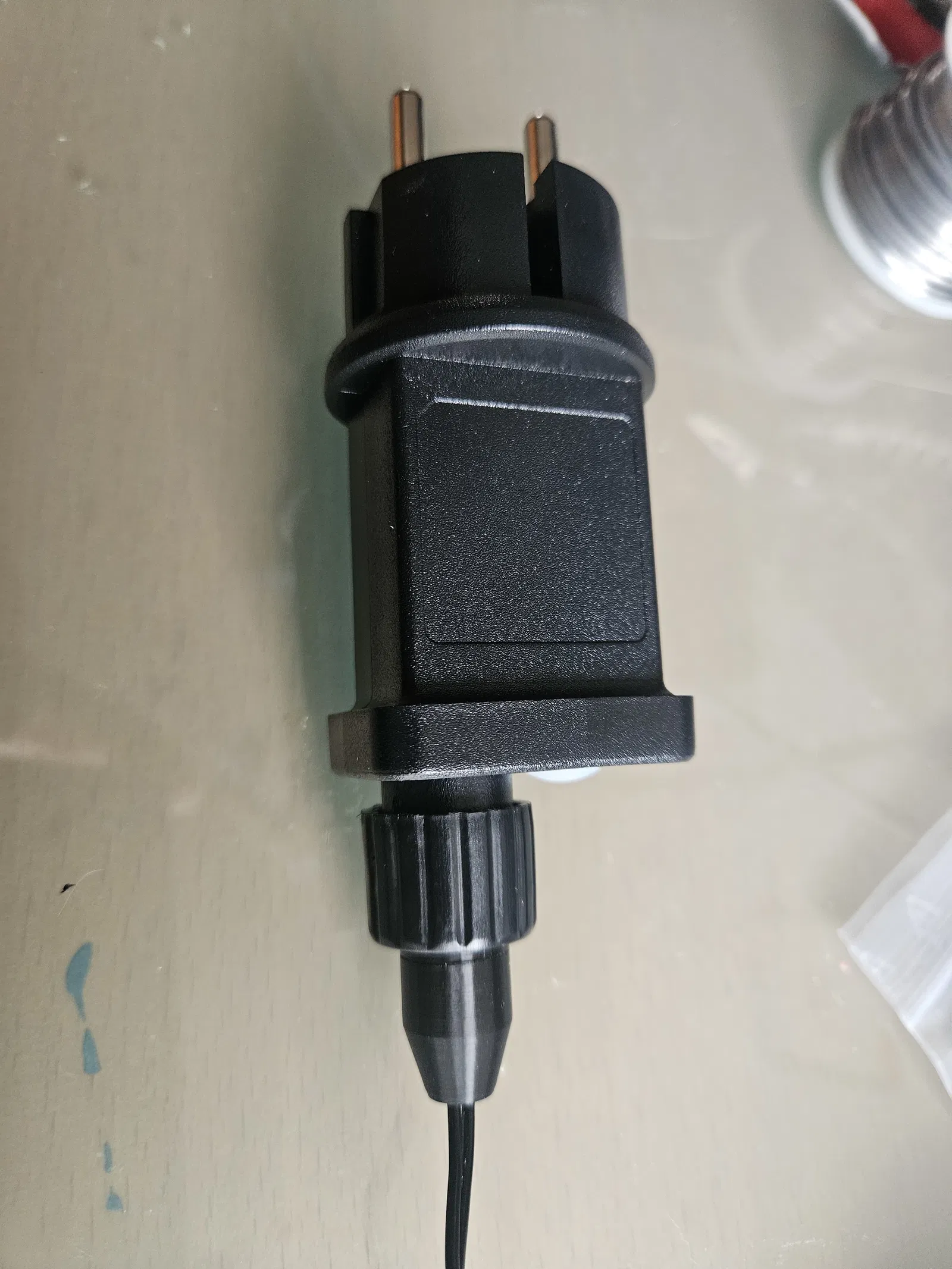 Đầu cắm thay thế cho bộ nguồn của dây đèn ngoài trời khi dây bị chó cắn hỏng. Thiết kế để tận dụng lại cụm chân pin và gioăng cao su từ đầu cắm zin; khi lắp nhớ chú ý polarity, dây có vạch xám là cực dương.
