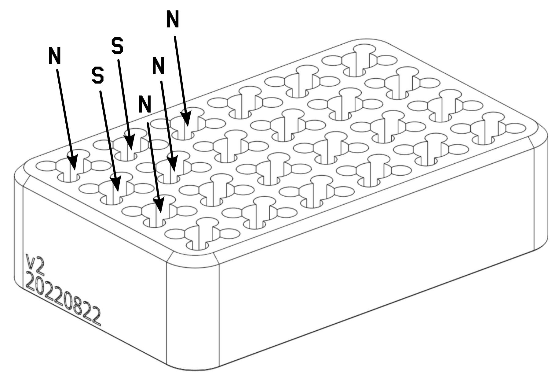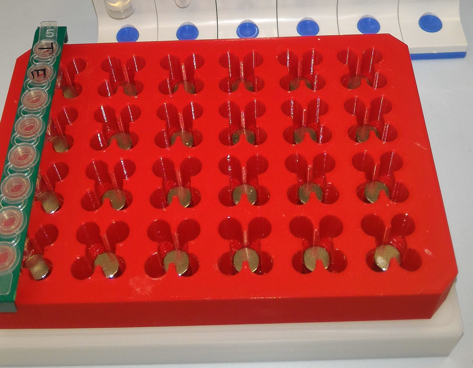 Giá tách hạt từ (magnetic bead) cho PCR strip 8 giếng. Nó không vừa nguyên một khay 96 well: chỉ các strip mới vừa và canh thẳng theo chiều dọc (xem hình). Tuy vậy, bạn vẫn có thể đặt đủ tất cả các cột để đạt tổng 96 giếng. Cách làm này nhằm tăng độ mạnh trường EM (và tốc độ tách) khi dùng nam châm ø10mm có sẵn.