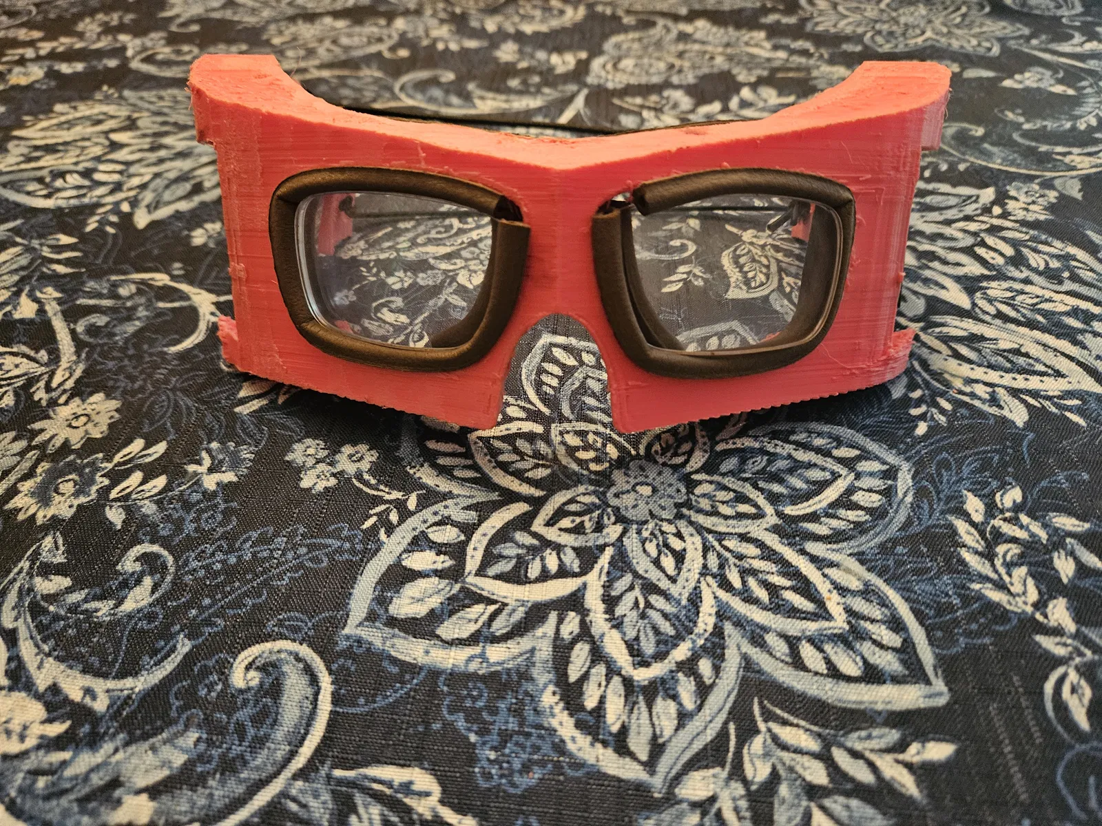 File lens.stl (hoặc bất kỳ model hình dáng tròng kính nào bạn có) có thể copy, di chuyển, mirror và scale để dùng làm “khuôn cắt” cho hình học của phần goggles.stl (mình làm bằng cutting mesh, 0 walls và 0 infill density). Mình khuyên in với lỗ mũi hướng lên trên và phần gắn dây phía sau đặt phẳng trên mặt bàn in. File goggles.stl cũng có thể scale để vừa với người đeo.
