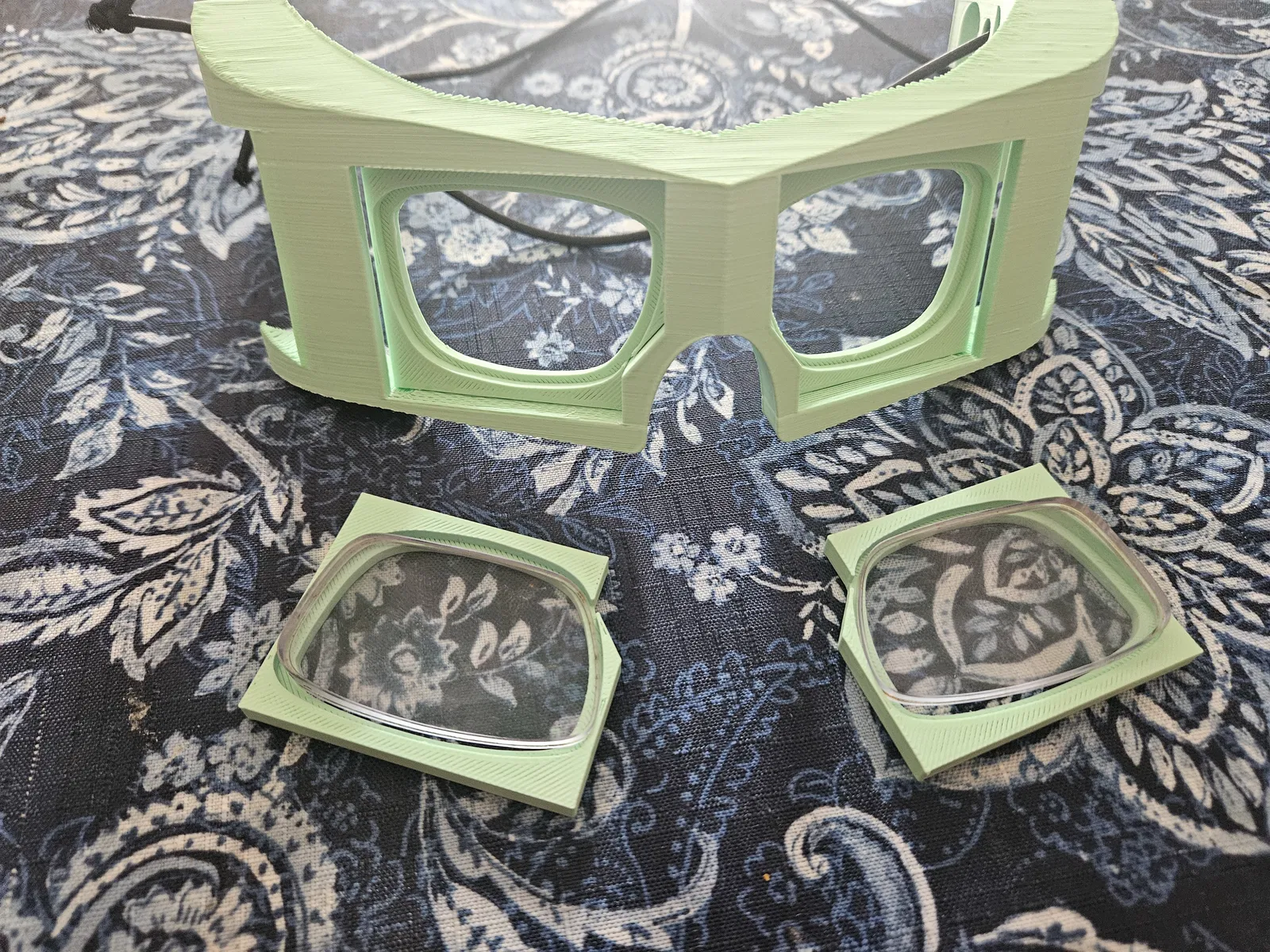 Cùng ý tưởng như v1 nhưng hoàn thiện đẹp hơn. In đôi phần giữ lens, cắt 2 lớp hình lens (một lớp không xuyên, một lớp xuyên) rồi mirror để kẹp kiểu “sandwich”. v2.1 có bumper TPU in được để đeo êm hơn.