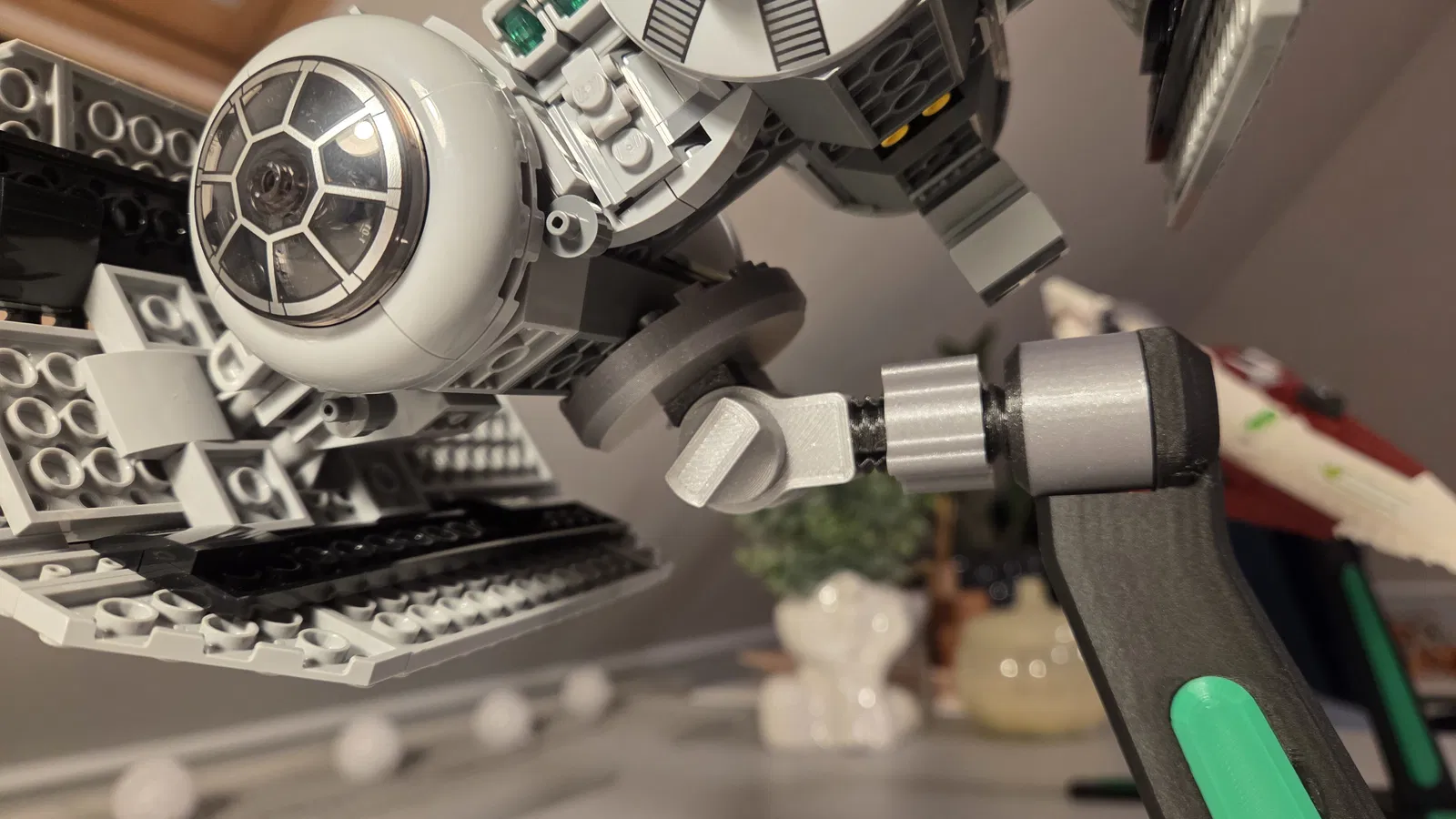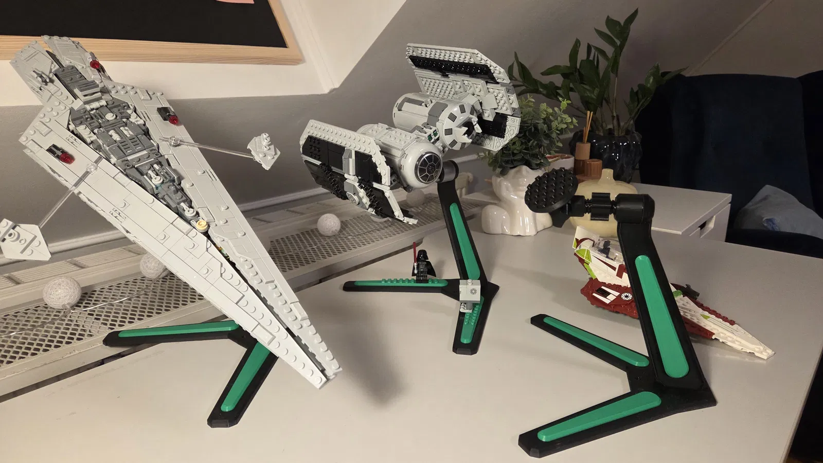 Chân đế đơn giản để trưng bày tàu vũ trụ hoặc máy bay Lego. Có thể chỉnh độ nghiêng của tàu theo hai mặt phẳng, kẹp cố định bằng ốc; một số chi tiết màu dán keo vào đế và có bản gắn minifig.
