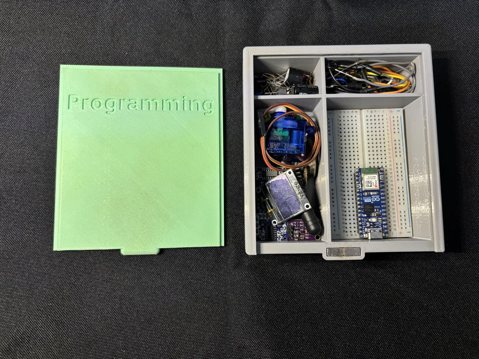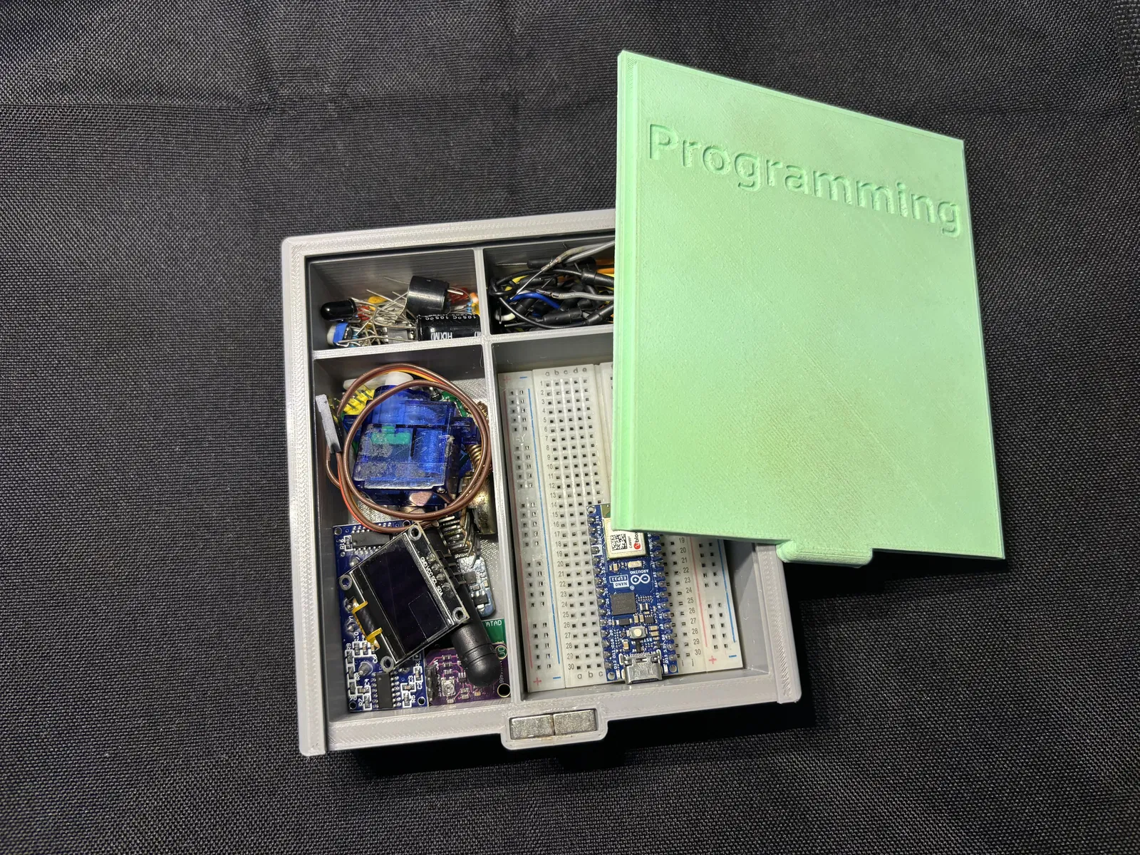 Mẫu hộp trượt gọn nhẹ để mang theo Arduino khi đi đây đó. Có thể chứa Nano/Mini/ESP32, tối đa 10 cảm biến, linh kiện như LED/transistor/điện trở/tụ và đặc biệt là dây jumper. Cần 4 nam châm 2x10mm.