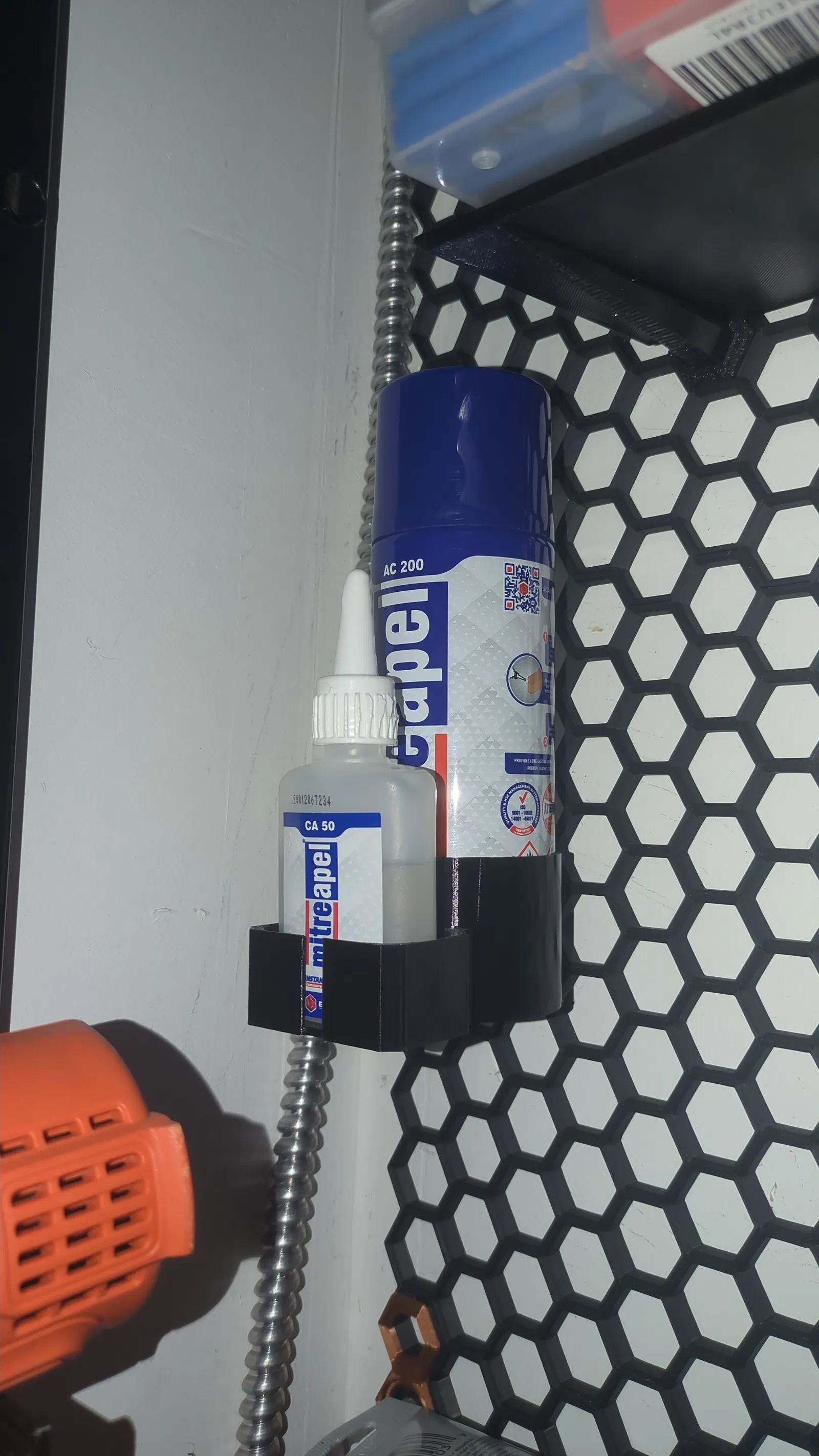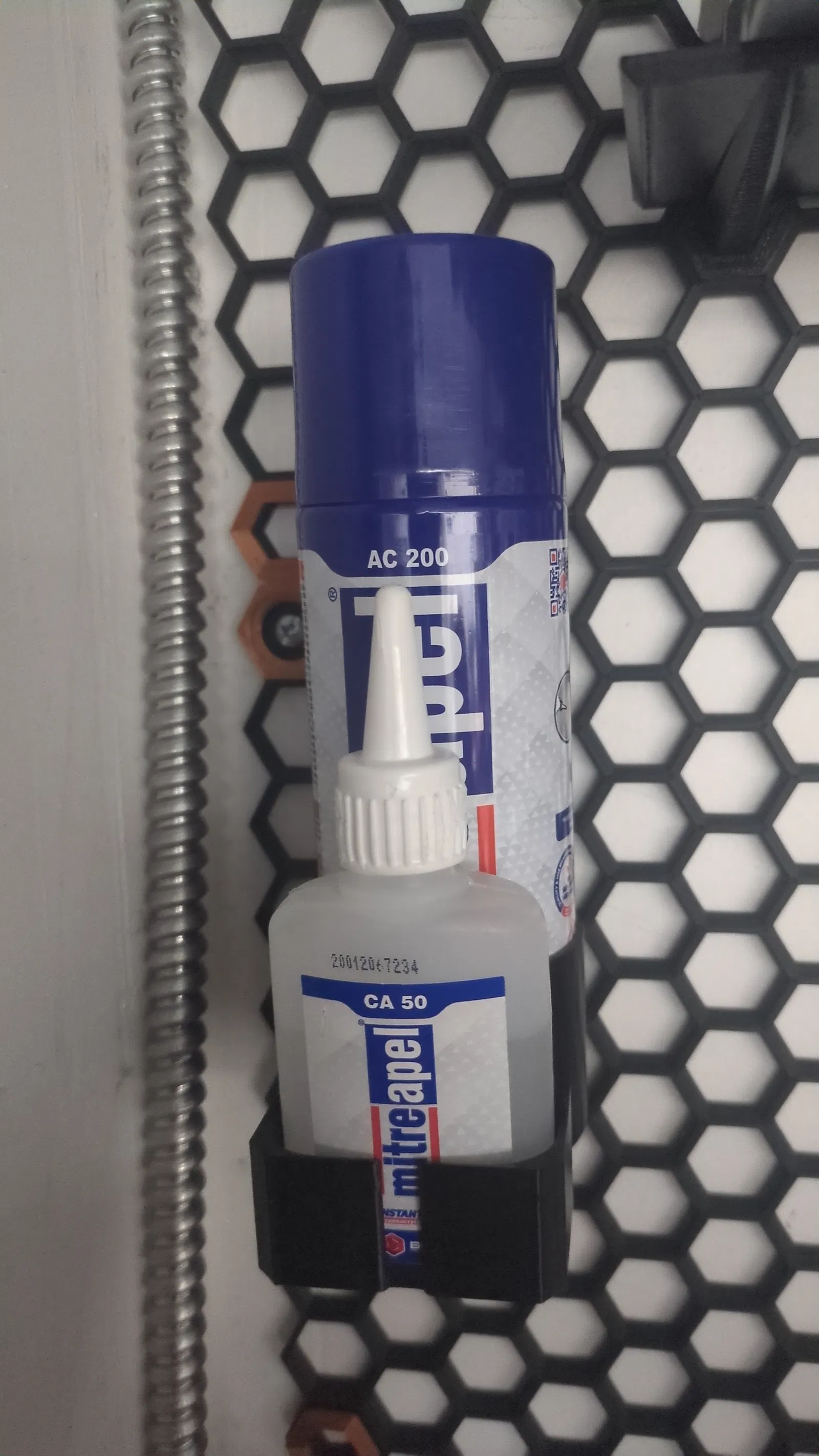 Phụ kiện gắn lên Honeycomb Storage Wall (HSW) để giữ chai keo CA và bình activator dạng xịt của hãng Mitreapel. Thiết kế đơn giản, không cần support; có kèm file .f3d để import vào Fusion nếu muốn chỉnh sửa.