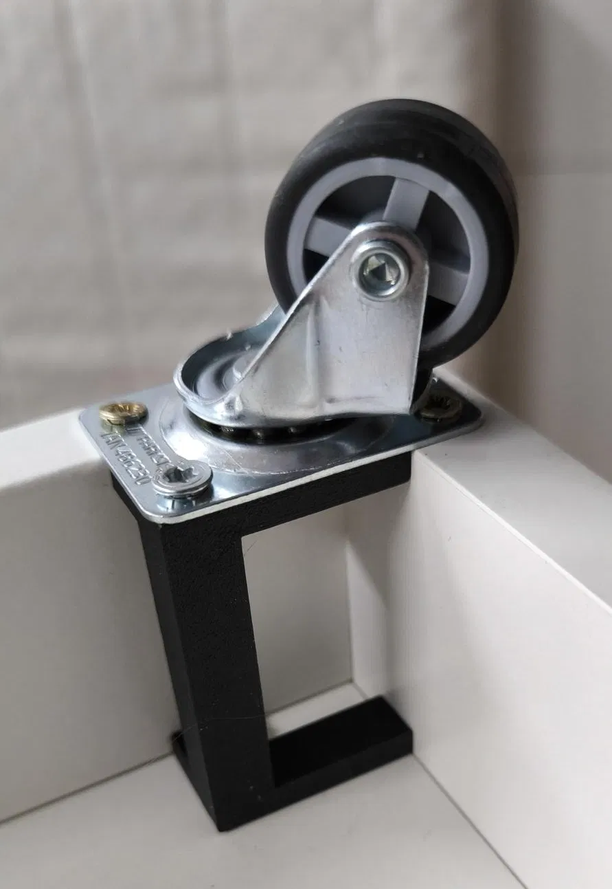 Mình đã đặt Trofast của mình lên các bánh xe nội thất (Möbelrolle). Đây là một miếng đỡ để có thể bắt cố định đủ cả 4 điểm của tấm kim loại hình chữ nhật, đồng thời tránh việc bị ấn/lún đẩy vào phía sau ở vị trí này.
