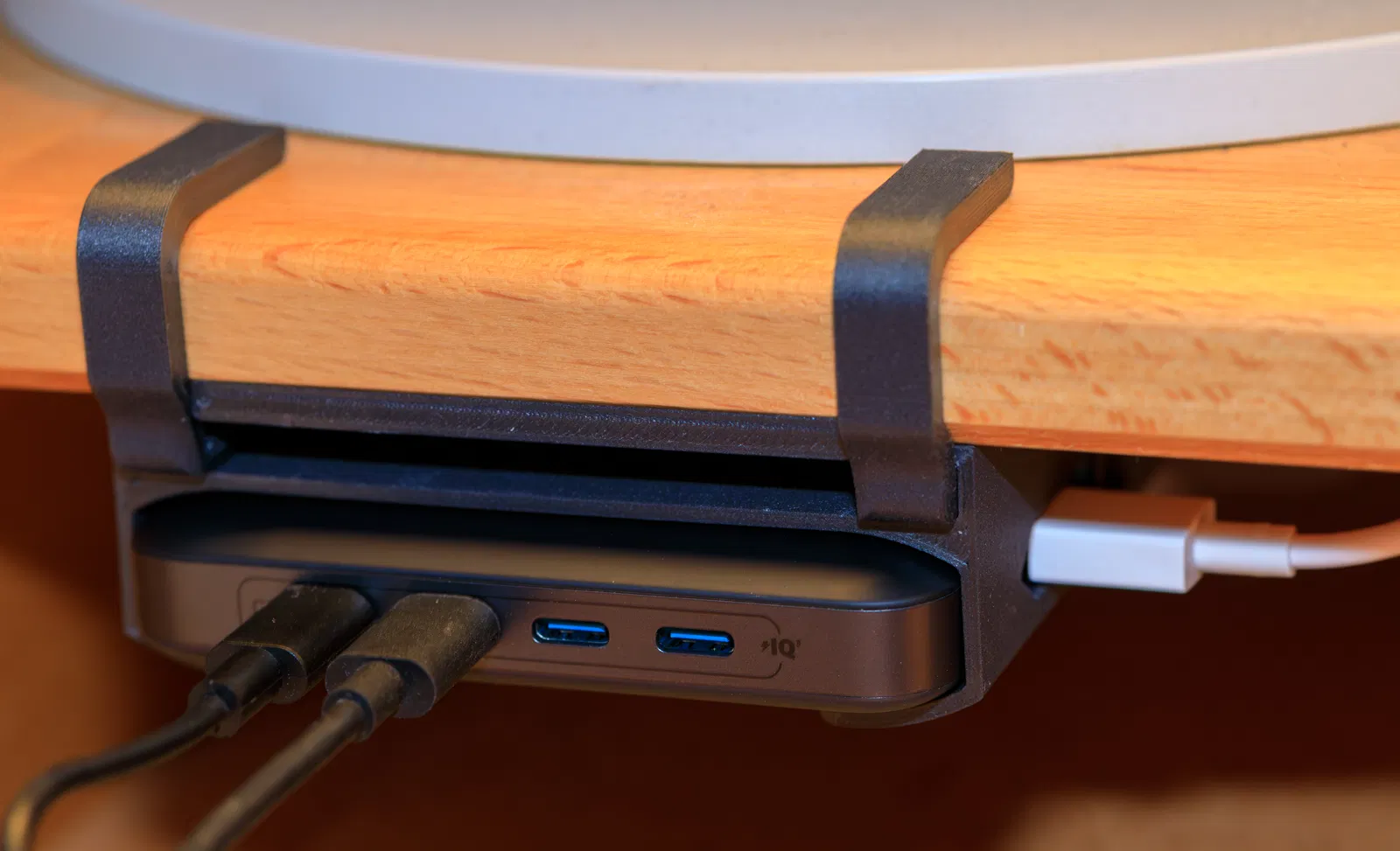 Đây là một giá đỡ cho Anker Nano Charger. Mình muốn gắn nó để nó không nằm trên mặt bàn, nơi có thể bị che mất. Để nhiệt thoát lên phía trên, khe ở phía trên có lỗ thông gió. Các kẹp (clamp) để kẹp lên bàn sẽ được dán vào khe này.