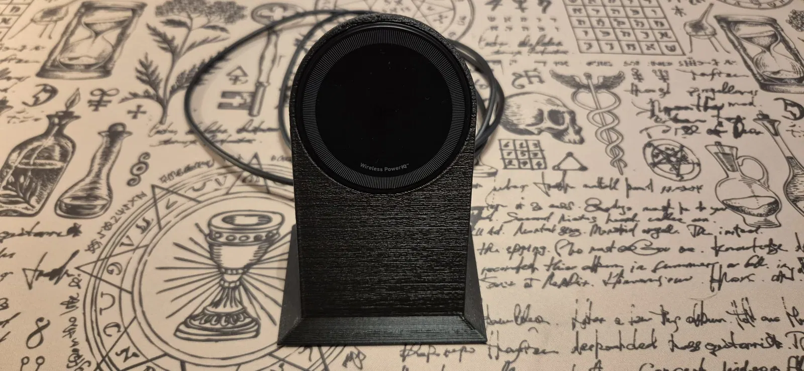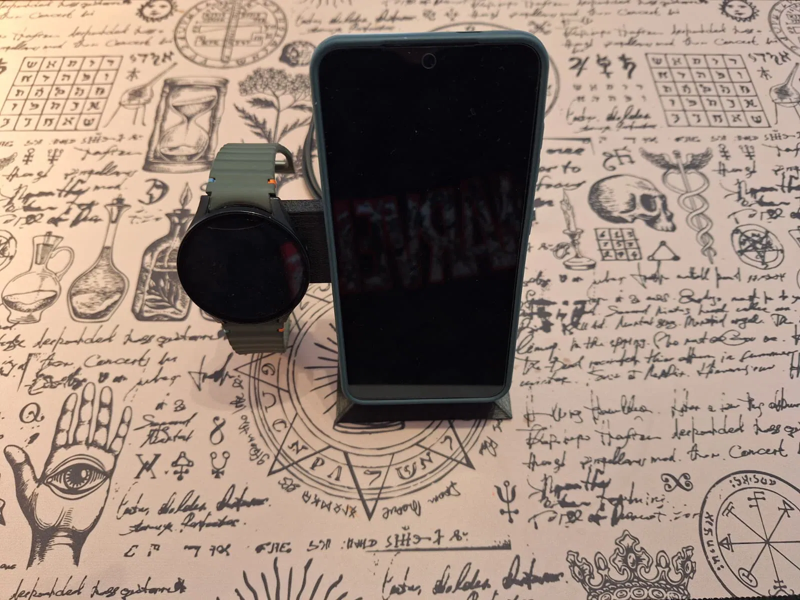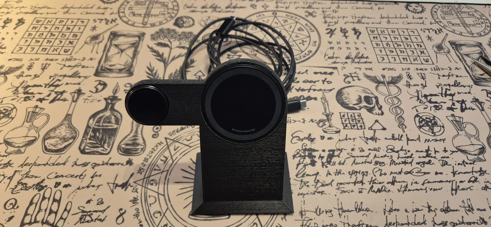 Cái stand này được thiết kế để đỡ một chiếc điện thoại có hỗ trợ sạc không dây và Samsung Watch 7. Rất tiện để gom hai thiết bị chung một chỗ trên bàn làm việc hoặc đầu giường trong lúc sạc.