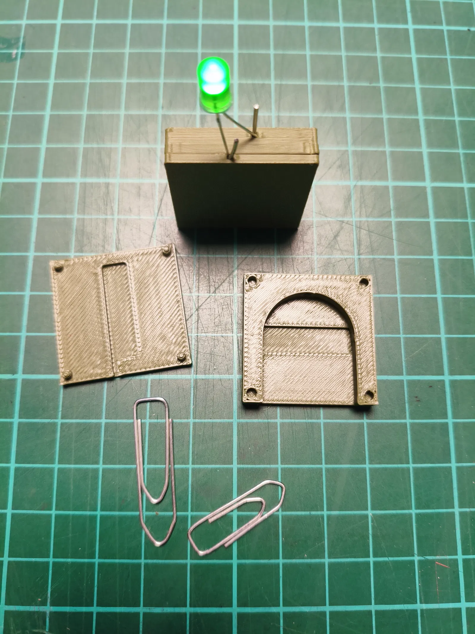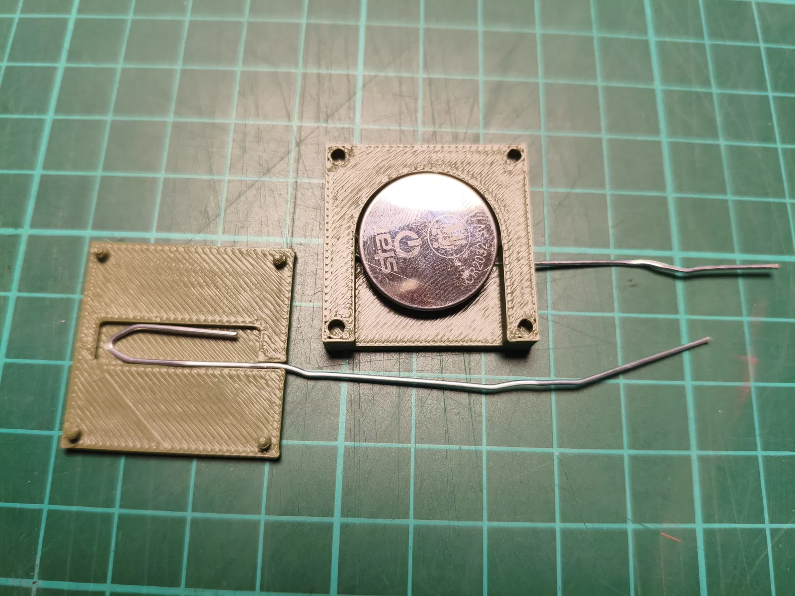 Halterung/đế giữ pin cúc áo CR2032 (CR-2032) để đấu nối và hàn dây cho các dự án nhỏ. Dùng kẹp giấy tạo tiếp xúc điện, có lỗ đẩy pin ra. In bằng PLA/PETG, không cần support/brim.