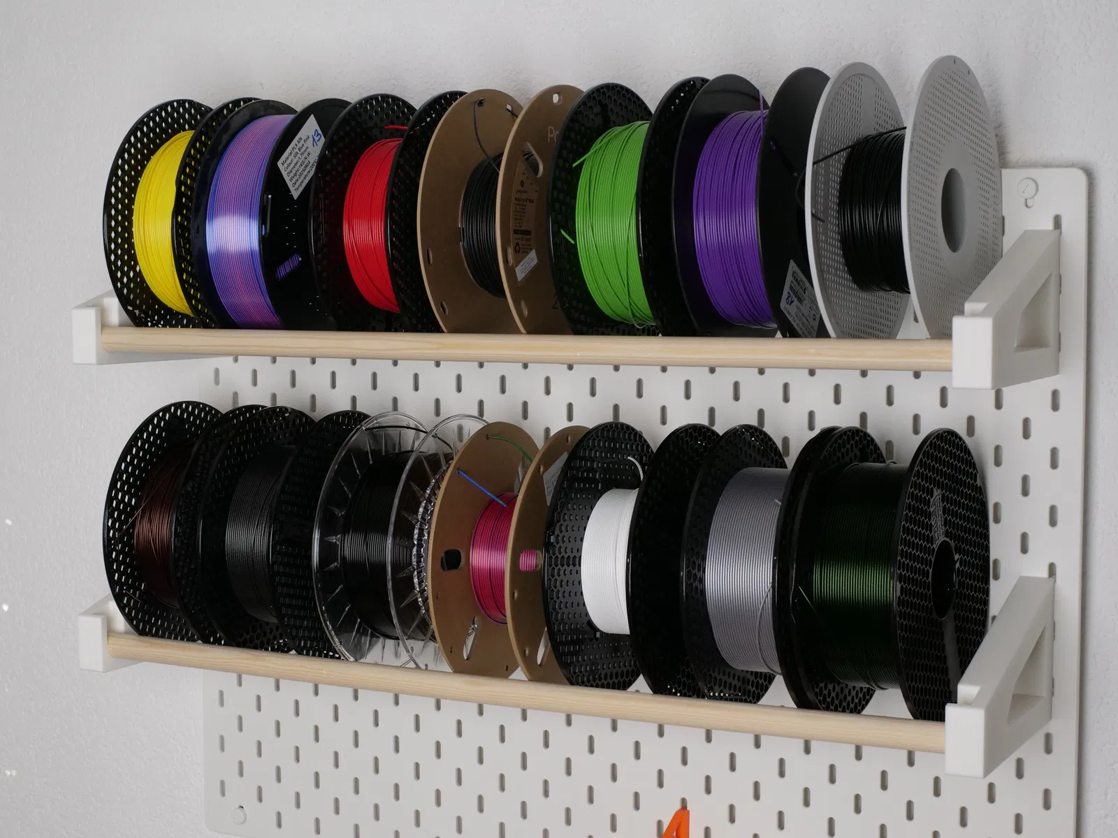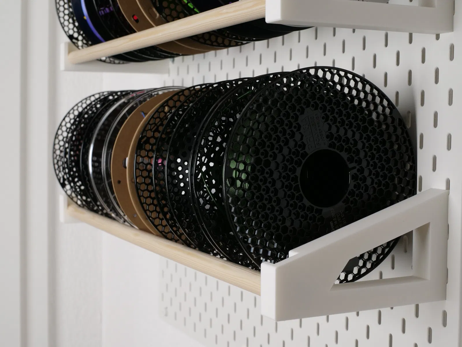 Đây là một giá treo cuộn filament cỡ lớn cho nhiều cuộn, gắn vừa với pegboard IKEA Skadis.