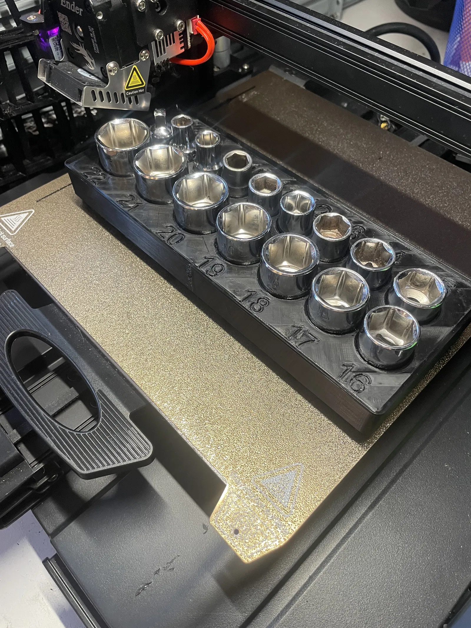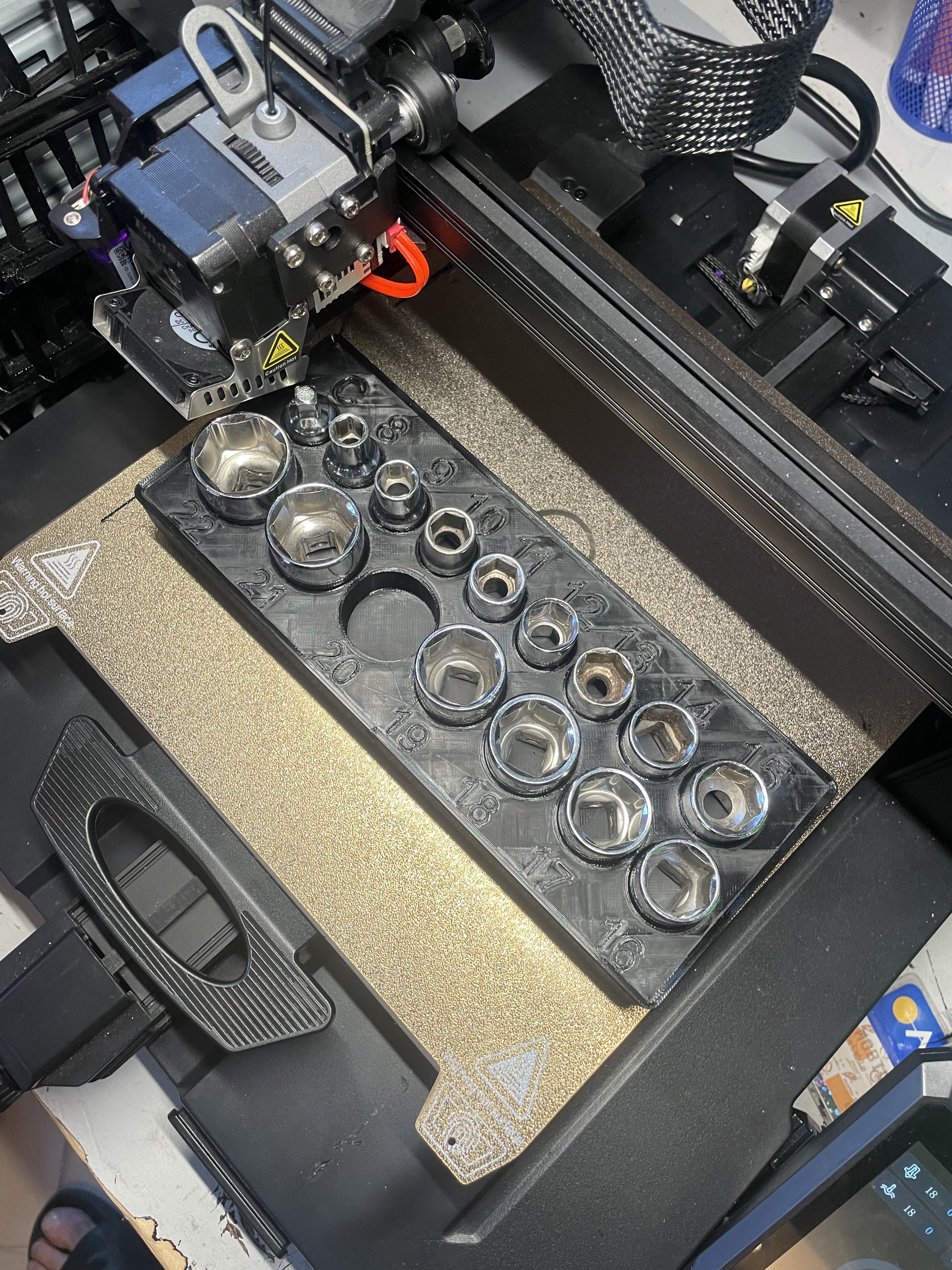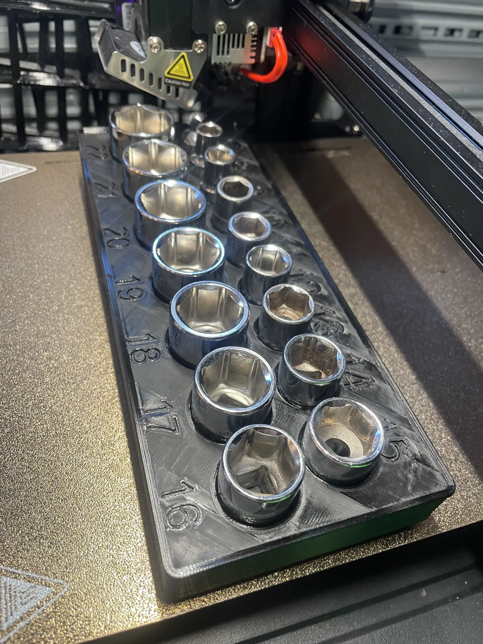 Kệ Gridfinity dễ đọc nhất cho bộ tuýp hệ mét của bạn. Module 5x2 này được thiết kế để giữ các đầu tuýp chuẩn 1/2" hoặc 3/8" từ 8mm đến 22mm.