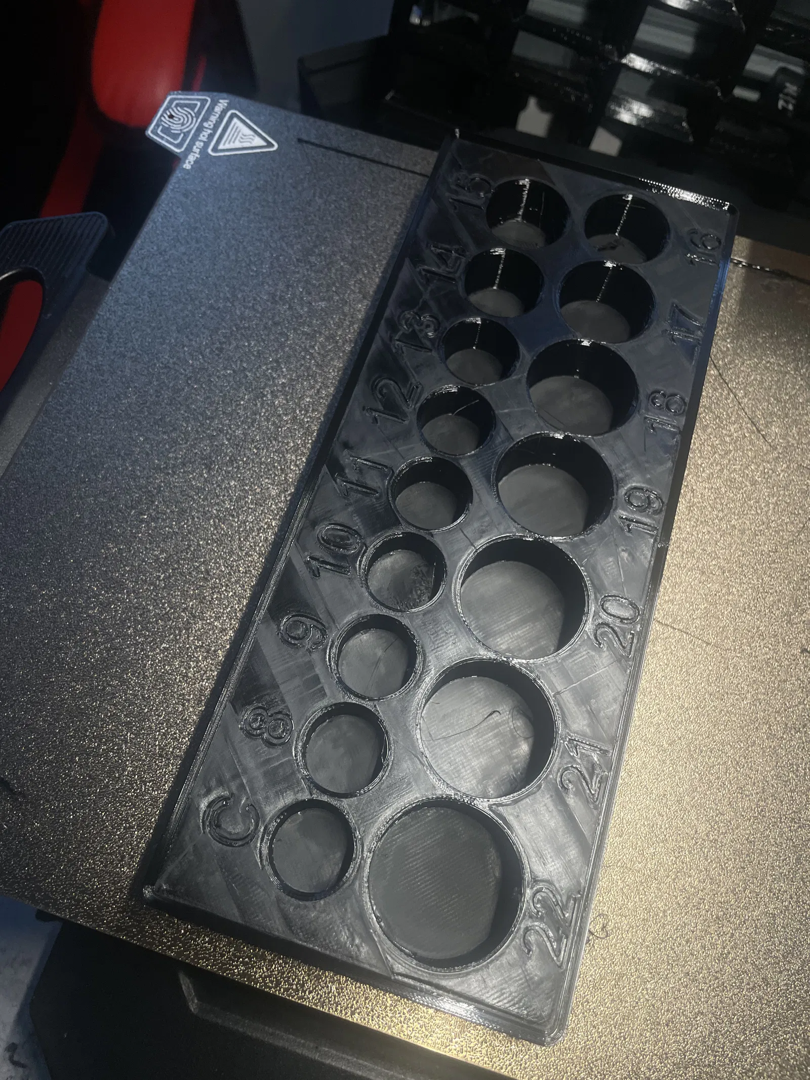 Module Gridfinity 5x2 dành cho đầu tuýp hệ mét 8–22mm (chuẩn 1/2" hoặc 3/8"). Bố cục snaking tối ưu diện tích, số khắc lớn dễ đọc, lỗ vát mép giúp lắp tuýp nhanh.