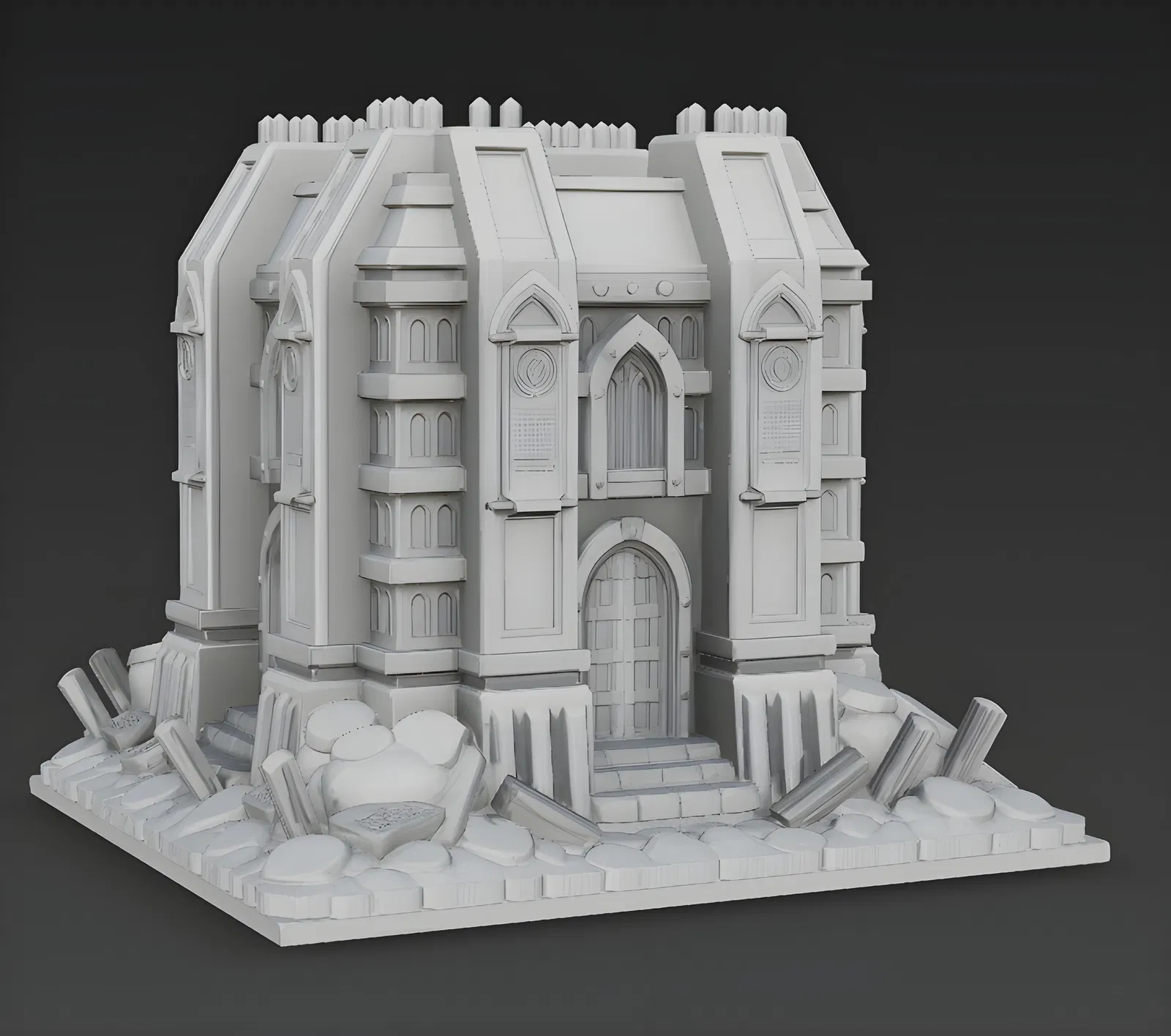 Mẫu địa hình dạng lăng mộ phong cách gothic cho Warhammer/WH40K, dùng làm prop để dựng bối cảnh, tạo không gian chiến trường và diorama. Phù hợp cho mini, terrain, DnD và worldbuilding.