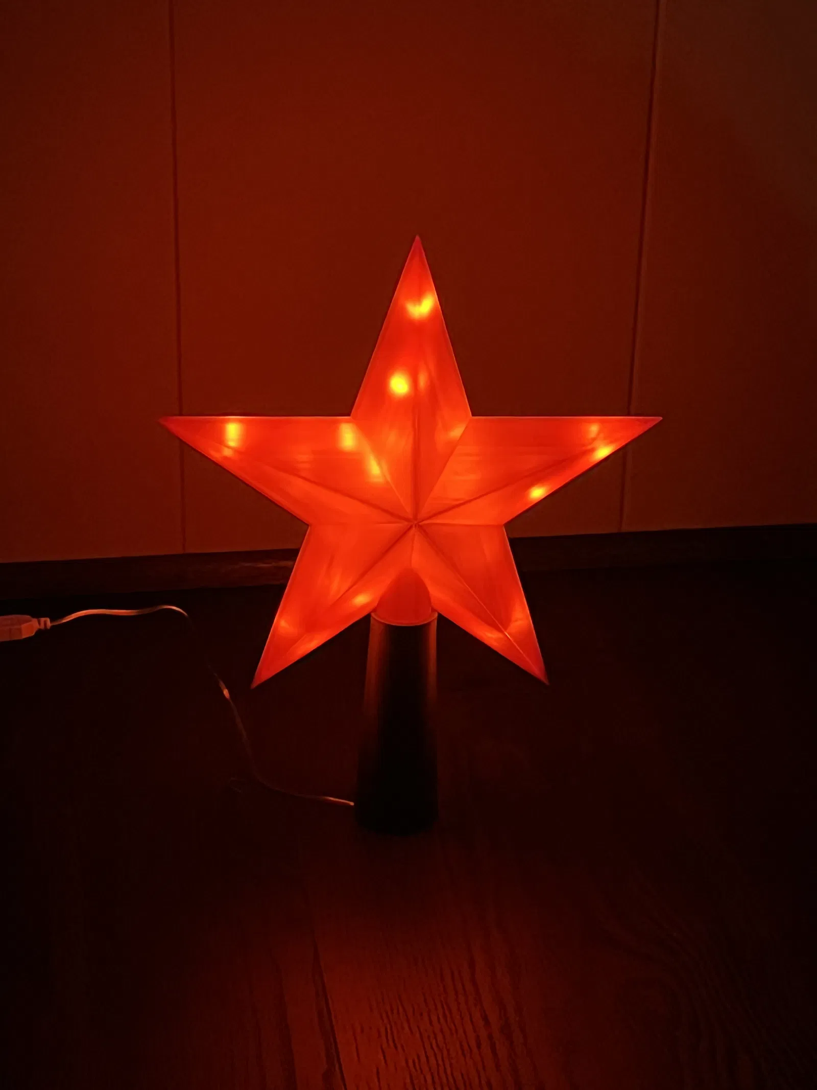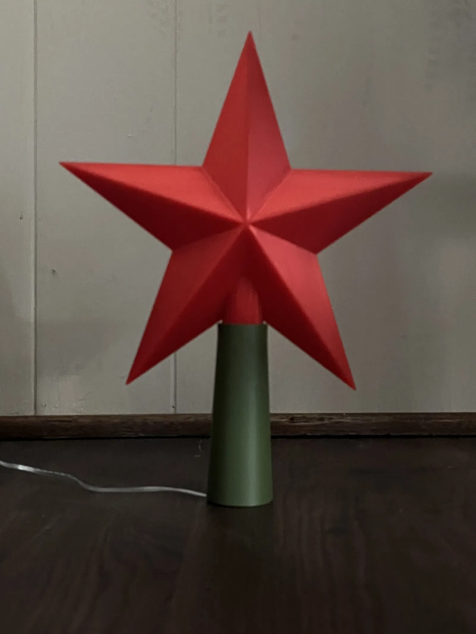 Mẫu ngôi sao gắn chóp cây thông Noel có điểm cố định để quấn fairy lights. Gồm 2 bản: interlocking (có gờ canh, cần supports) và flat (in không cần supports). Gợi ý infill 100% với concentric để lên màu đẹp.