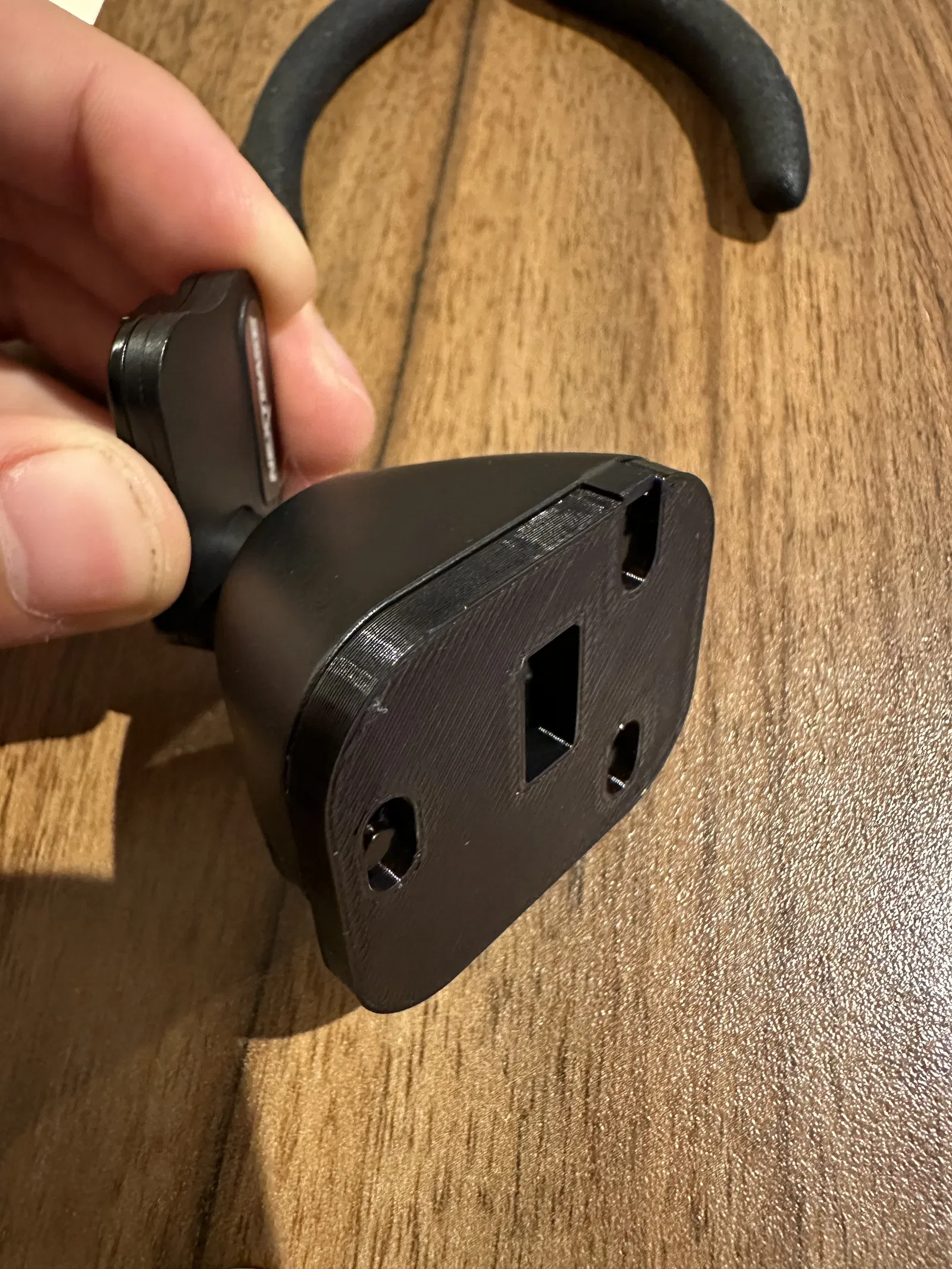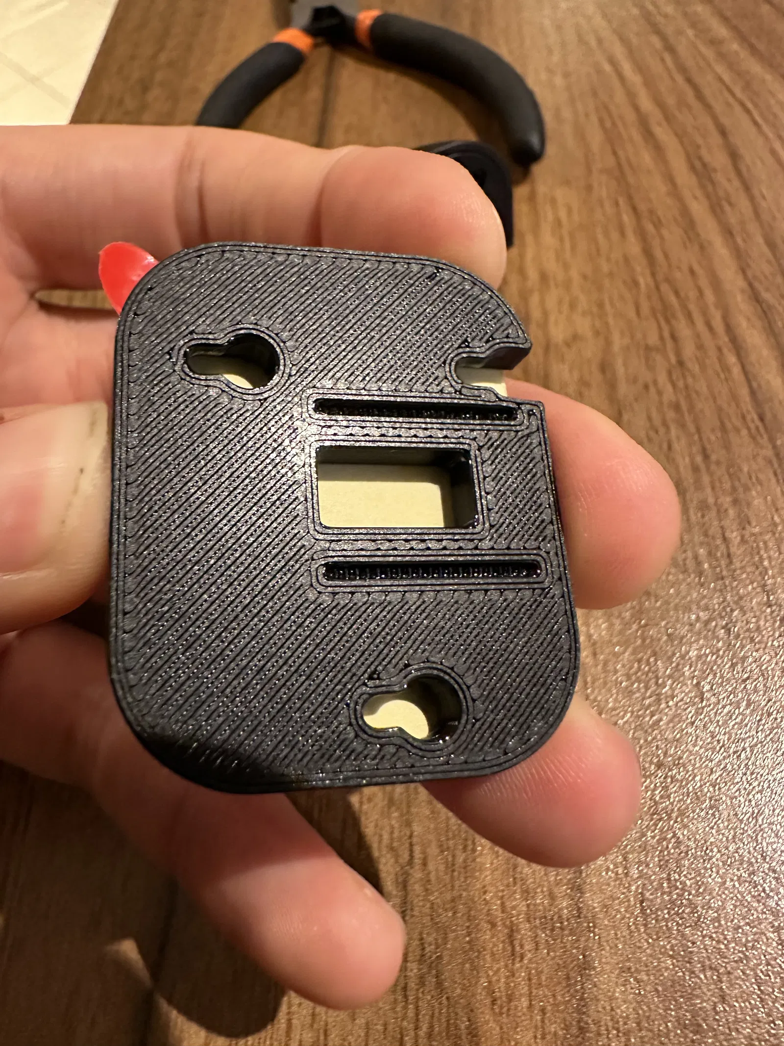Mình bỏ luôn cái “clicky bit” ở giữa; thay vào đó chỉ còn một lỗ cắt hình chữ nhật, vì phần đó in cực kỳ mệt, có hoặc không có support cũng khó, nhất là khi dùng PETG (mà mình ưu tiên vì chịu nhiệt tốt hơn). Dù vậy, cái này vẫn khóa vào khá chắc ngay cả khi không có miếng đó, nên mình sẽ để nó là một khoảng cutout :)