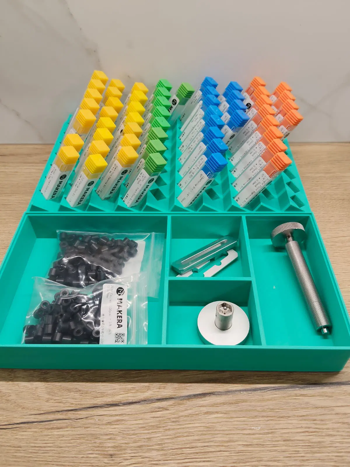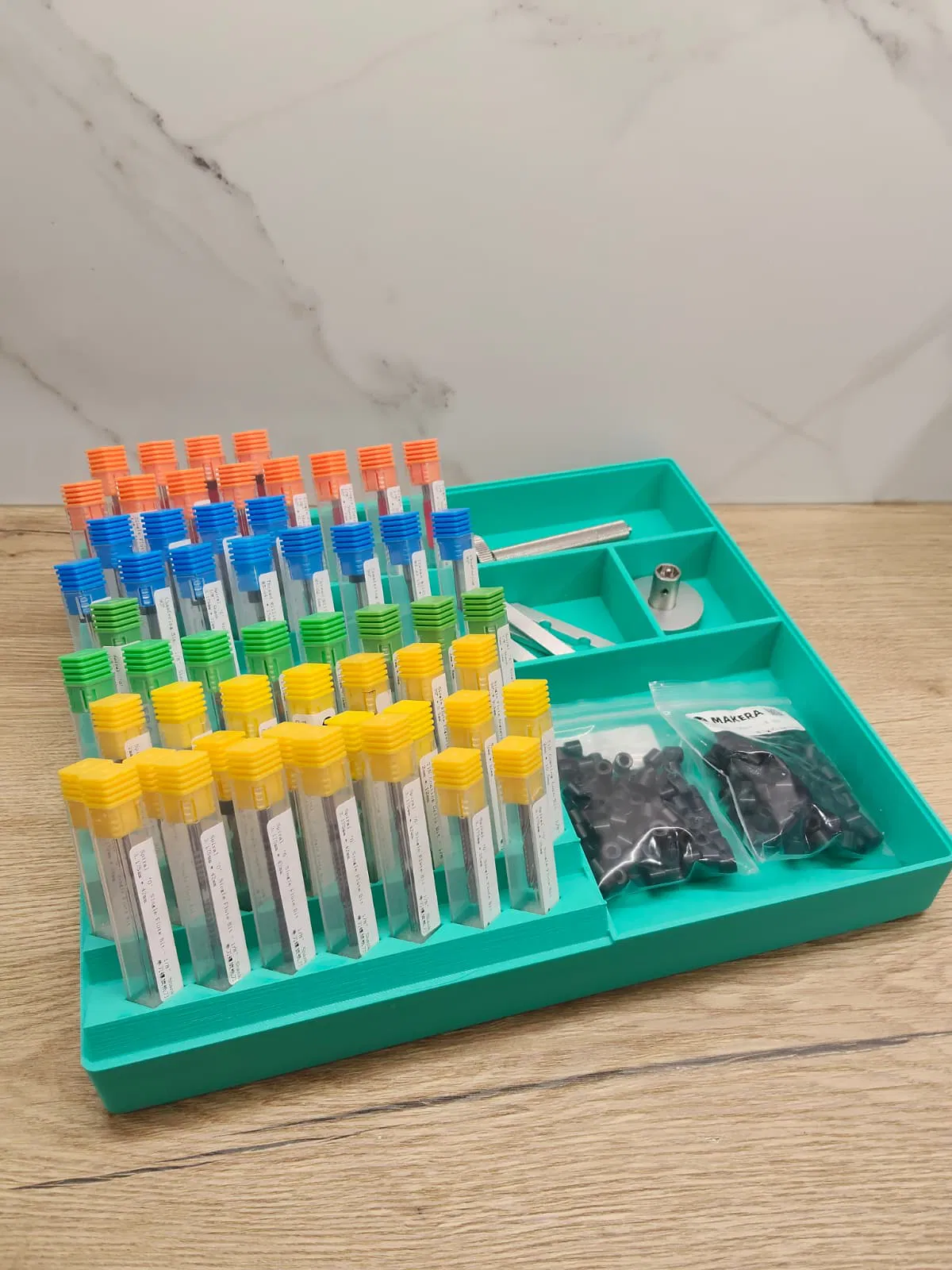 MAKERA tools organizer giúp cất gọn và phân loại dụng cụ nhỏ/phụ kiện theo từng khu vực mã màu. Thiết kế nhỏ gọn, dễ lấy đồ, in PLA hoặc ABS cho độ bền tốt, đế phẳng lớn cần bám dính ổn.