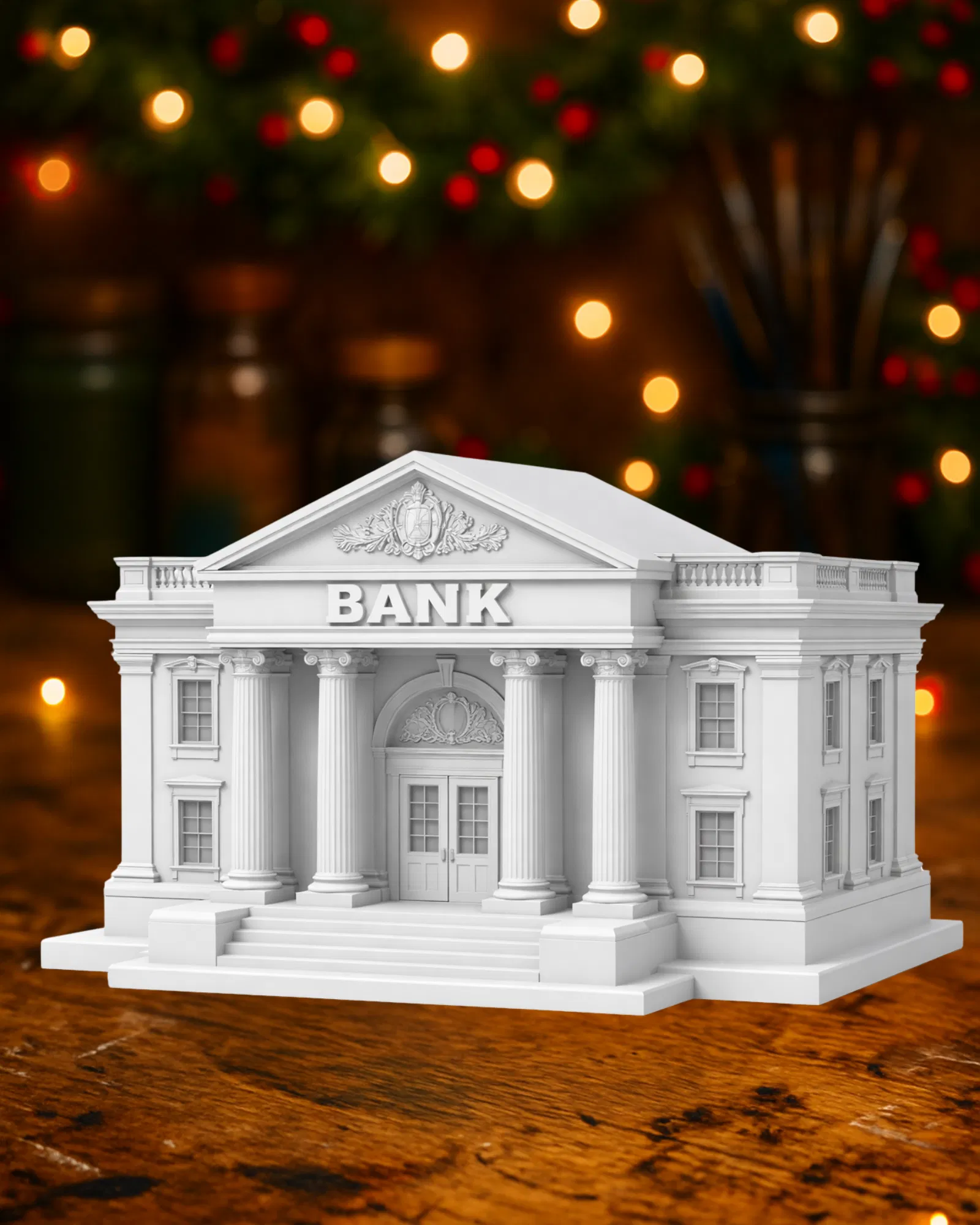 Mô hình 3D tòa nhà ngân hàng tân cổ điển được làm chi tiết, nổi bật với hàng cột và sảnh vào lớn. Phù hợp in 3D làm decor, mô hình thu nhỏ, diorama hoặc dựng cảnh kiến trúc đô thị.