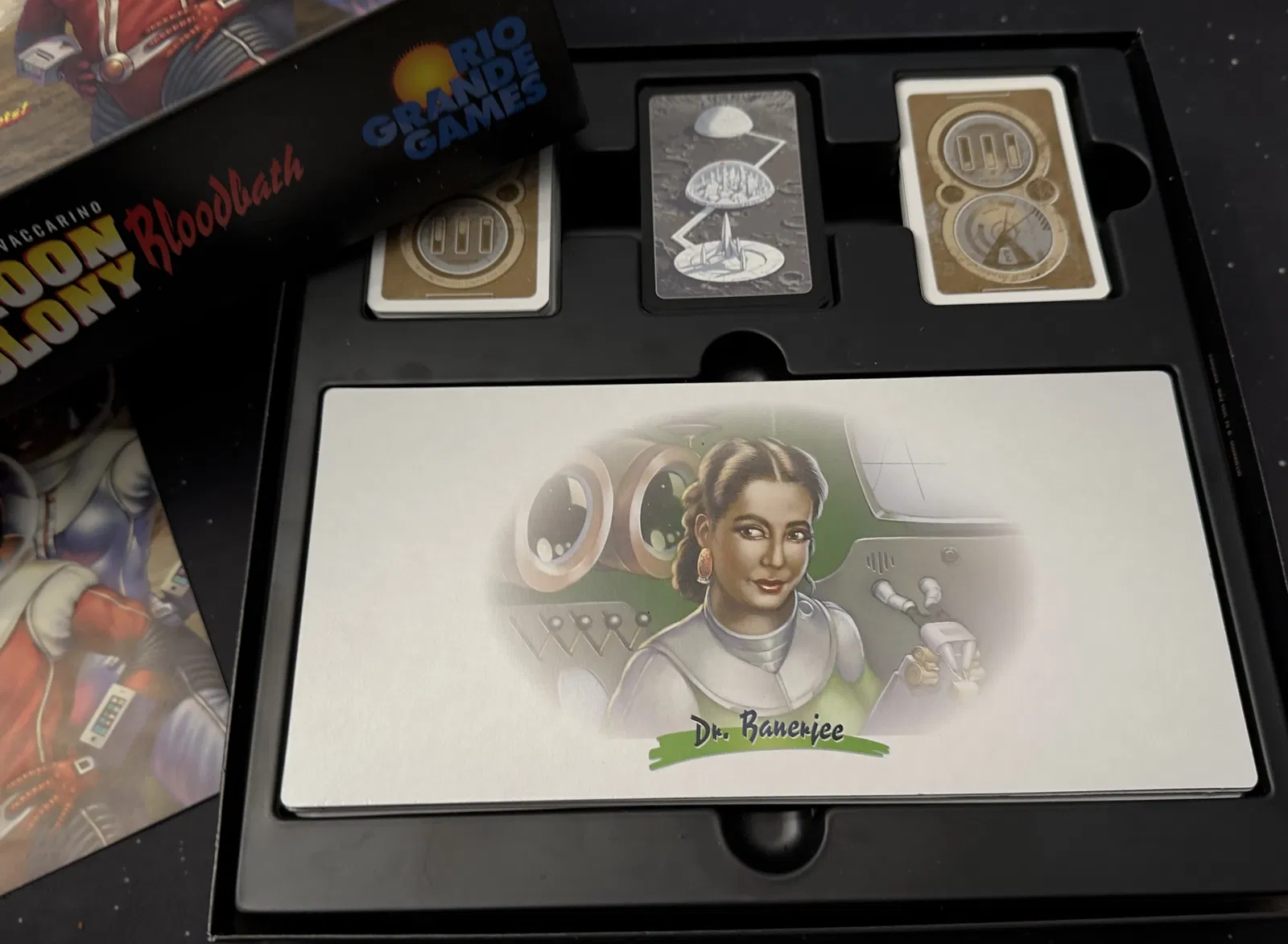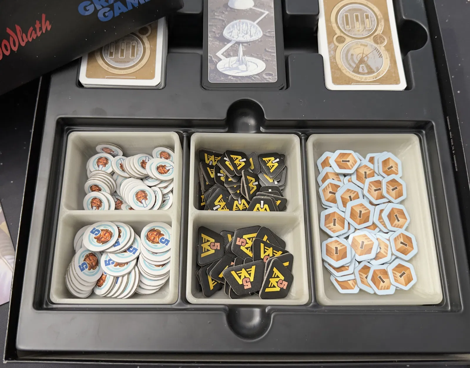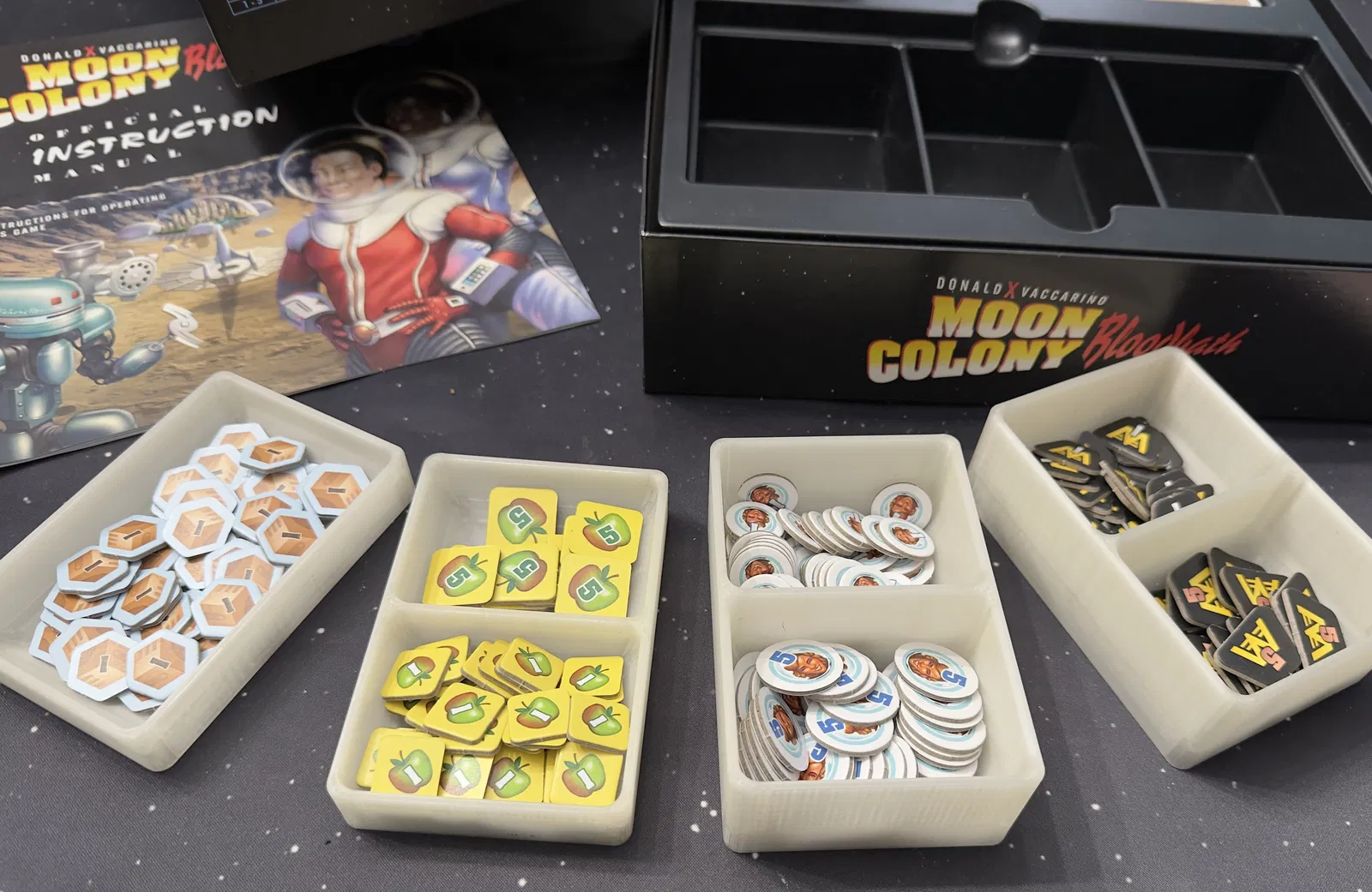 Bộ khay organizer gồm 2 khay thấp và 2 khay cao để sắp xếp token cho Moon Colony Bloodbath (Rio Grande Games), vừa 3 khoảng trống dưới bảng nhân vật: Tiền, Người, Crates và Apples.
